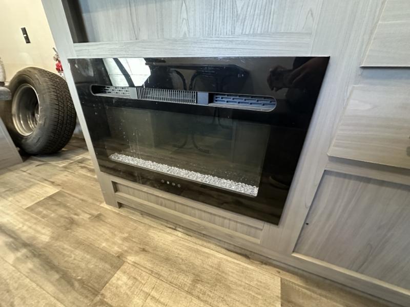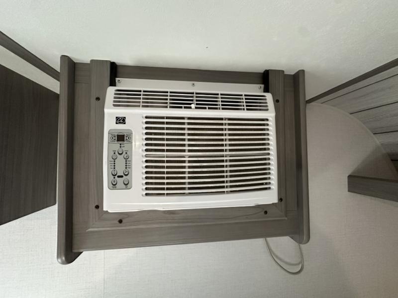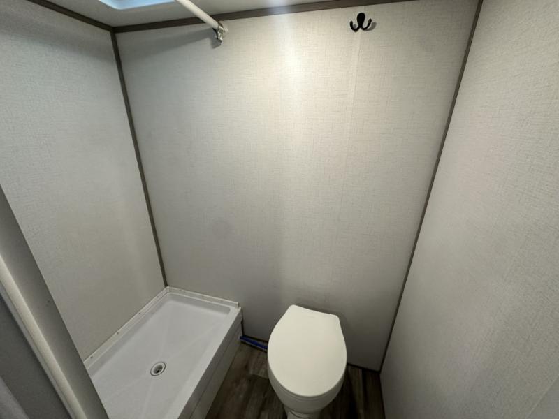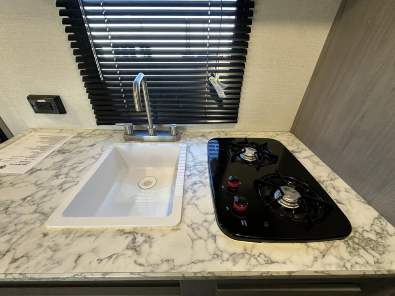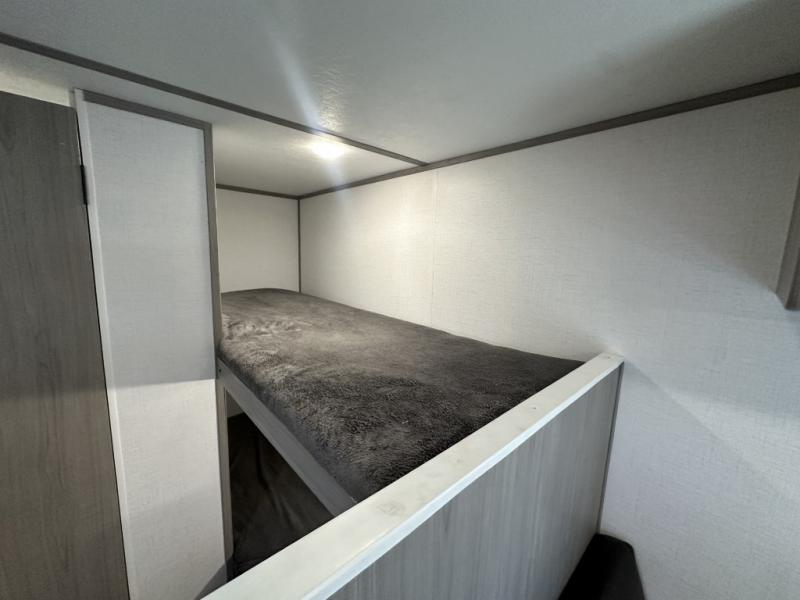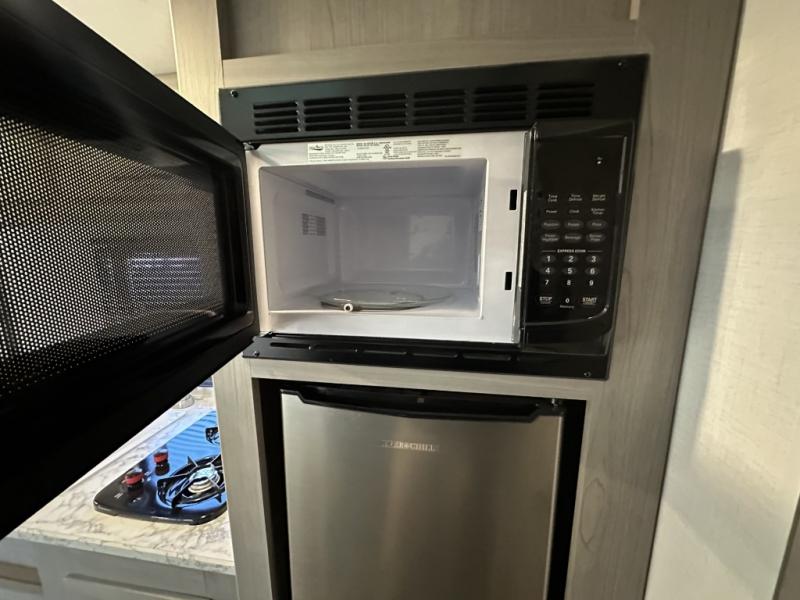 After making dinner on the two burner cooktop or inside the microwave, you can dine at the booth dinette or outside under the 8' power awning if you brought along your camping chairs. Either way you will be comfortable and the dinette may even sleep one person if needed. After playing outdoors all day, everyone can return to get cleaned up in the private toilet and shower room then fall asleep on the queen bed up front or the bunk beds in the rear. And everyone can wake up the next morning to do it over again.