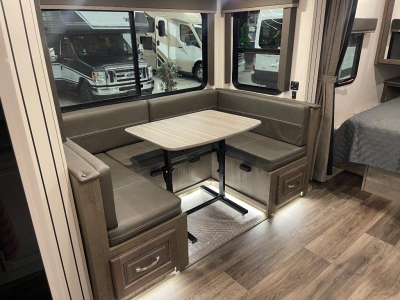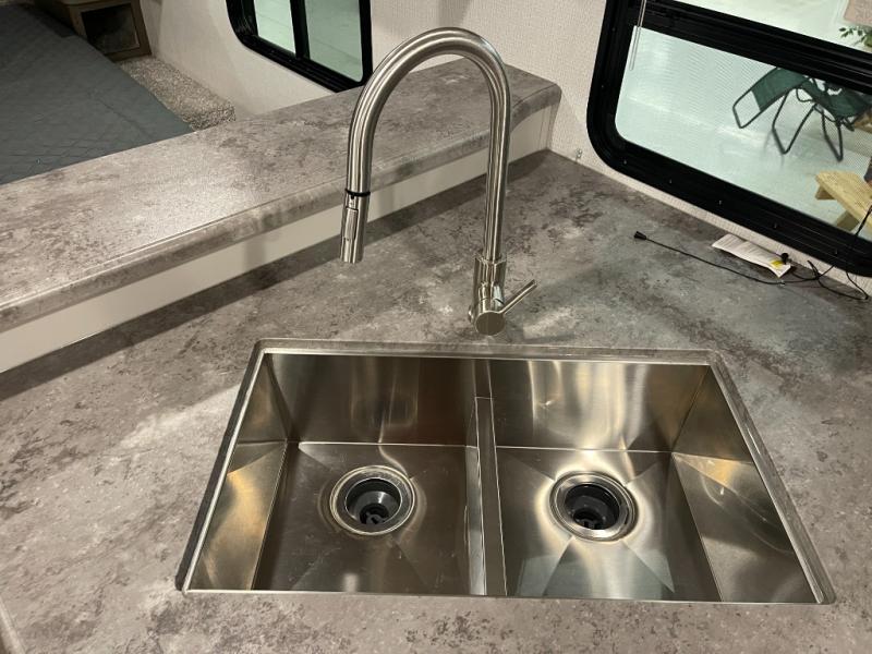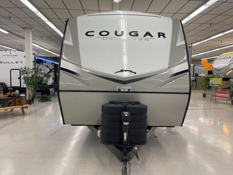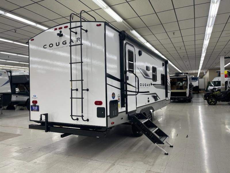 Imagine waking up from your own king bed to enjoy a hike, a bike ride, or a relaxing time outside under the 16' power awning while you wait for your spouse to wake up. With this Cougar Half-Ton travel trailer, you can make breakfast inside with full amenities and eat at the U-shaped dinette while looking out at the views. You will be able to get cleaned up in the full bathroom without having to wait your turn for the public facilities. The front bedroom includes a king bed with dual wardrobes and nightstands, and there is a bar top in the kitchen for a little more counter space!