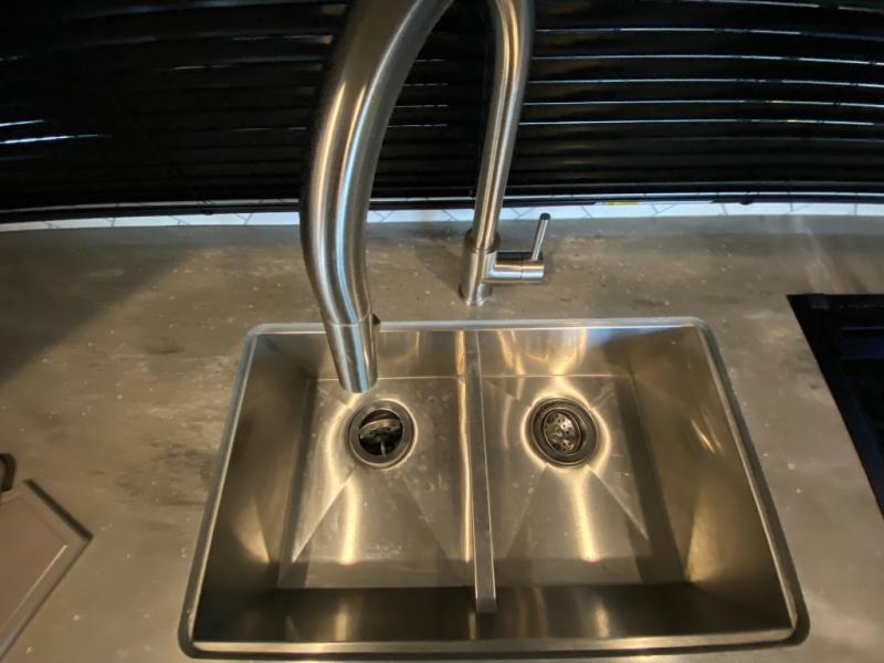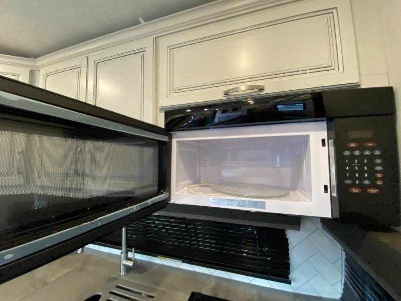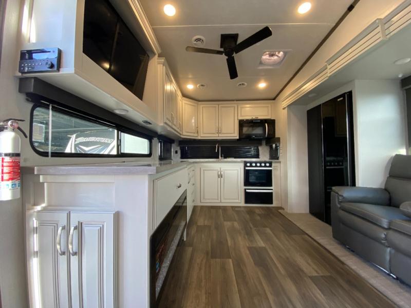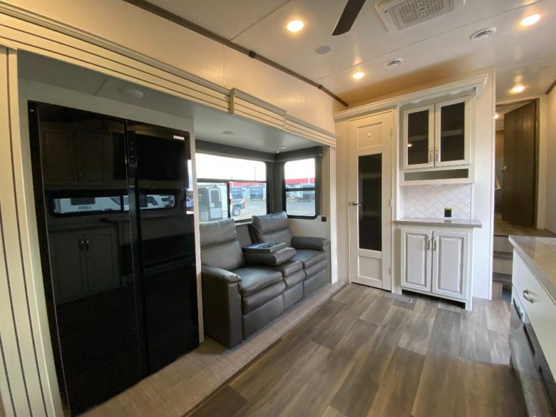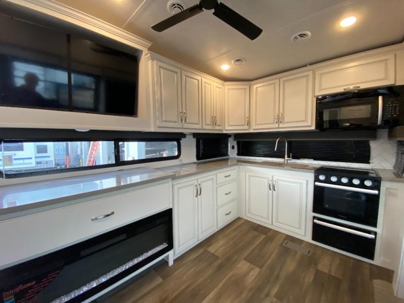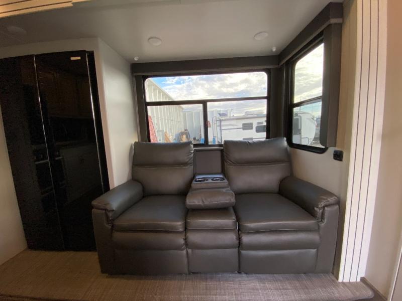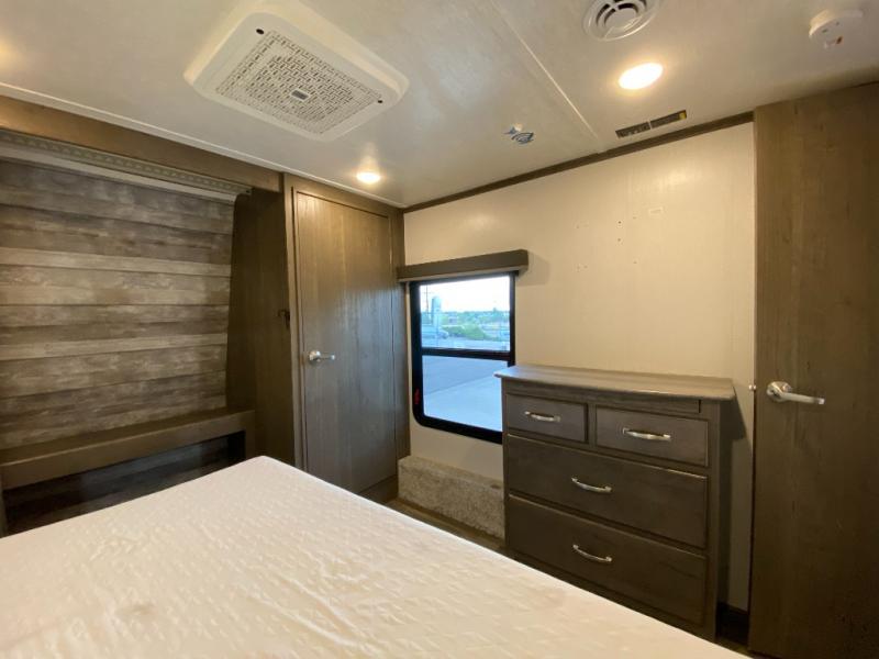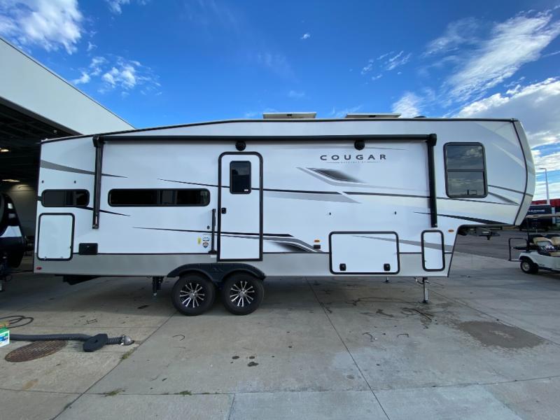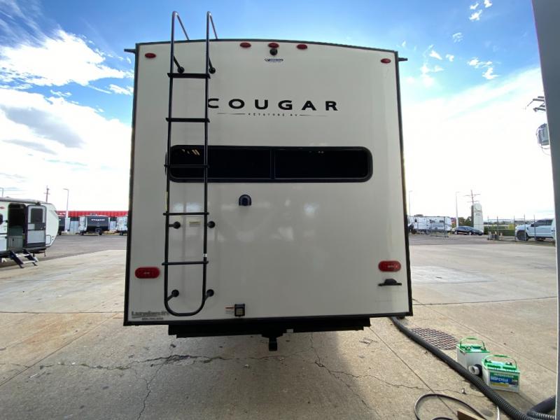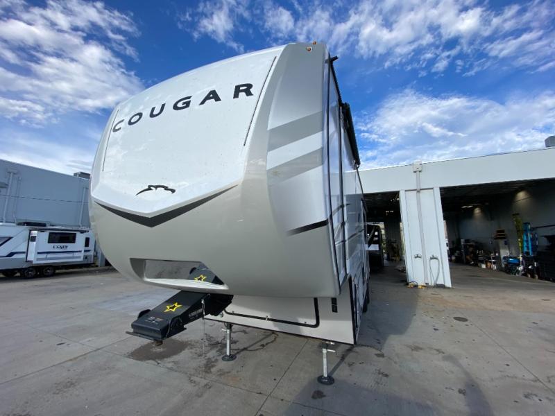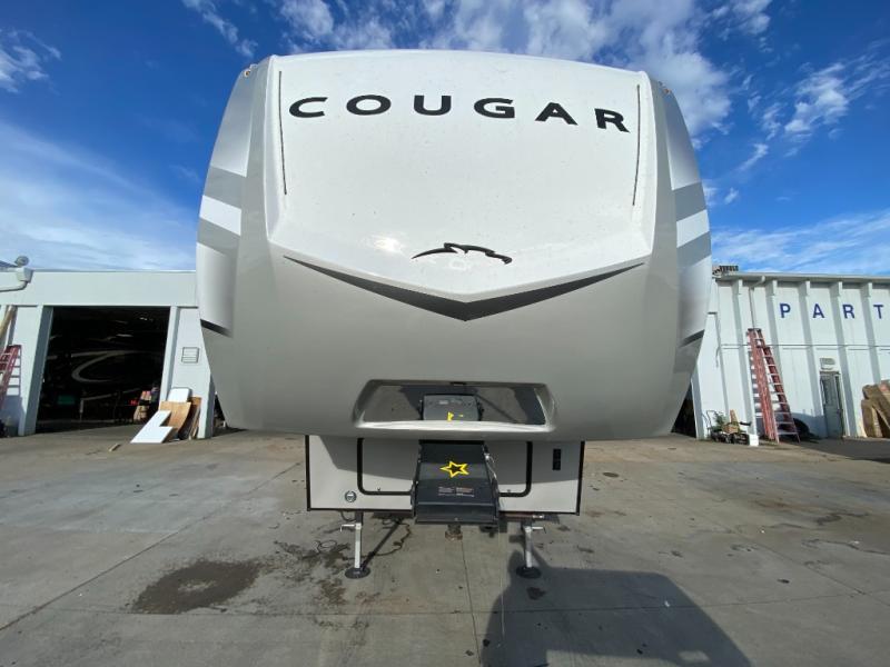 This fifth wheel is packed with premium features you won't want to camp without. You'll feel at home in the front private bedroom with its queen bed slide out with storage underneath, full-height wardrobe, plus a wardrobe with washer and dryer prep. There is even dresser with a sliding top with hidden storage for your valuables. If you have any guests, they can sleep on the tri-fold sleeper sofa within the living room slide, and there is a fireplace and LED HDTV here in perfect view for movie nights. This Cougar fifth wheel features a rear kitchen with tons of counter space, a convenient pull out trash can, and a high-rise chef's faucet and sprayer. The pull-out table in front of the fireplace will provide a place to dine at, or you can sit outdoors under the 20' power awning, and you'll also find an outside kitchen here the chef of your group is sure to love!