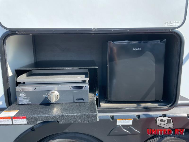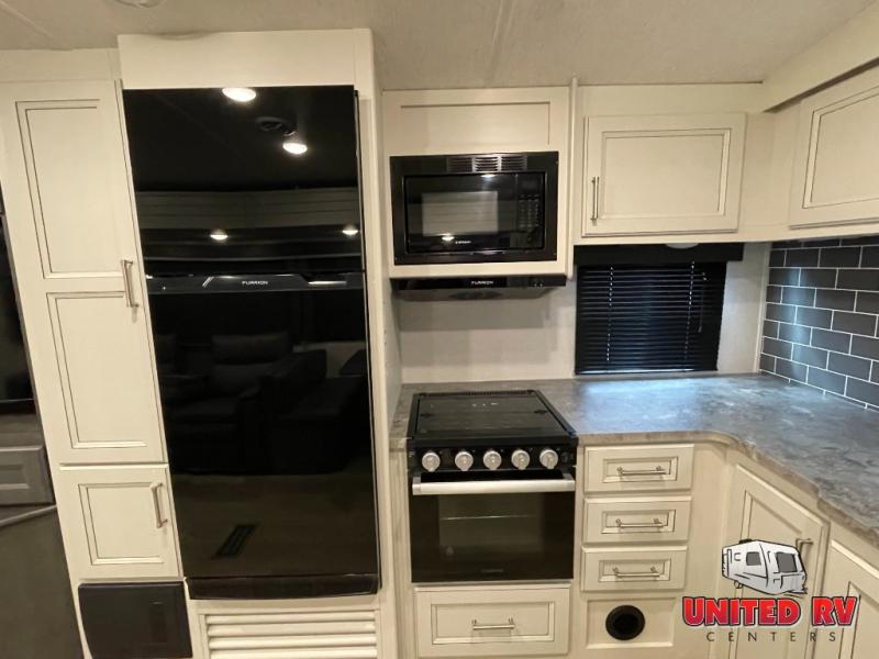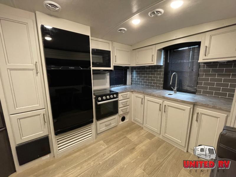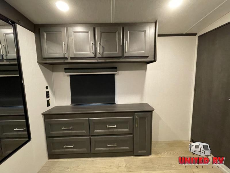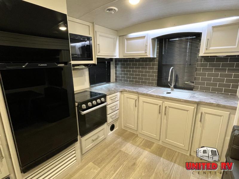 How does a queen bed slide with an optional king bed in the master suite sound? With this Cougar Half-Ton travel trailer, you'll have extra floor space and a full-width wardrobe allowing you to stay at your favorite campsite for long periods of time. The second slide located in the main living and kitchen area opens up this space for you to enjoy time spent inside just as much as outdoor adventures. The furniture even doubles as sleeping space for the kids or overnight guests. The rear kitchen layout is a convenience, and you will appreciate all the counter space for preparing and serving meals. You will find hidden storage behind the entertainment center, and next to the entertainment center is a pantry where you can store your favorite snacks.