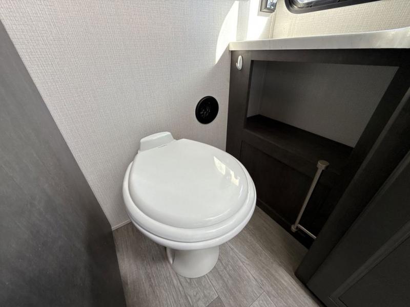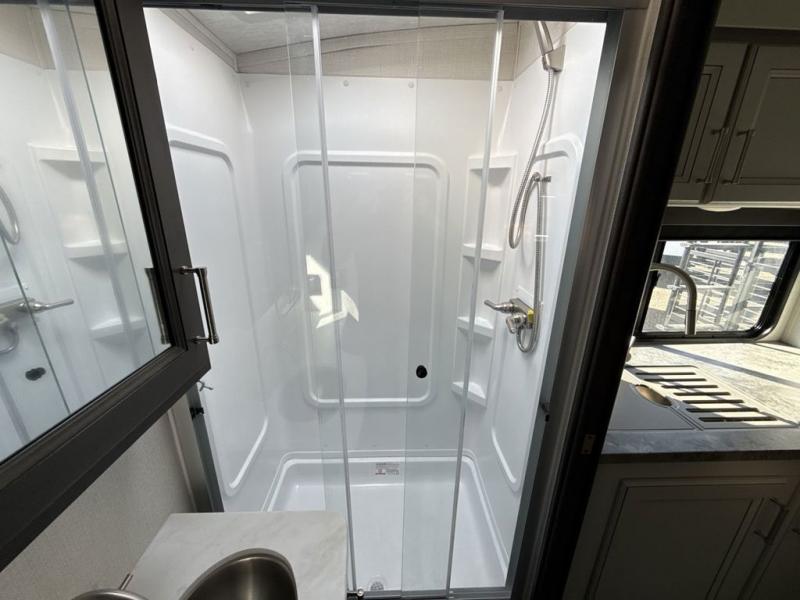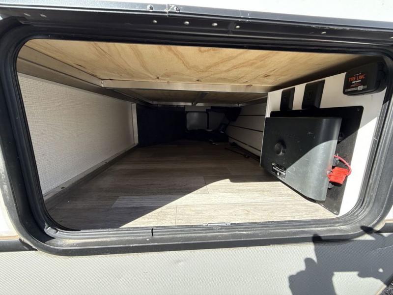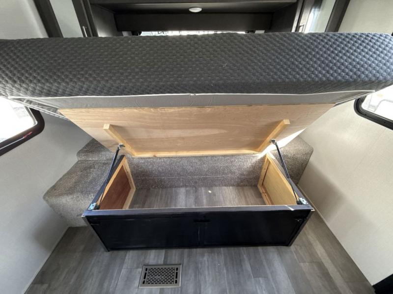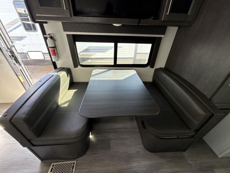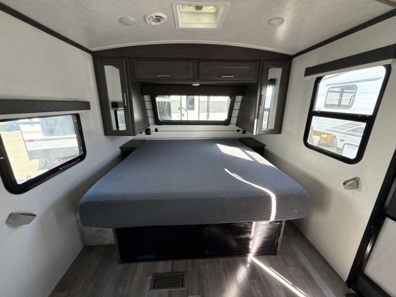 With a king-size bed, this Cougar Half-Ton travel trailer shows that you can still be comfortable even while you're away from home! The bed has wardrobes and nightstands on either side to keep your belongings tidy. There is a convenient shoe cubby right as you enter the unit to keep this space picked up as well. Right next to the booth dinette is the pantry, and next to the pantry is the full bathroom which is certainly one of the most valuable features to any trailer.