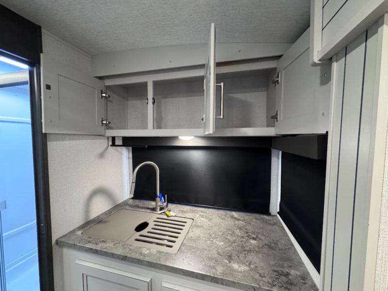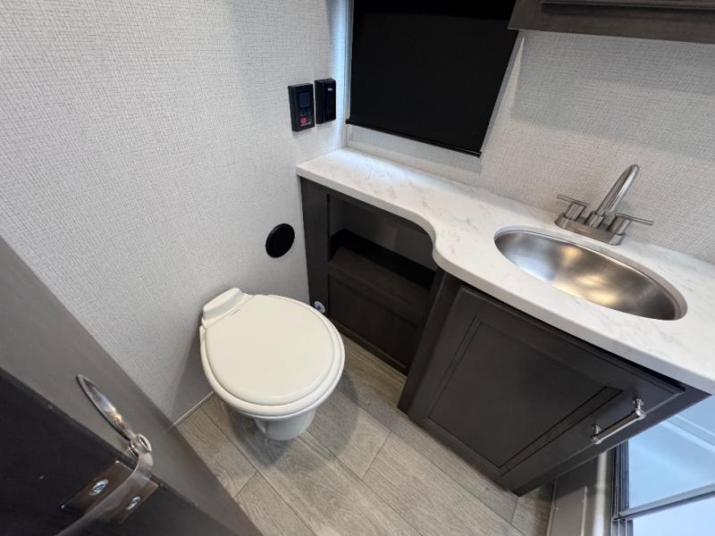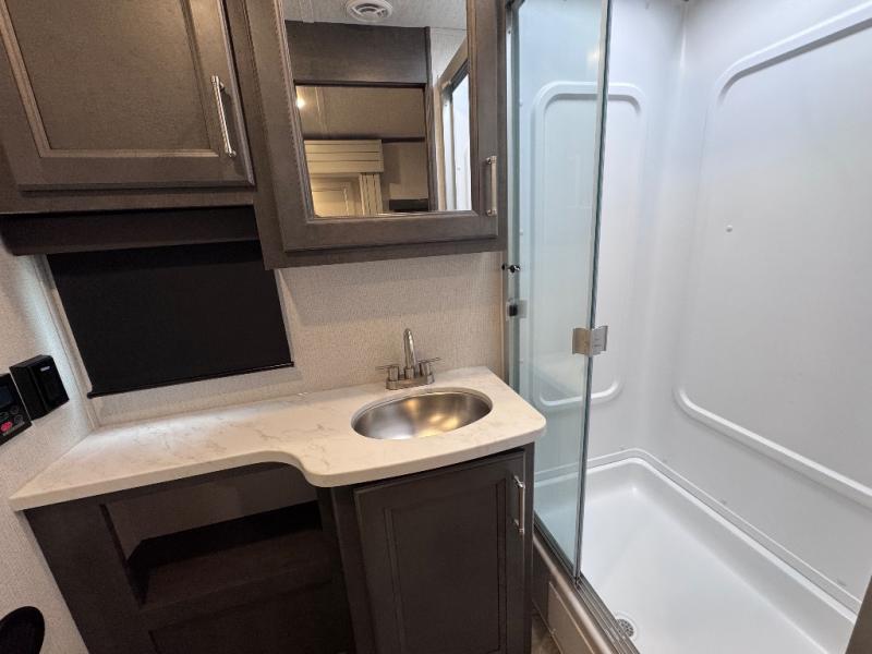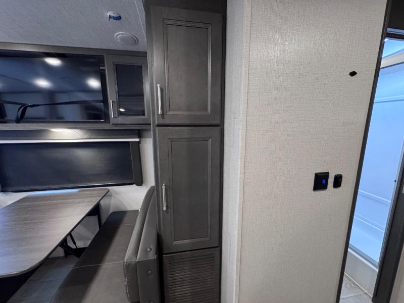 With a king-size bed, this Cougar Half-Ton travel trailer shows that you can still be comfortable even while you're away from home! The bed has wardrobes and nightstands on either side to keep your belongings tidy. There is a convenient shoe cubby right as you enter the unit to keep this space picked up as well. Right next to the booth dinette is the pantry, and next to the pantry is the full bathroom which is certainly one of the most valuable features to any trailer.