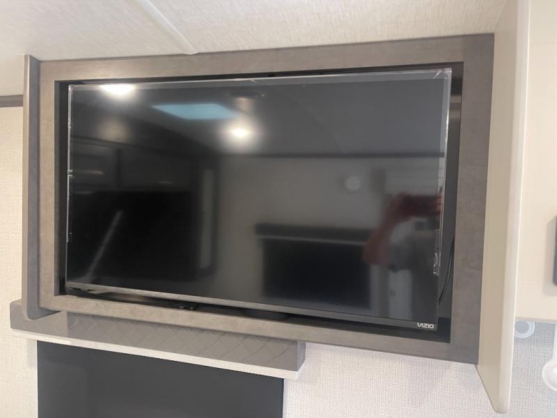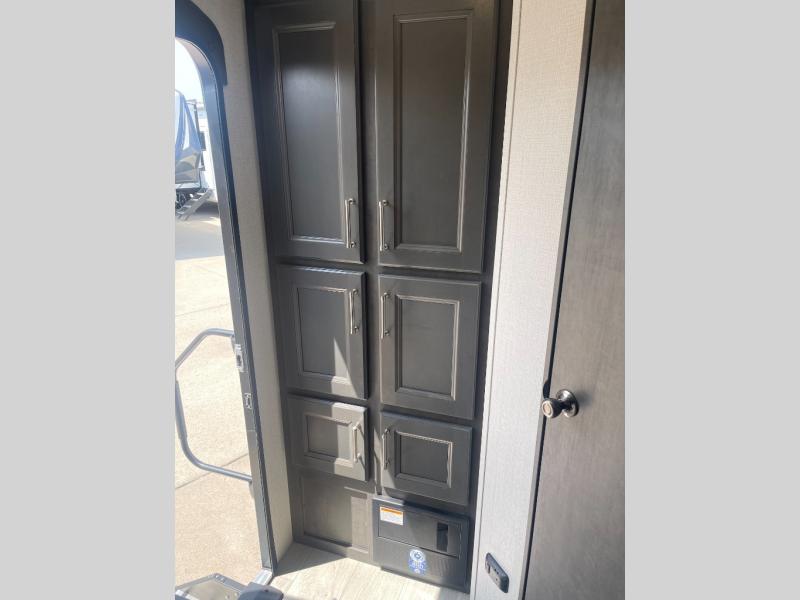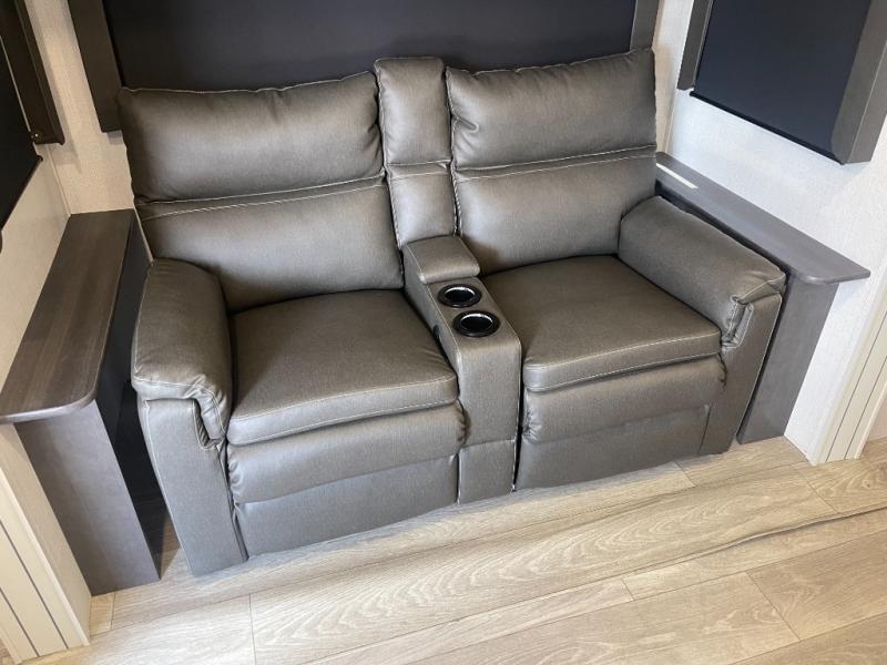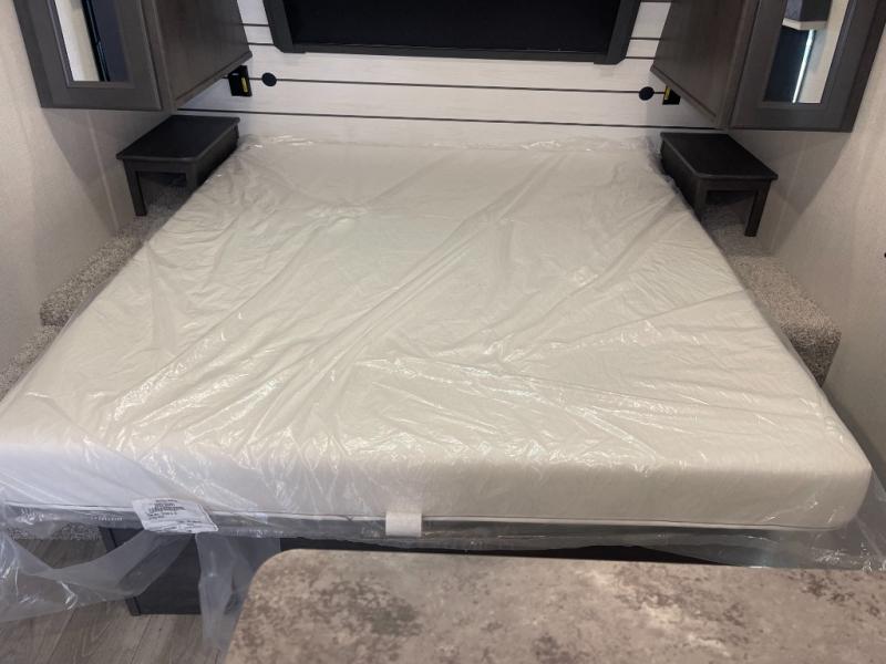 Imagine waking up from your own king bed to enjoy a hike, a bike ride, or a relaxing time outside under the 16' power awning while you wait for your spouse to wake up. With this Cougar Half-Ton travel trailer, you can make breakfast inside with full amenities and eat at the U-shaped dinette while looking out at the views. There is even a bar top where you can set out more snacks and have more prep space. The front bedroom includes a king bed, dual wardrobes and dual nightstands, plus a TV for movie night.