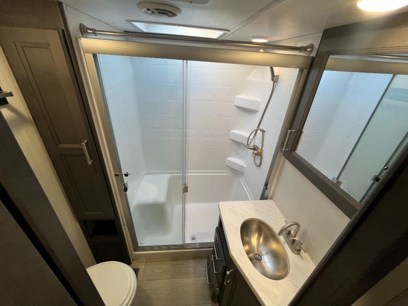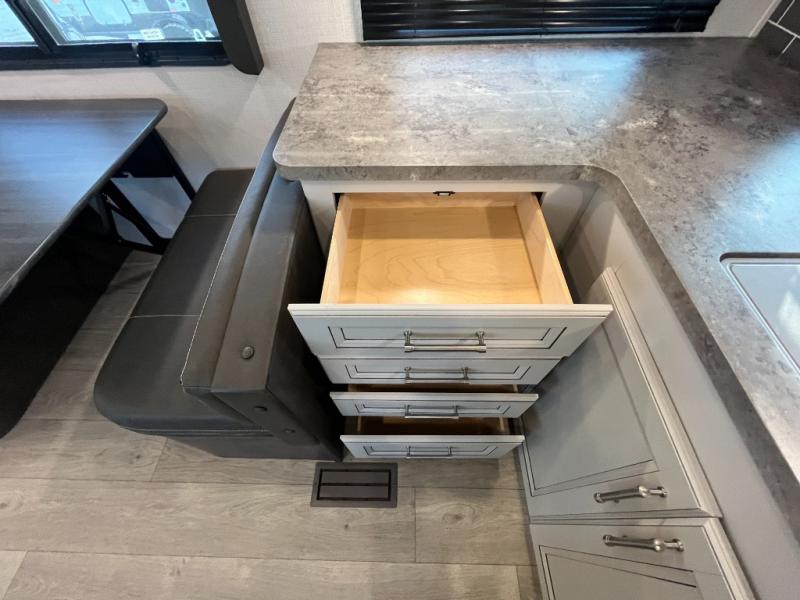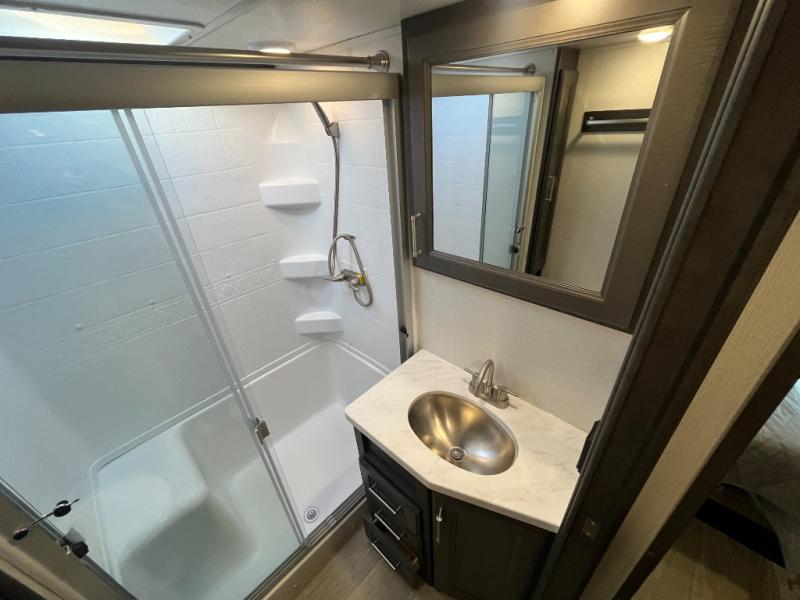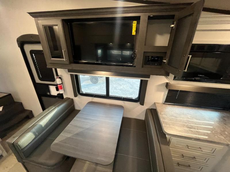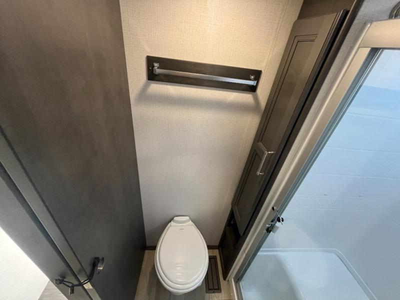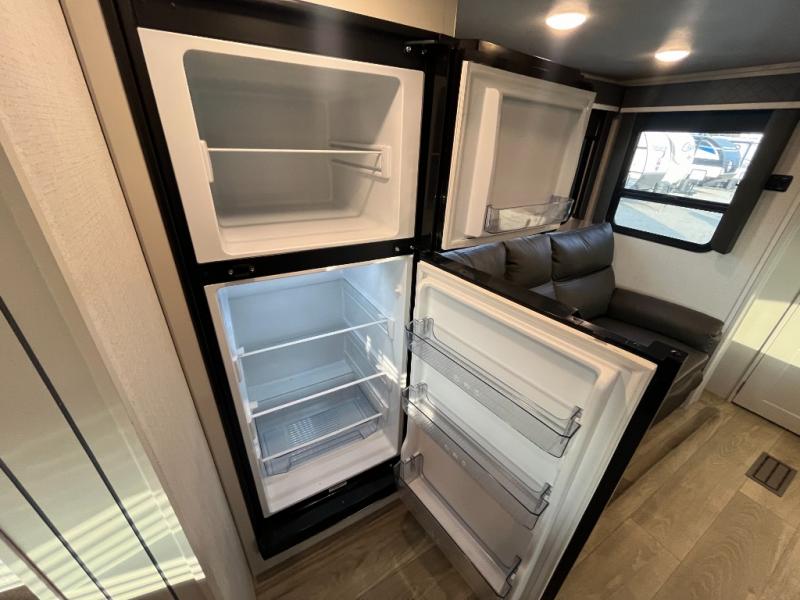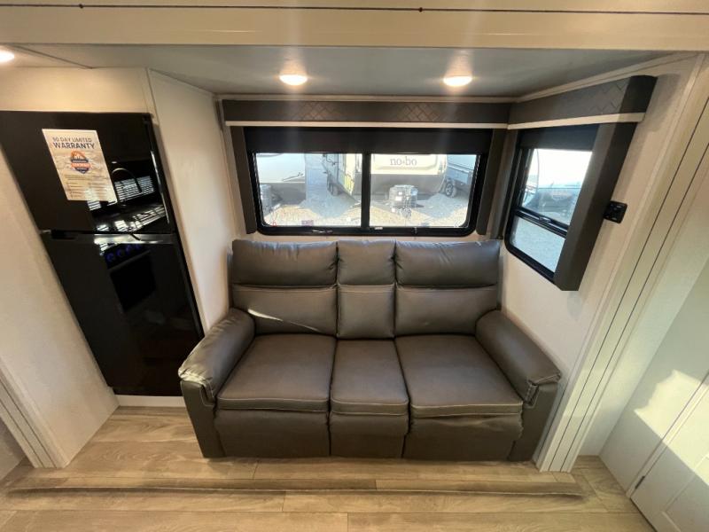 If you are looking for a fifth wheel that sleeps four to six with inside and outside cooking then check this unit out! This unit offers a short, mid-living layout with a bedroom wardrobe slide and combined 12 volt refrigerator and 68" tri-fold sofa sleeper slide for added floorspace to move about. Up front, you will enjoy a private bedroom with a queen bed and bedside wardrobe/nightstands as well as a larger wardrobe that slides out along the curbside wall. A complete bath provides a large shower, toilet and sink, plus linen storage which you are sure to appreciate as you travel. There are plenty of options for this unit making it easy to customize to your use and style. The theater seating and free standing dinette options can be selected in place of the sleeper sofa and booth dinette if you prefer. If you enjoy spending time outdoors, imagine making breakfast for your friends and family using the outside griddle. There is also a 16' awning to create even more living space to enjoy, and the unobstructed pass-through storage compartment can easily house all of your outdoor camping gear like lawn chairs and yard games.