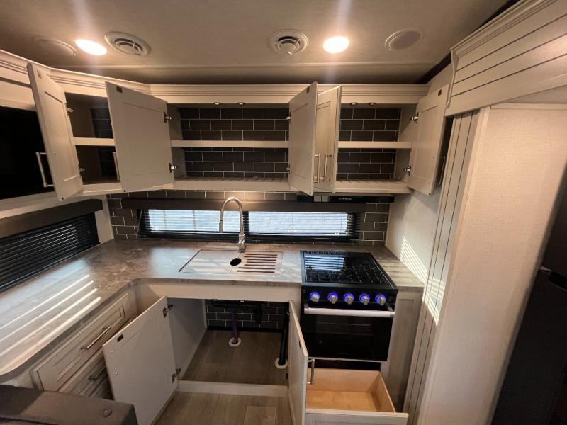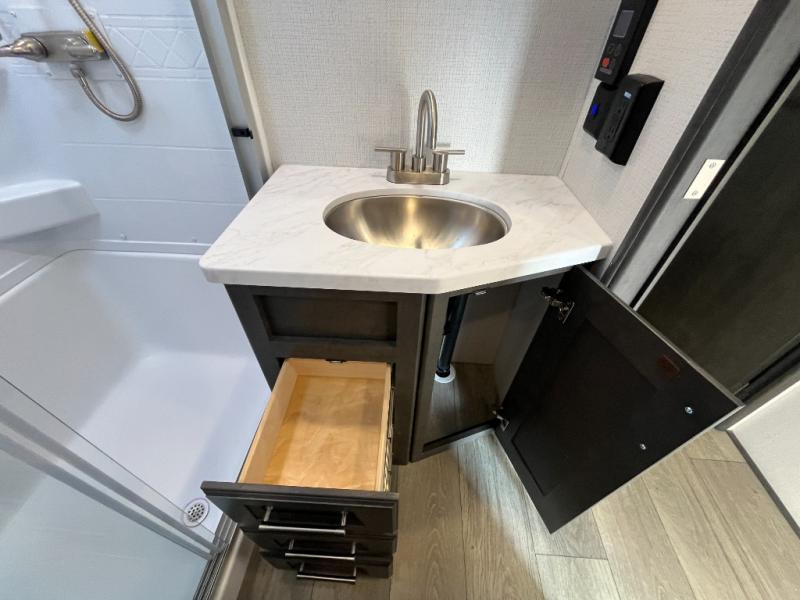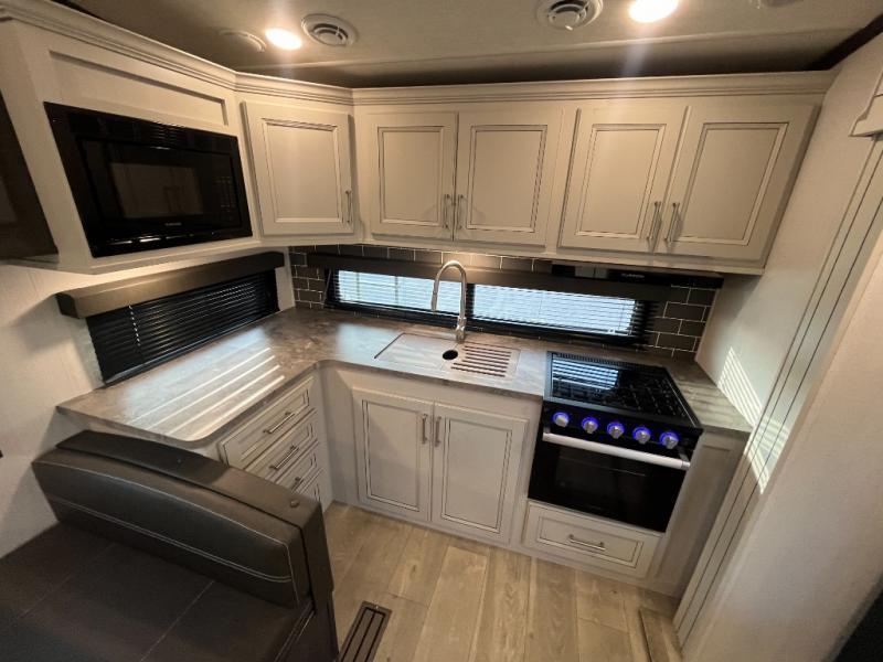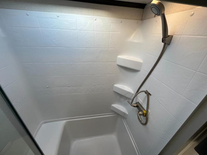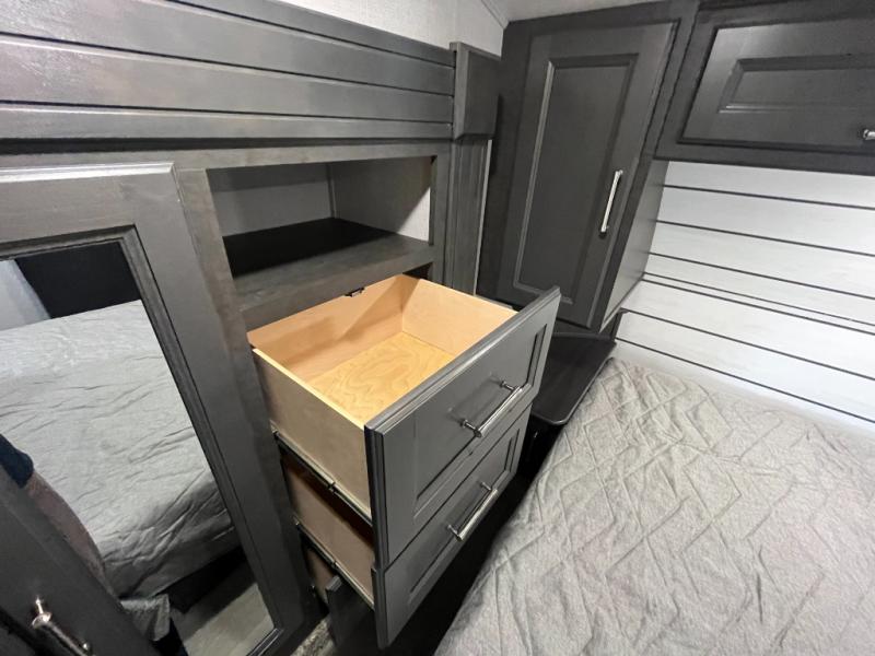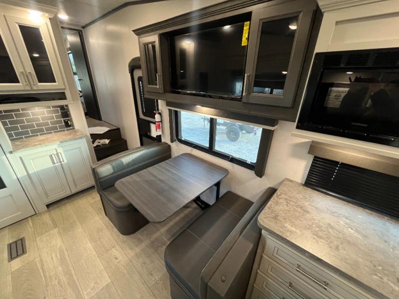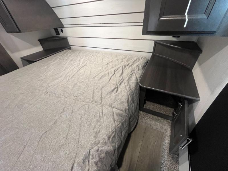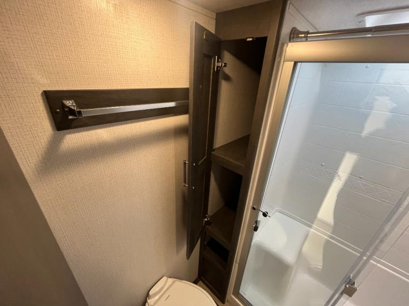 If you are looking for a fifth wheel that sleeps four to six with inside and outside cooking then check this unit out! This unit offers a short, mid-living layout with a bedroom wardrobe slide and combined 12 volt refrigerator and 68" tri-fold sofa sleeper slide for added floorspace to move about. Up front, you will enjoy a private bedroom with a queen bed and bedside wardrobe/nightstands as well as a larger wardrobe that slides out along the curbside wall. A complete bath provides a large shower, toilet and sink, plus linen storage which you are sure to appreciate as you travel. There are plenty of options for this unit making it easy to customize to your use and style. The theater seating and free standing dinette options can be selected in place of the sleeper sofa and booth dinette if you prefer. If you enjoy spending time outdoors, imagine making breakfast for your friends and family using the outside griddle. There is also a 16' awning to create even more living space to enjoy, and the unobstructed pass-through storage compartment can easily house all of your outdoor camping gear like lawn chairs and yard games.