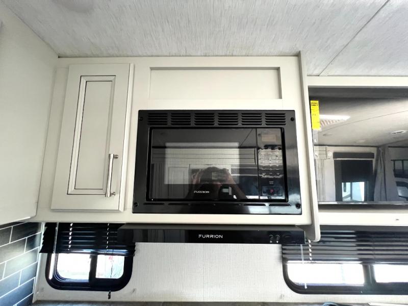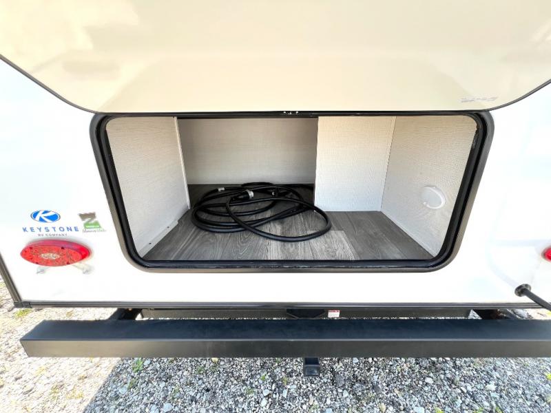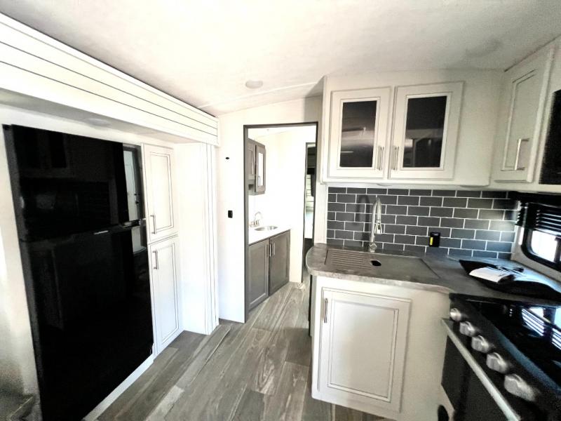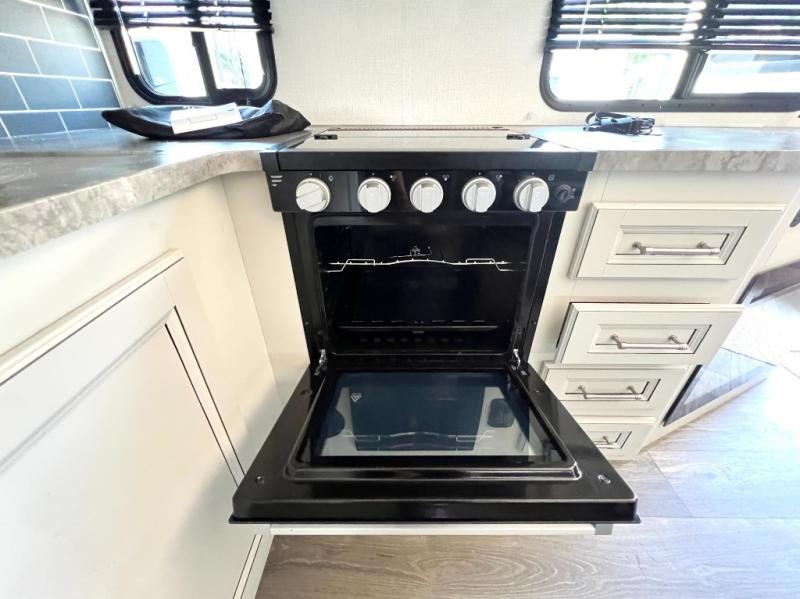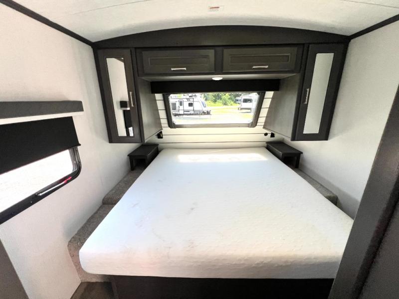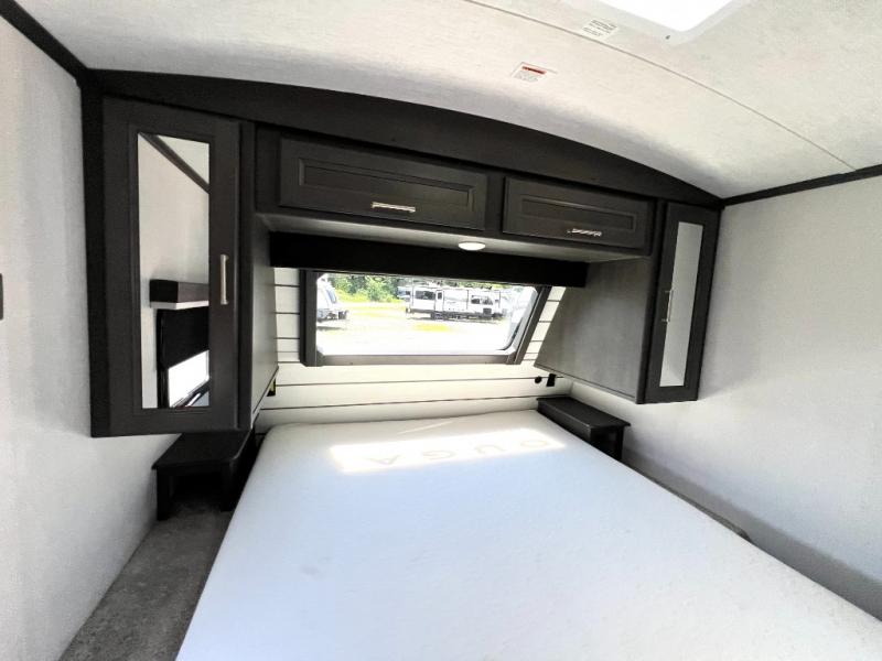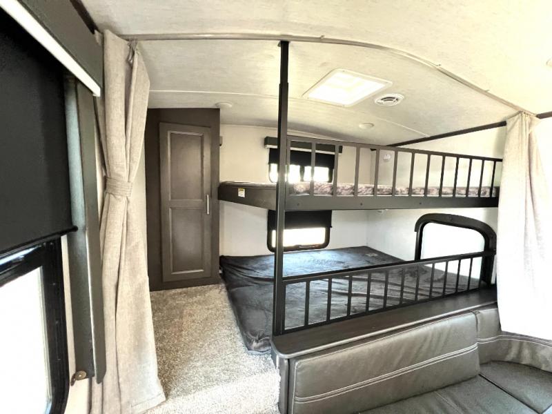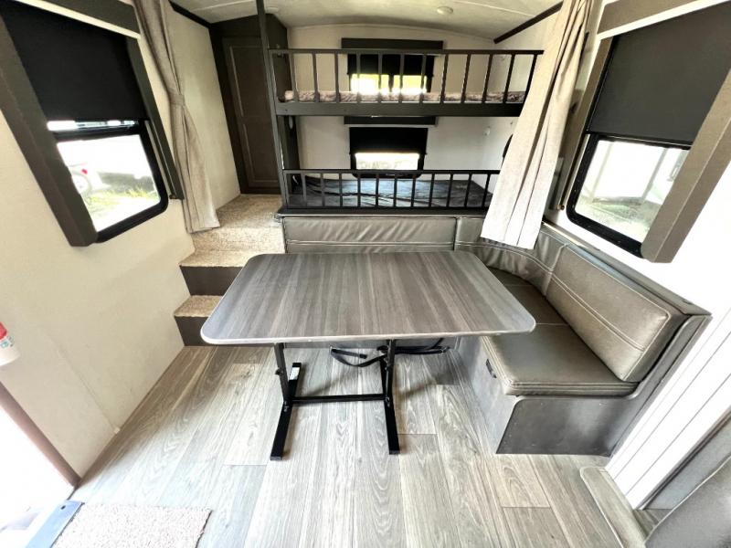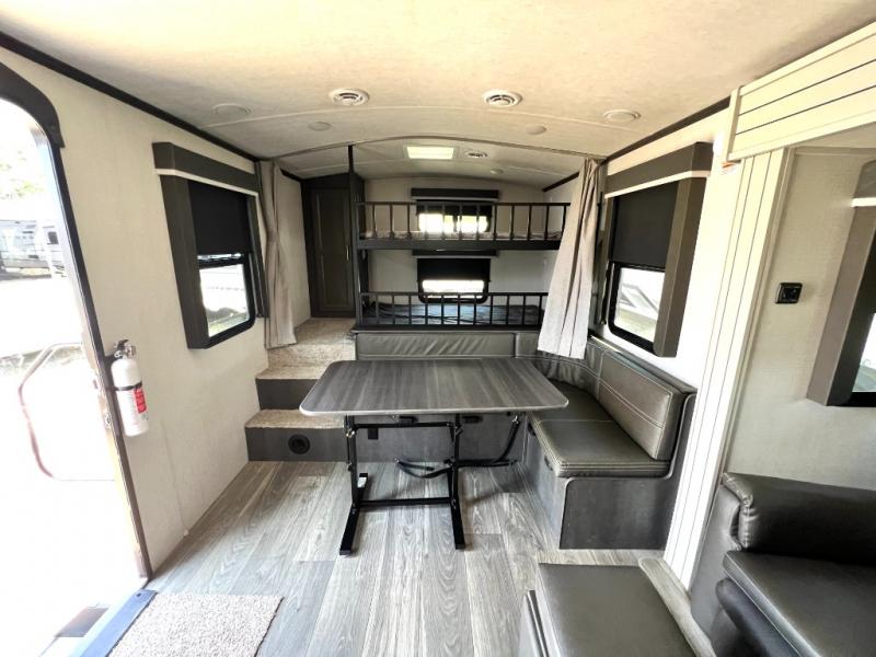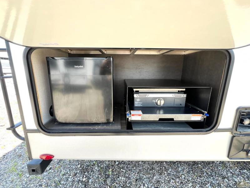 You're going to love camping with friends or family in this spacious travel trailer. There are double-size bunks in the back, and the lower bunk flips up for storage of luggage, camp gear, or toys. The group can relax in the main living area that includes a tri-fold sleeper sofa within the large slide out, plus there is an L-shaped booth dinette with an ottoman/bench seat for a unique set-up. There is even a fireplace and an LED HDTV for those rainy days you stay indoors. This model includes all the appliances indoors needed to prepare meals each day, plus there is a capital grill outdoors and an exterior mini fridge for cold drinks. And check out the 19' power awning that will shade you as you cook up lunch!