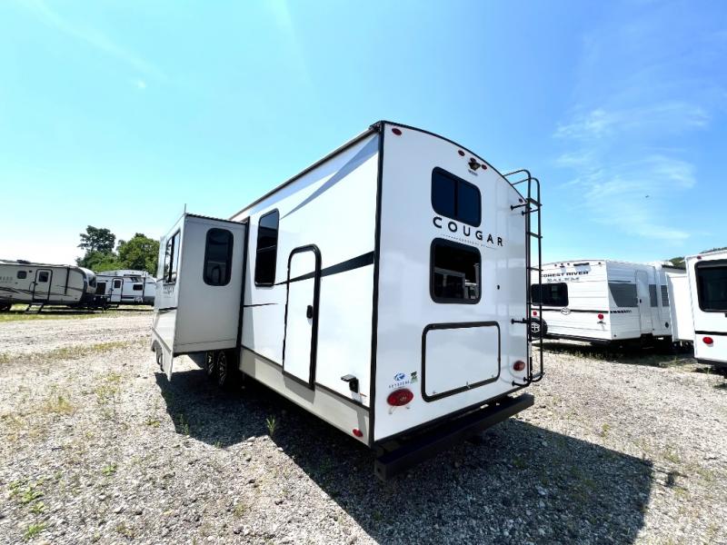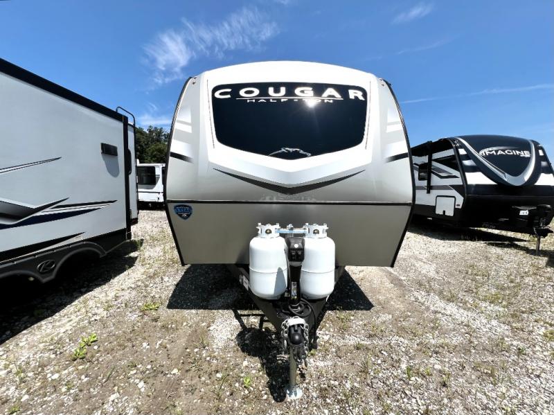 The Keystone Cougar Half-Ton fifth wheel and travel trailers are known as one of America's favorites for a reason! Some of those reasons are the exclusive features that come from Keystone, like the Winegard Air 360+ omni-directional rooftop antenna, the in-floor heating ducts, and the Hyper Deck flooring. The Cougar Half-Ton has a Climate Guard protection package to keep you safe during inclement weather, along with two roof attic vents, PEX plumbing and more. Use the 21" Furrion range with Piezo ignition to create all of those familiar meals from home, and enjoy endless hot showers with the Girard tankless on-demand water heater!