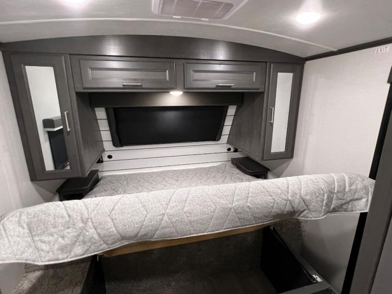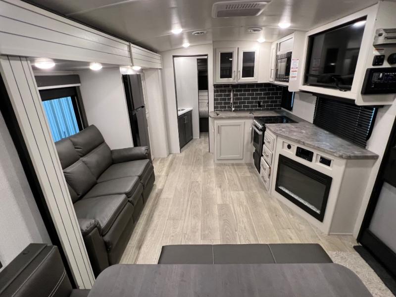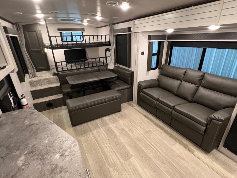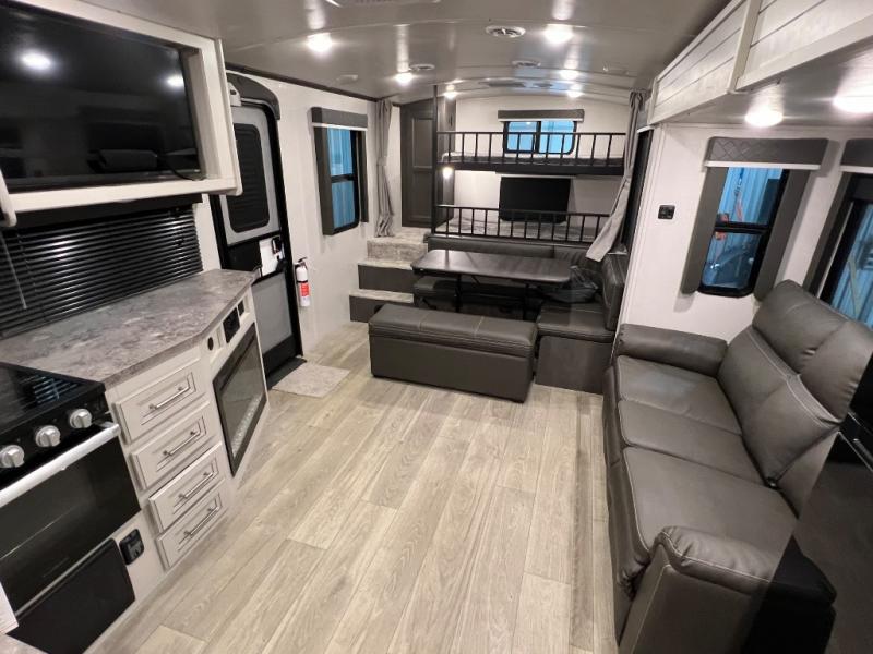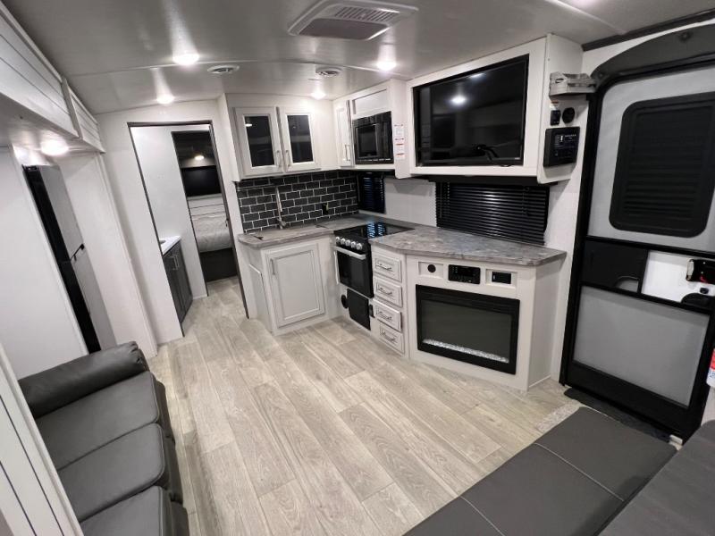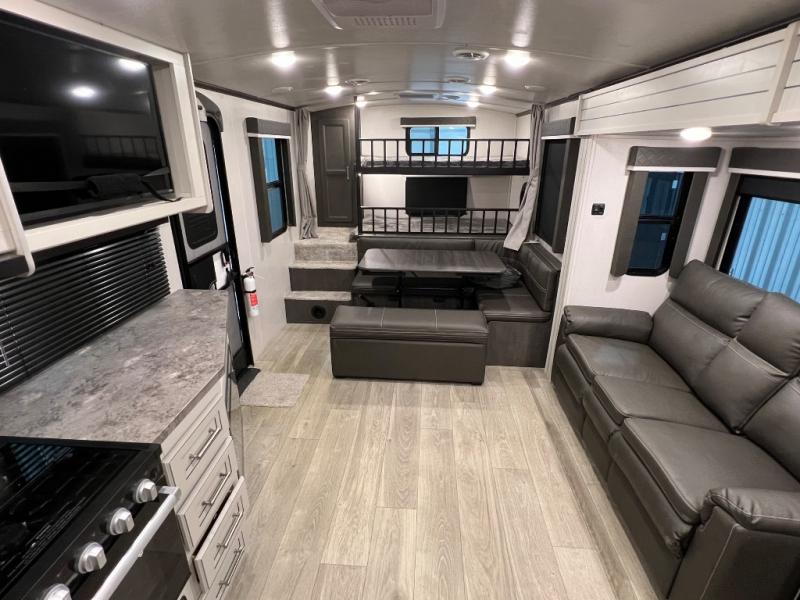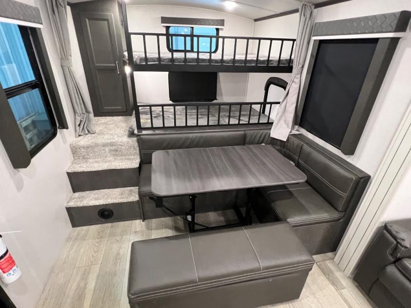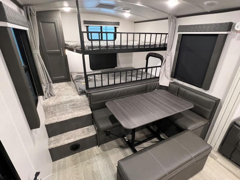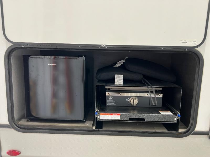 You're going to love camping with friends or family in this spacious travel trailer. There are double-size bunks in the back, and the lower bunk flips up for storage of luggage, camp gear, or toys. The group can relax in the main living area that includes a tri-fold sleeper sofa within the large slide out, plus there is an L-shaped booth dinette with an ottoman/bench seat for a unique set-up. There is even a fireplace and an LED HDTV for those rainy days you stay indoors. This model includes all the appliances indoors needed to prepare meals each day, plus there is a capital grill outdoors and an exterior mini fridge for cold drinks. And check out the 19' power awning that will shade you as you cook up lunch!