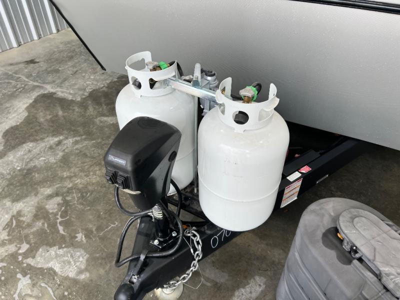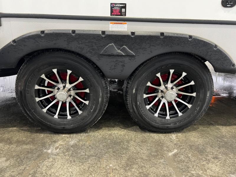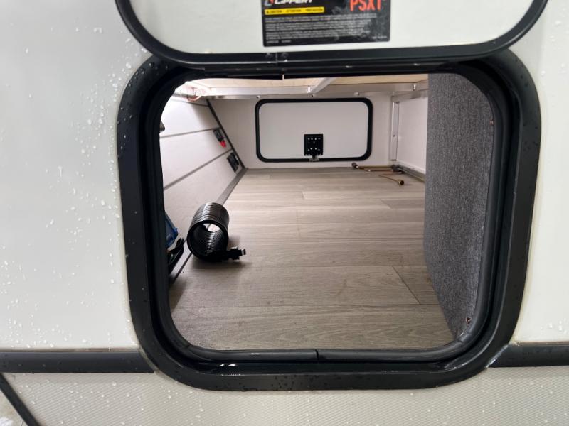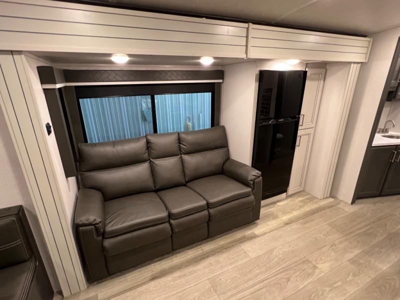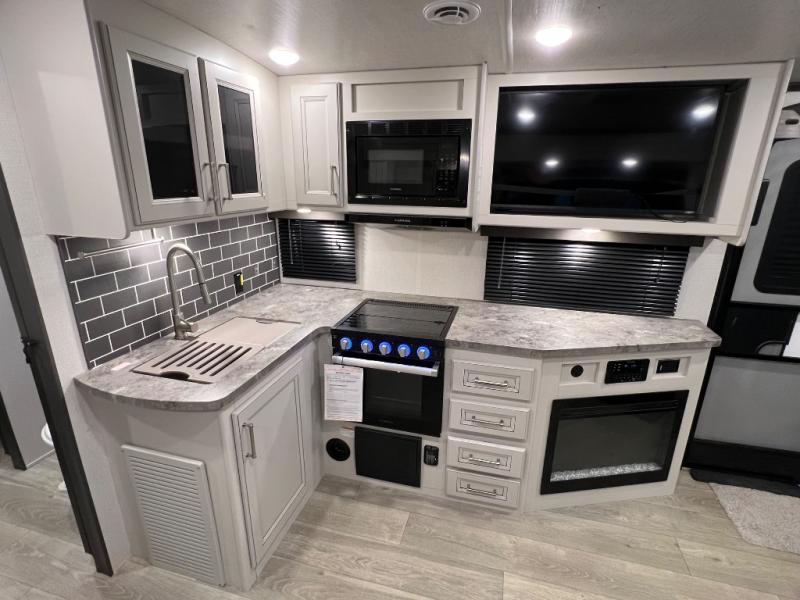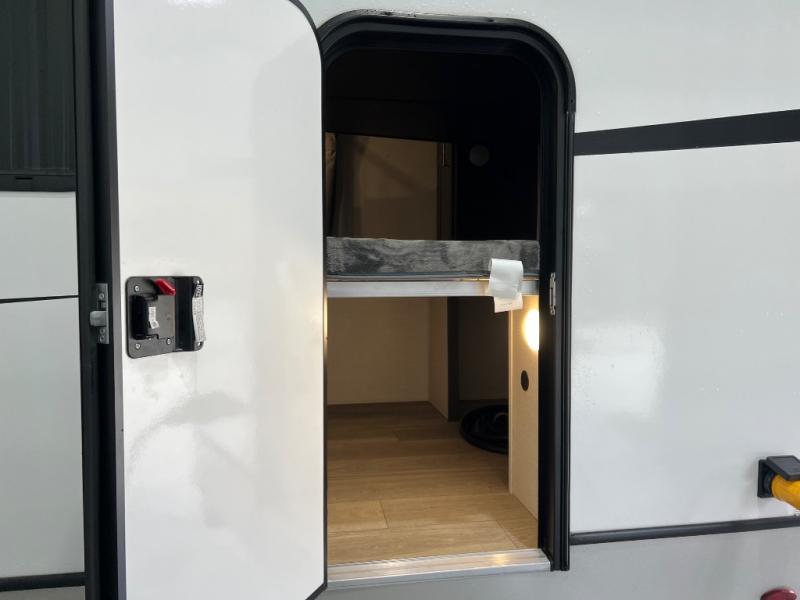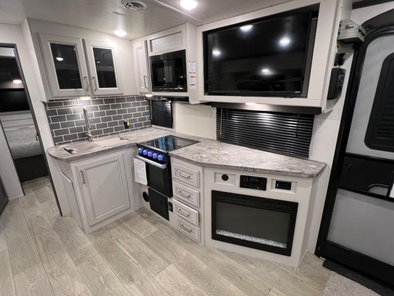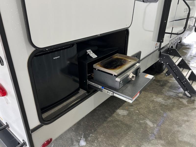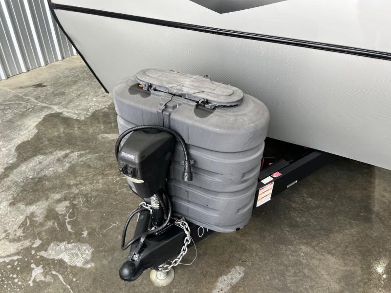 You're going to love camping with friends or family in this spacious travel trailer. There are double-size bunks in the back, and the lower bunk flips up for storage of luggage, camp gear, or toys. The group can relax in the main living area that includes a tri-fold sleeper sofa within the large slide out, plus there is an L-shaped booth dinette with an ottoman/bench seat for a unique set-up. There is even a fireplace and an LED HDTV for those rainy days you stay indoors. This model includes all the appliances indoors needed to prepare meals each day, plus there is a capital grill outdoors and an exterior mini fridge for cold drinks. And check out the 19' power awning that will shade you as you cook up lunch!