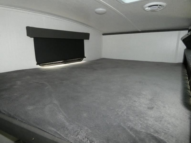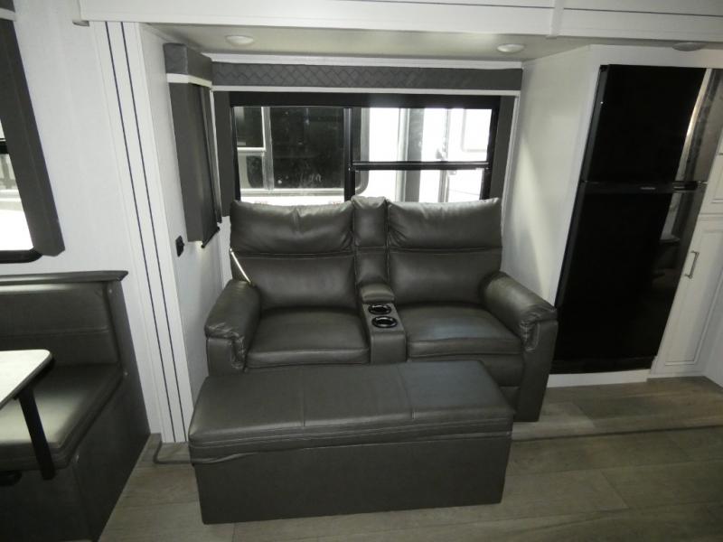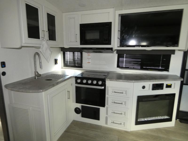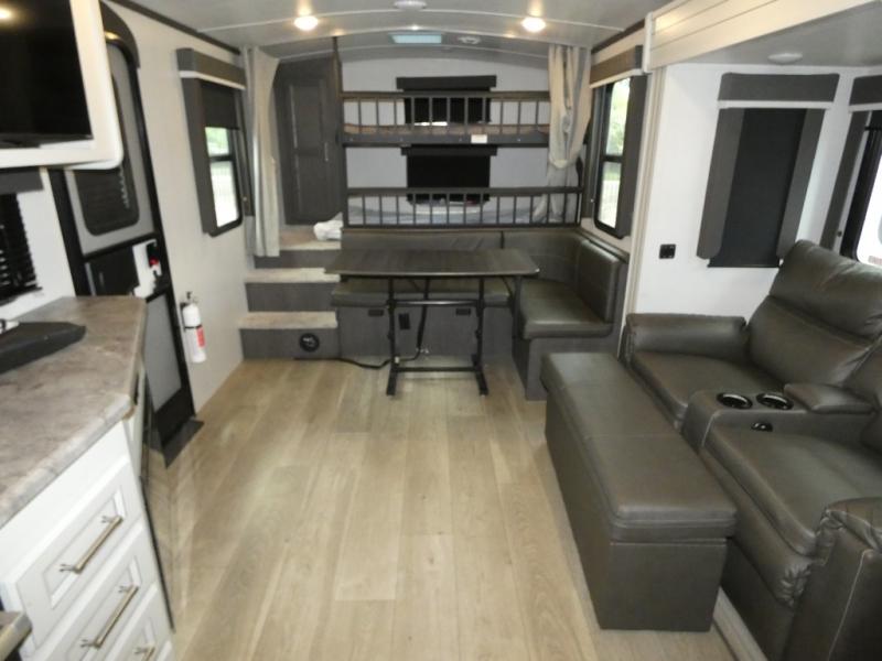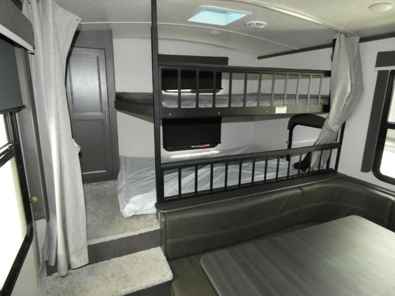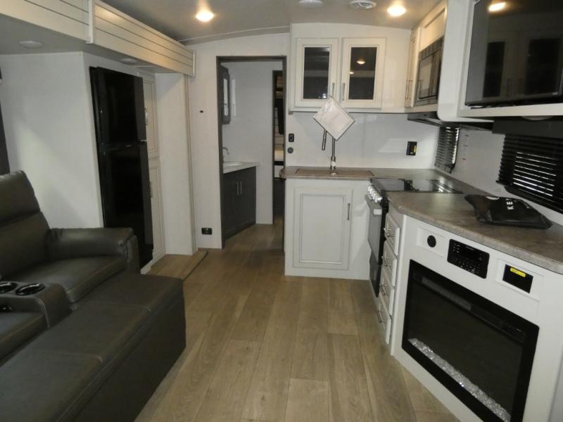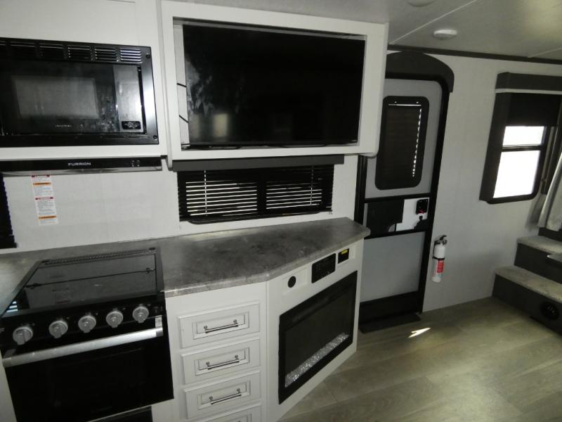 There is so much flexible space in this Cougar Half-Ton travel trailer! The rear bunkhouse has double bed bunks to sleep up to four. The lower bunk can flip up to create a storage area, and there is a cargo door here for direct access to the outdoors so you can load your bikes, toys, or gear easily. At the other end, you will love the private front bedroom with a queen bed, dual night stands, and dual wardrobes for maximum space for your clothing. A roomy pass-through compartment runs underneath this bedroom if you should need additional room for outdoor gear. The kitchen/living area is centrally located and has a fireplace with a TV above it for a cozy gathering space. A corner booth dinette has an ottoman/bench seat that can be used for seating as needed. Theater seating offers additional seating space if needed.