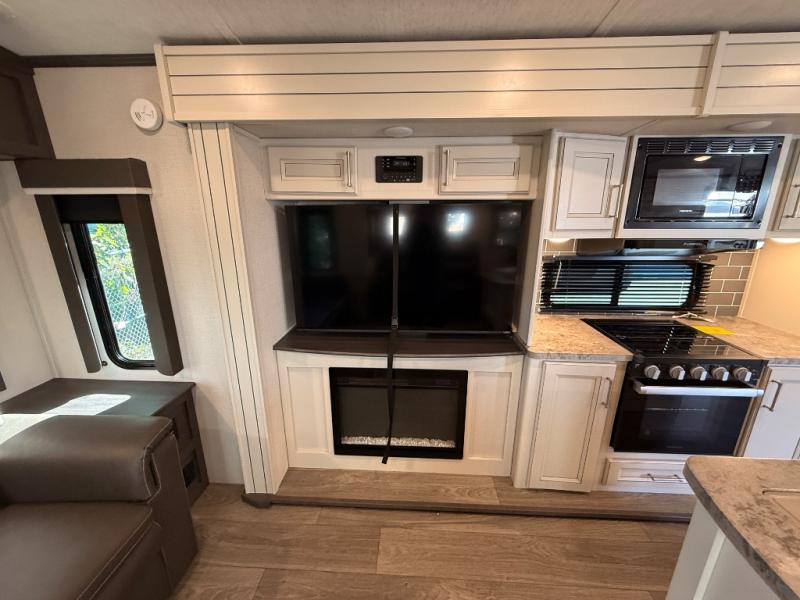 You'll definitely want to snatch up this Cougar Half-Ton travel trailer if you're a couple or small family that wants to live in comfort while at the campsite! There is a private bedroom at the front, and it has a queen bed slide or optional king bed, full-width wardrobe, and a dresser to keep your clothes tidy. Right next to the bedroom is a full bathroom that comes with a linen closet with washer and dryer prep. The main living area is what truly gives you the royal treatment because it has theater seating directly across from the entertainment center and fireplace, a kitchen island that you can gather around when it's snack time, a booth dinette that will serve as a bed or a dinner table, and a 68" tri-fold sleeper sofa with end tables for a cold drink. The kitchen also has a pantry, so you can keep your trailer stocked with goodies throughout the whole trip.