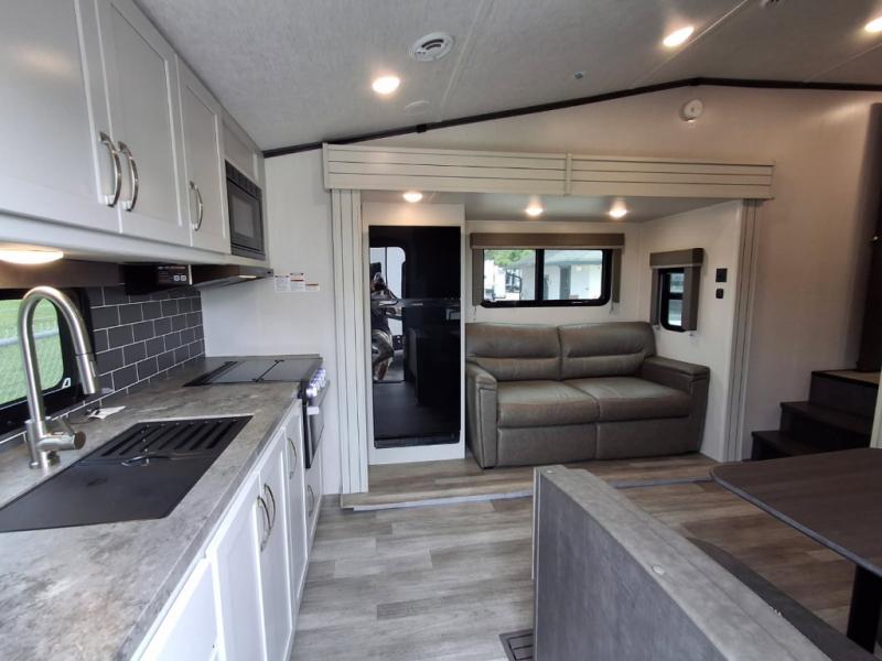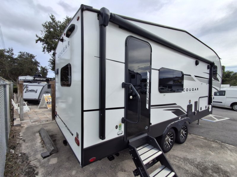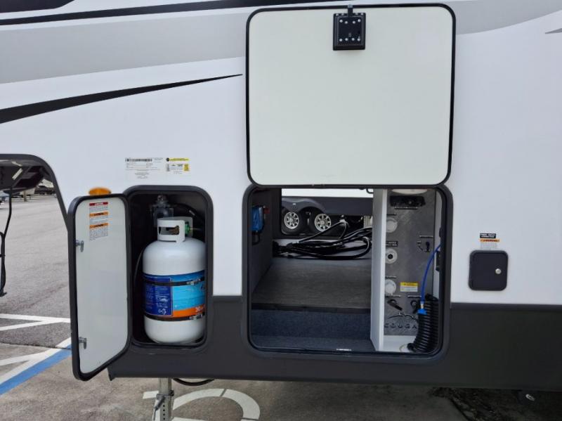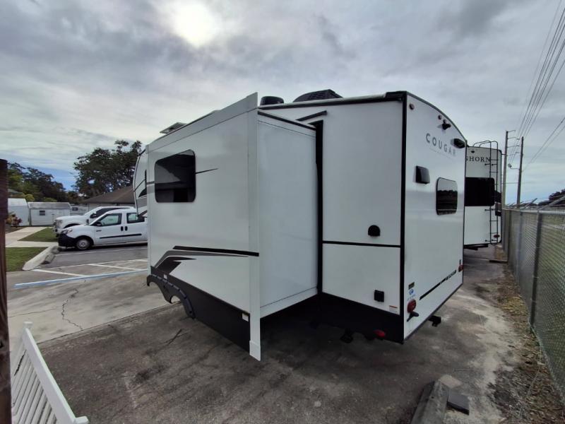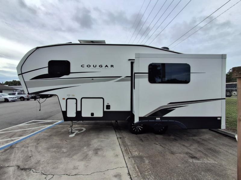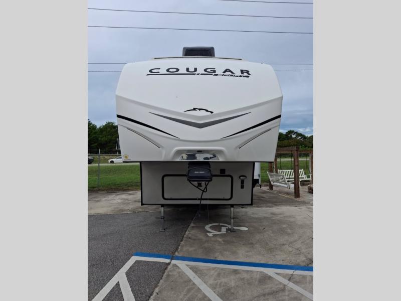 Your family of five or six will love traveling in this Cougar Sport lightweight fifth wheel! Enter to find a convenient rear kitchen layout just steps inside the door. Drop your shoes off in the shoe cubby to your right at the door, and relax on either the tri-fold sleeper sofa or at the booth dinette. The sofa and a 12 volt refrigerator are situated within the slide for added roominess. Head up the steps to a complete bath and private front bedroom featuring a queen size bed with dual shirt wardrobes and nightstands on both sides of the bed. There is also a wardrobe off the foot of the bed along the inside wall with two convenient drawers as well. The bathroom offers a shower with a skylight for added headroom and natural lighting. You will also appreciate the medicine cabinet over the sink for your personal items. Back down to the main living and kitchen area, a nice size pantry will hold all of your dry goods and snacks, and there is ample storage in the overhead cabinets above the dinette on either side of the TV, plus in the kitchen area all along the rear wall. Here you can cook your family their camp favorites using either the three burner range with oven, or overhead microwave. Outside, a 17' awning provides added living space protected from the elements!