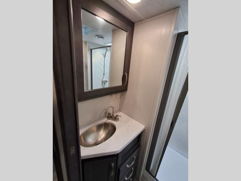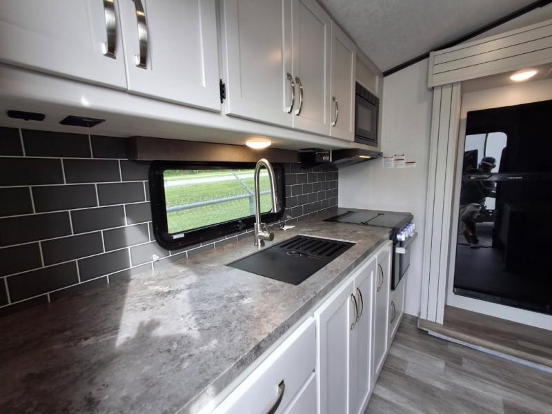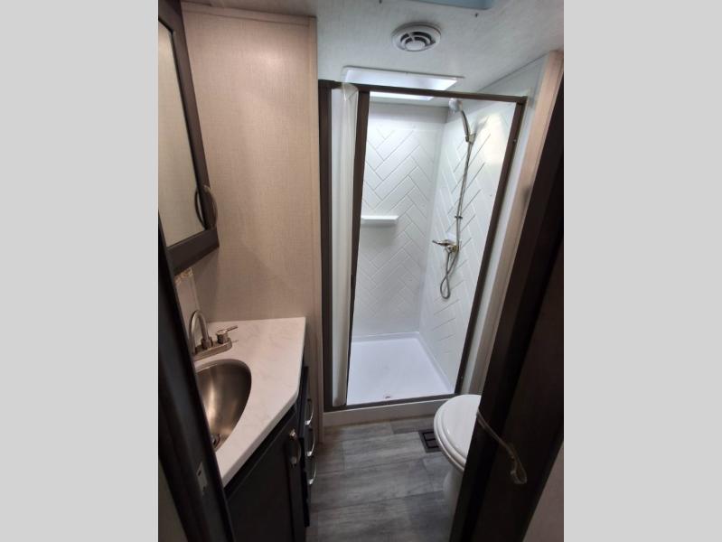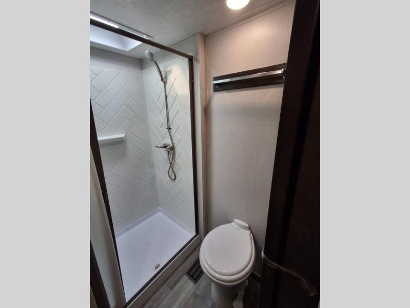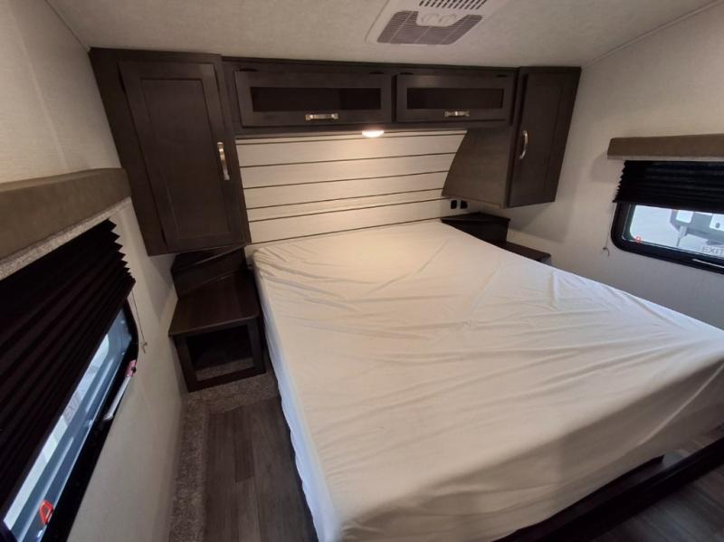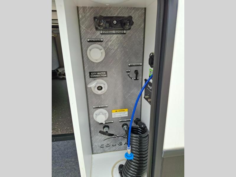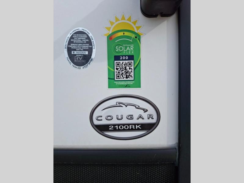 The Cougar Sport structural I-beam frame with stamped steel cross-members and outriggers, plus its laminated sidewalls with five-sided aluminum superstructure and Alpha Super Flex roof membrane are what active RVers love about the construction of the Cougar line. The Cougar Sport models are no exception when it comes to a great package, as well as being smaller and lighter weight than their big brother Cougar models. A one-piece, heated and enclosed polypropylene underbelly means a longer camping season. On the inside, residential shaker style hardwood cabinet doors and decorative crown molding, plus seamless pressed countertops and an on-demand water heater will make your unit feel even more like home. You are also sure to appreciate the shiplap style decorative accent wall behind the bed, a porcelain foot flush toilet in the bathroom, plus residential kitchen hardware, and so much more.