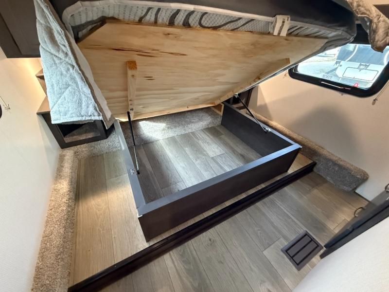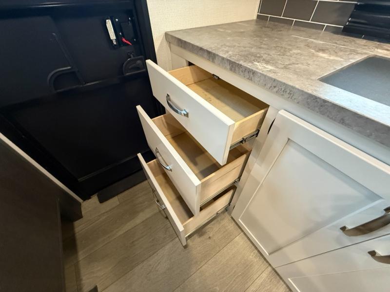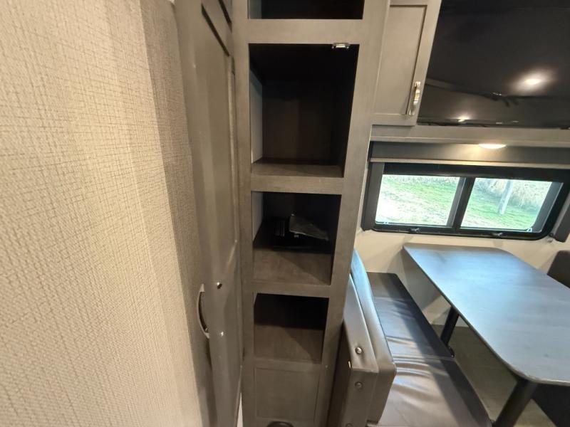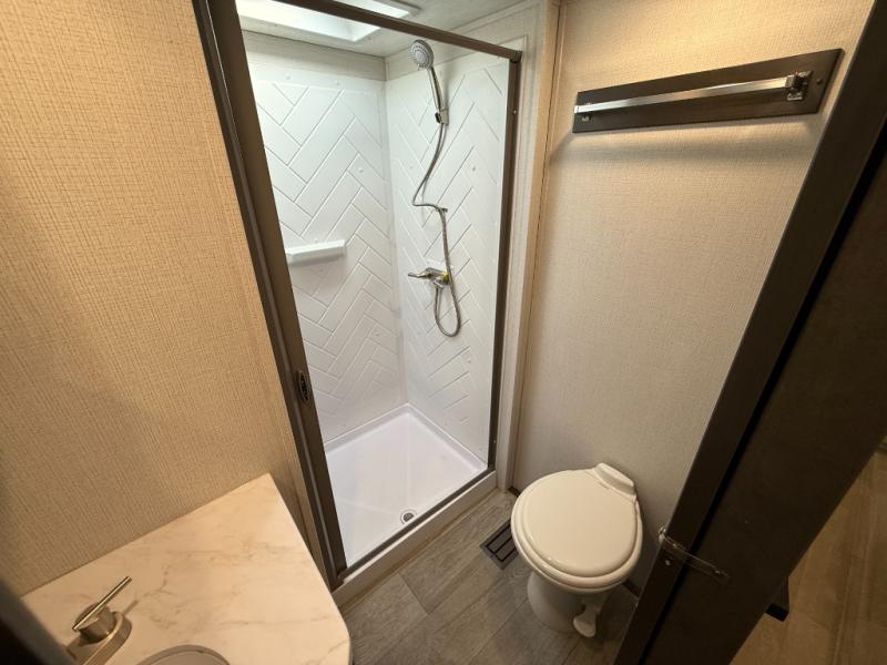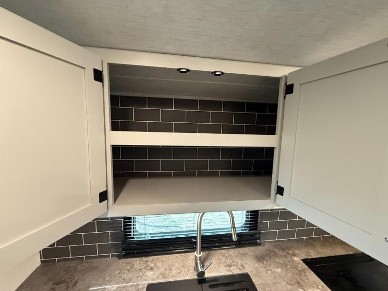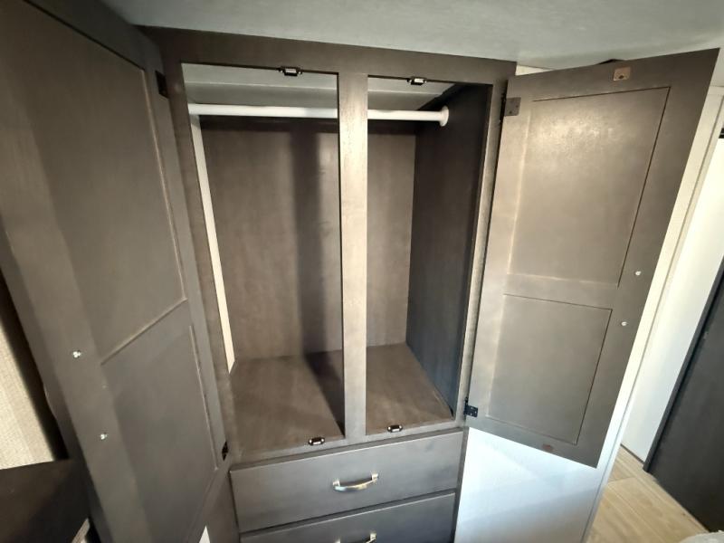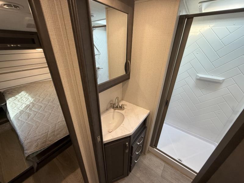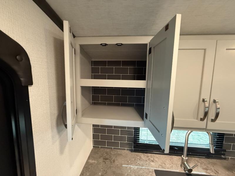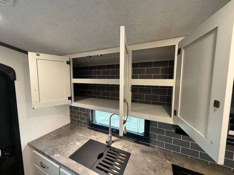 The Cougar Sport structural I-beam frame with stamped steel cross-members and outriggers, plus its laminated sidewalls with five-sided aluminum superstructure and Alpha Super Flex roof membrane are what active RVers love about the construction of the Cougar line. The Cougar Sport models are no exception when it comes to a great package, as well as being smaller and lighter weight than their big brother Cougar models. A one-piece, heated and enclosed polypropylene underbelly means a longer camping season. On the inside, residential shaker style hardwood cabinet doors and decorative crown molding, plus seamless pressed countertops and an on-demand water heater will make your unit feel even more like home. You are also sure to appreciate the shiplap style decorative accent wall behind the bed, a porcelain foot flush toilet in the bathroom, plus residential kitchen hardware, and so much more.