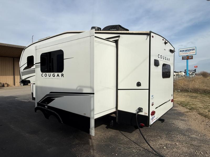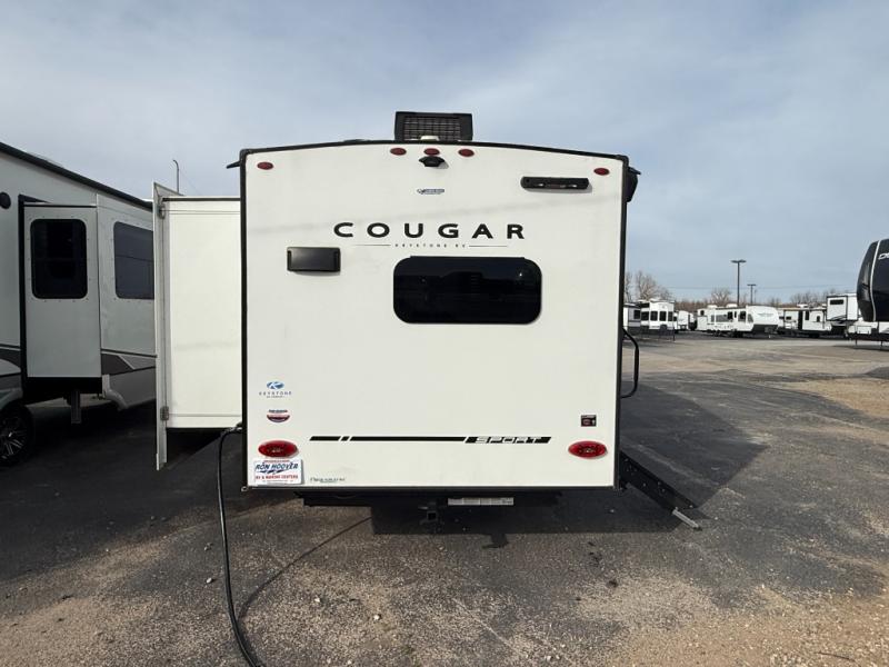 Your family of five or six will love traveling in this Cougar Sport lightweight fifth wheel! Enter to find a convenient rear kitchen layout just steps inside the door. Drop your shoes off in the shoe cubby to your right at the door, and relax on either the tri-fold sleeper sofa or at the booth dinette. The sofa and a 12 volt refrigerator are situated within the slide for added roominess. Head up the steps to a complete bath and private front bedroom featuring a queen size bed with dual shirt wardrobes and nightstands on both sides of the bed. There is also a wardrobe off the foot of the bed along the inside wall with two convenient drawers as well. The bathroom offers a shower with a skylight for added headroom and natural lighting. You will also appreciate the medicine cabinet over the sink for your personal items. Back down to the main living and kitchen area, a nice size pantry will hold all of your dry goods and snacks, and there is ample storage in the overhead cabinets above the dinette on either side of the TV, plus in the kitchen area all along the rear wall. Here you can cook your family their camp favorites using either the three burner range with oven, or overhead microwave. Outside, a 17' awning provides added living space protected from the elements!