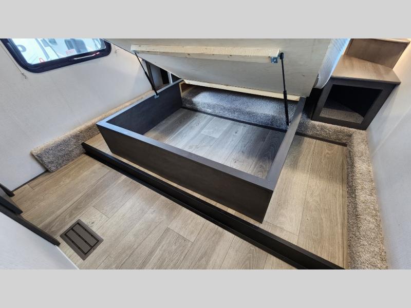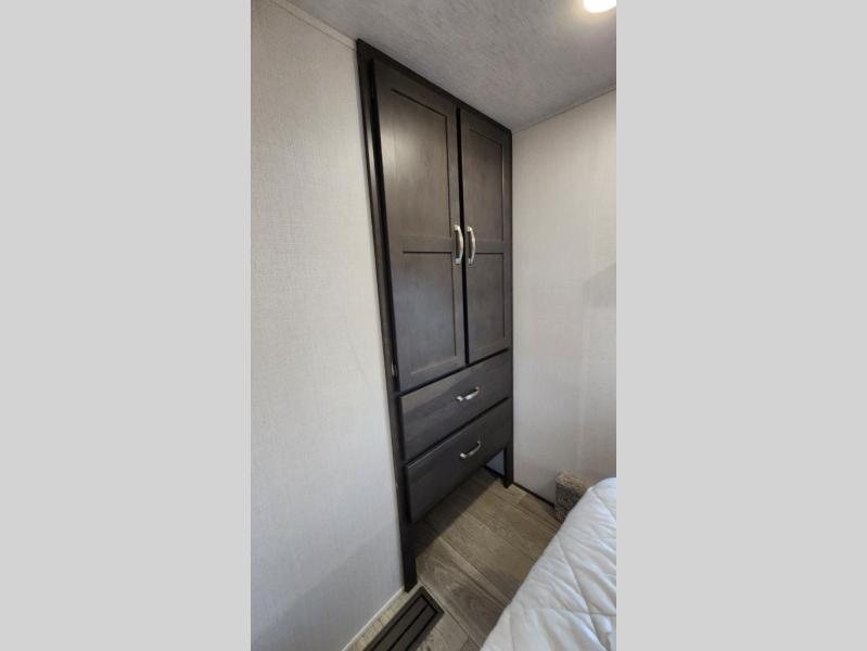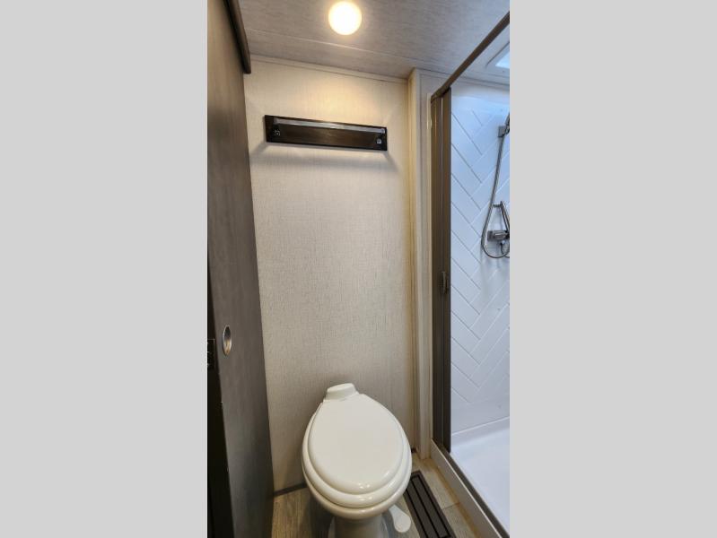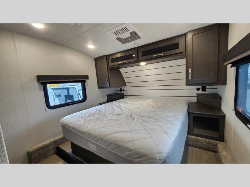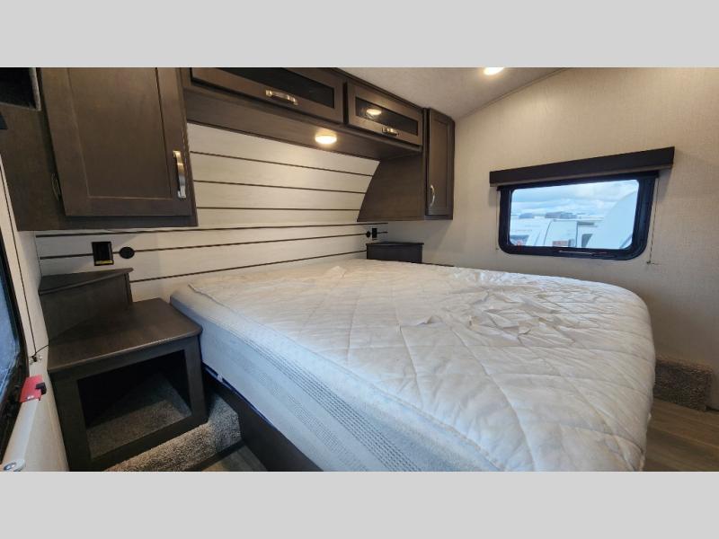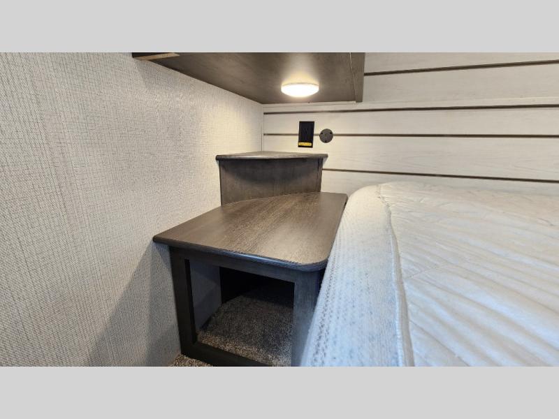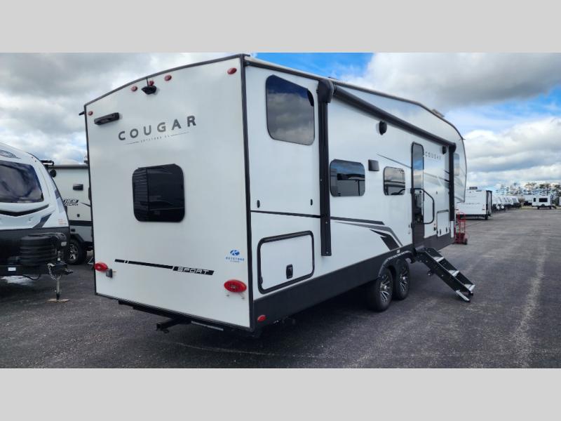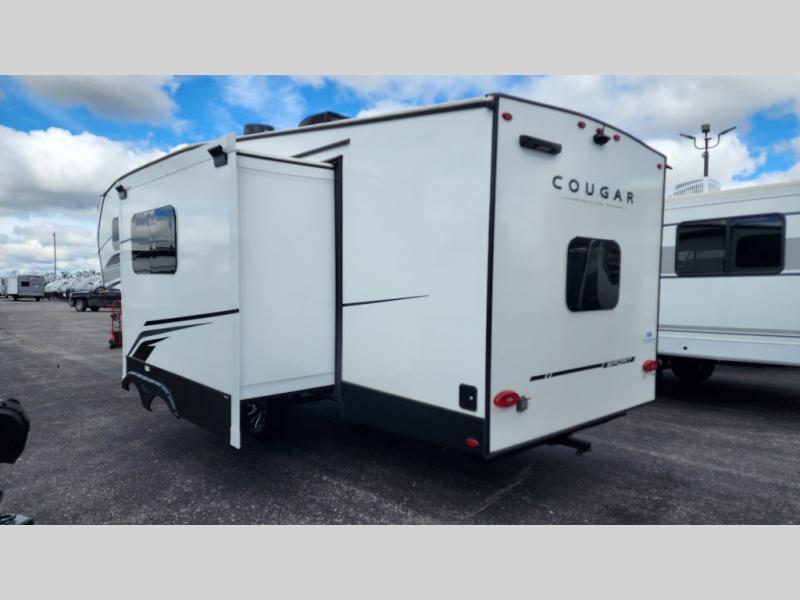 The Cougar Sport structural I-beam frame with stamped steel cross-members and outriggers, plus its laminated sidewalls with five-sided aluminum superstructure and Alpha Super Flex roof membrane are what active RVers love about the construction of the Cougar line. The Cougar Sport models are no exception when it comes to a great package, as well as being smaller and lighter weight than their big brother Cougar models. A one-piece, heated and enclosed polypropylene underbelly means a longer camping season. On the inside, residential shaker style hardwood cabinet doors and decorative crown molding, plus seamless pressed countertops and an on-demand water heater will make your unit feel even more like home. You are also sure to appreciate the shiplap style decorative accent wall behind the bed, a porcelain foot flush toilet in the bathroom, plus residential kitchen hardware, and so much more.