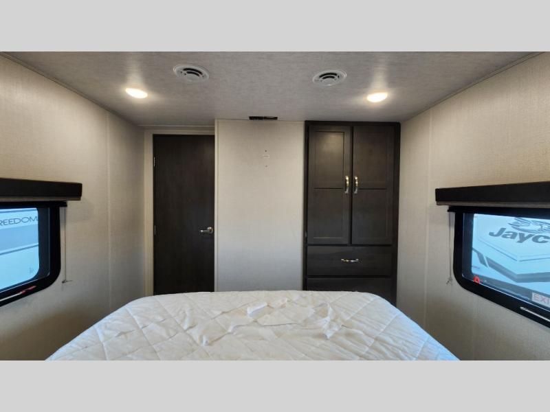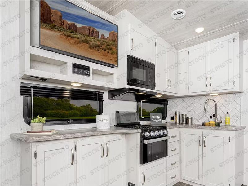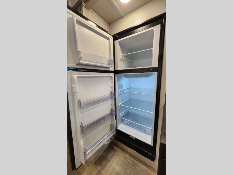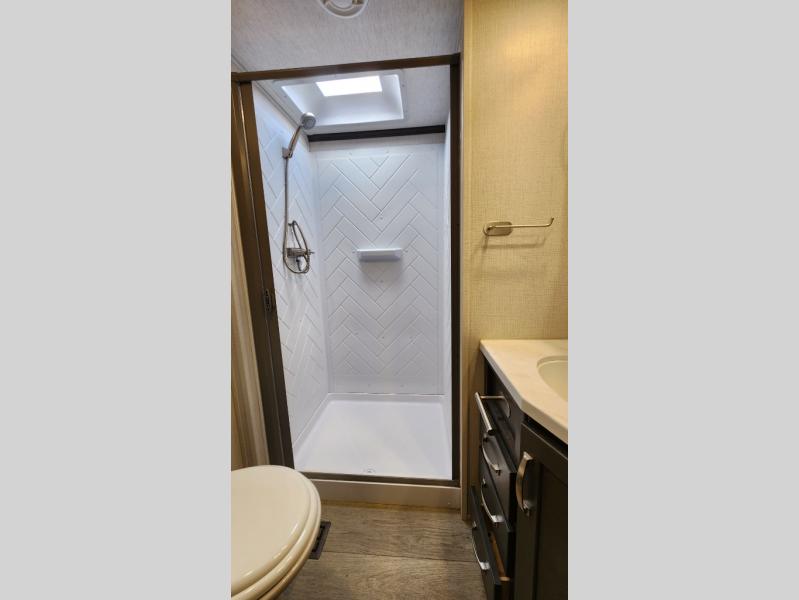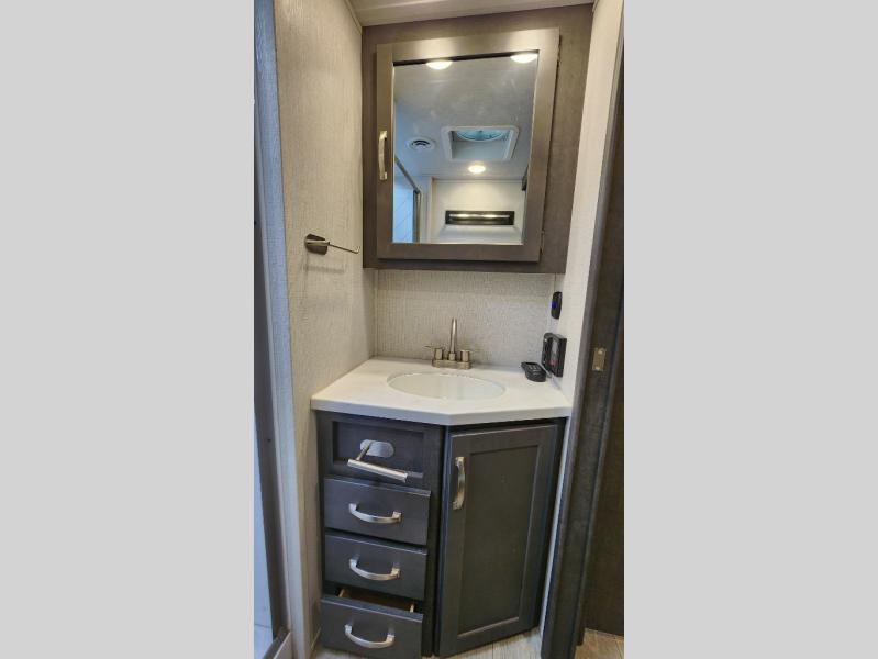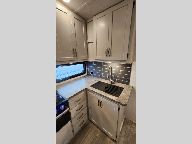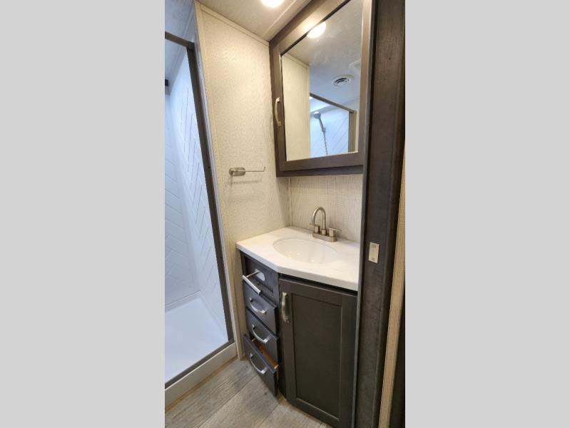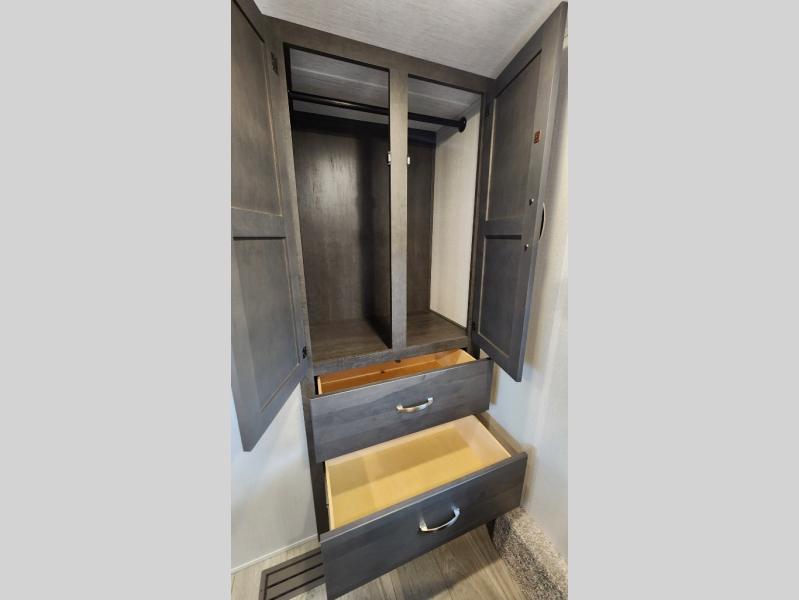 The Cougar Sport structural I-beam frame with stamped steel cross-members and outriggers, plus its laminated sidewalls with five-sided aluminum superstructure and Alpha Super Flex roof membrane are what active RVers love about the construction of the Cougar line. The Cougar Sport models are no exception when it comes to a great package, as well as being smaller and lighter weight than their big brother Cougar models. A one-piece, heated and enclosed polypropylene underbelly means a longer camping season. On the inside, residential shaker style hardwood cabinet doors and decorative crown molding, plus seamless pressed countertops and an on-demand water heater will make your unit feel even more like home. You are also sure to appreciate the shiplap style decorative accent wall behind the bed, a porcelain foot flush toilet in the bathroom, plus residential kitchen hardware, and so much more.