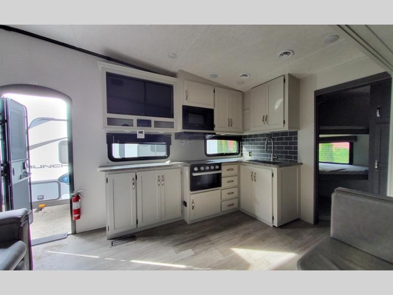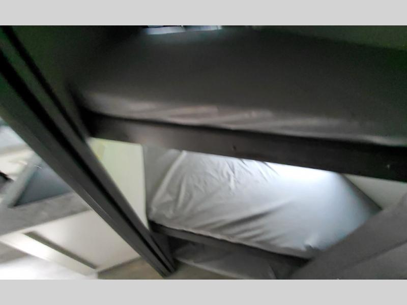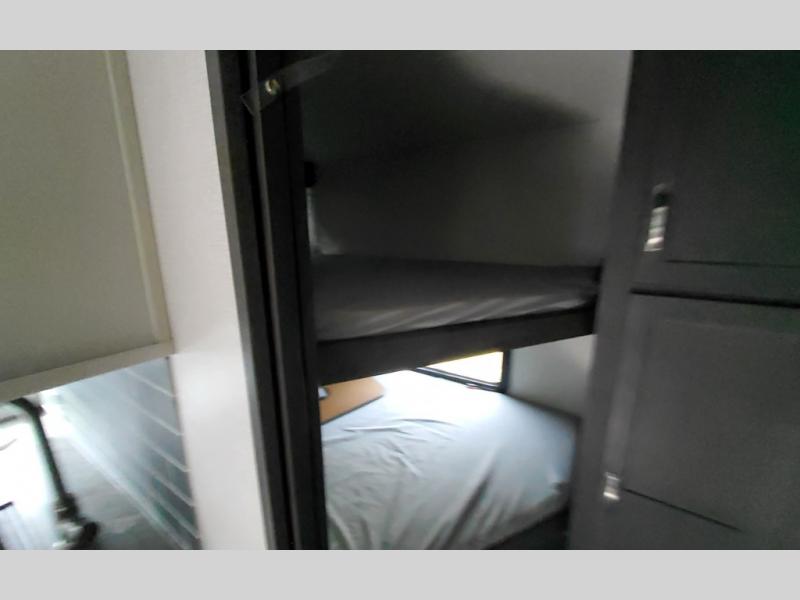 This lightweight Cougar Sport bunk model features sleeping for ten or more with triple stacked double bed bunks in the rear bunk room, a large U-shaped dinette that can be transformed into sleep space, as well as a tri-fold sofa sleeper and a queen bed in the private bedroom up front. The U-shaped dinette will seat quite a few of you for meals and even game time, plus the sofa is nearby for even more to kick back on. A fully equipped kitchen with overhead microwave, a three burner range, and large sink plus storage will make it easy to keep everyone fed and happy. A 10.4 Cu. Ft. 12 volt refrigerator will keep all of your perishable items fresh, and there are plenty of cabinets for storing snacks and dry goods as well. Head up the steps to the bathroom featuring a shower with a skylight, sink with overhead medicine cabinet, and toilet. The private front bedroom takes you away from the hustle and bustle of the main living area and bunkhouse to provide a relaxing retreat including a comfy queen bed, dual nightstands and shirt wardrobes as well as an additional wardrobe along the interior wall for even more storage.