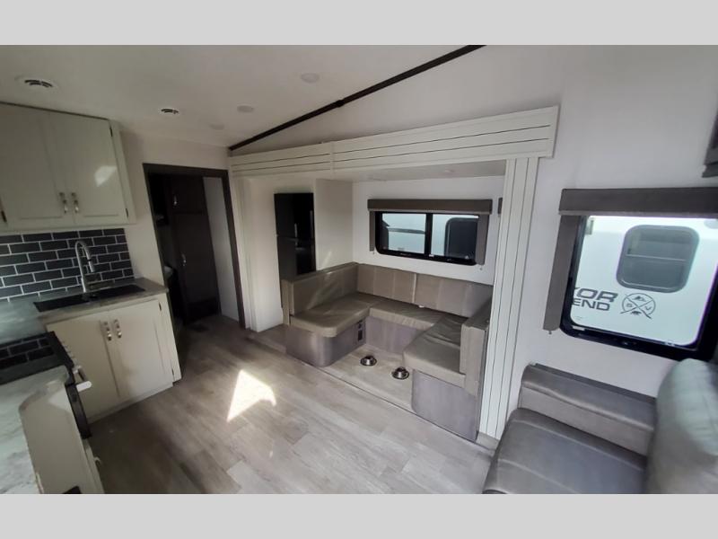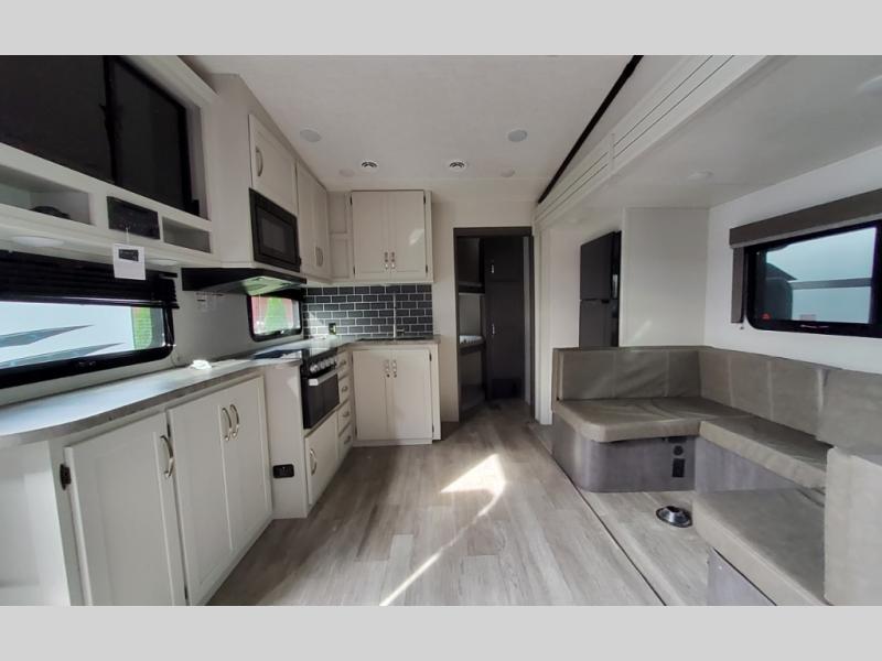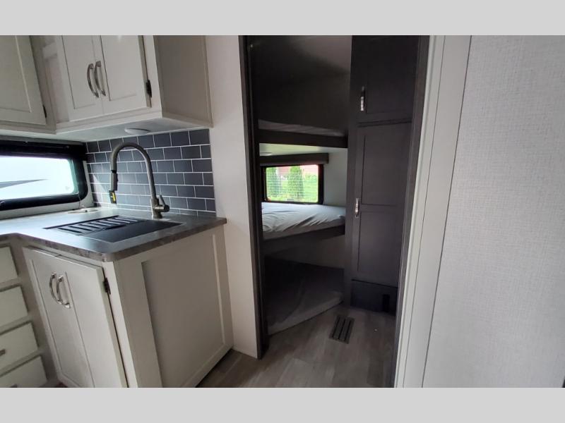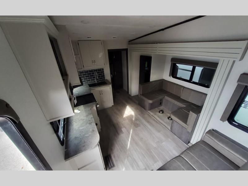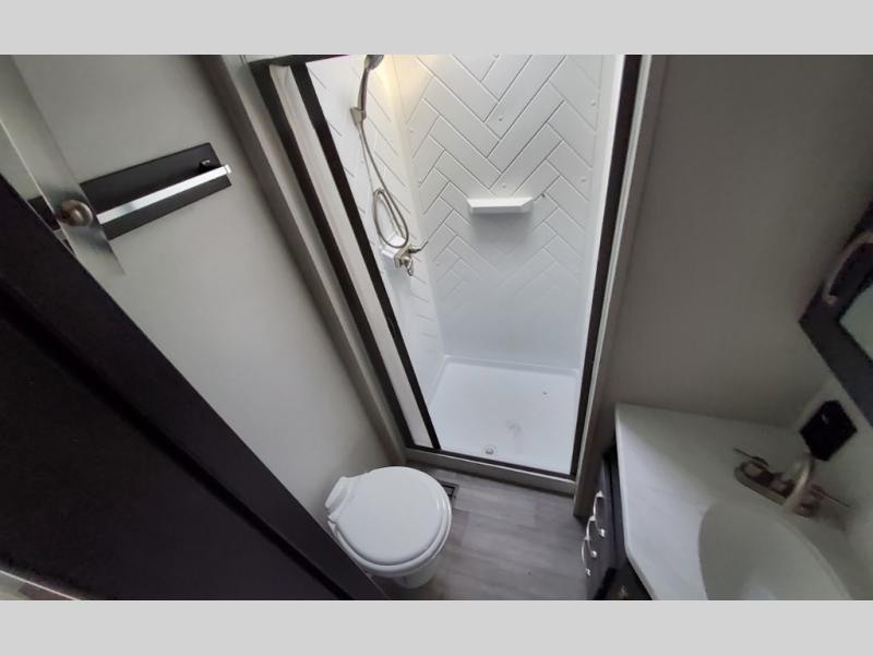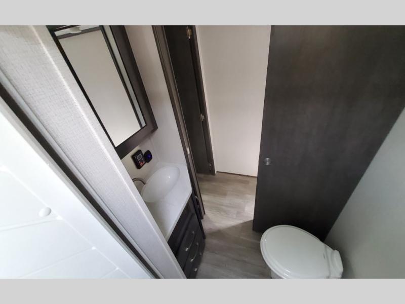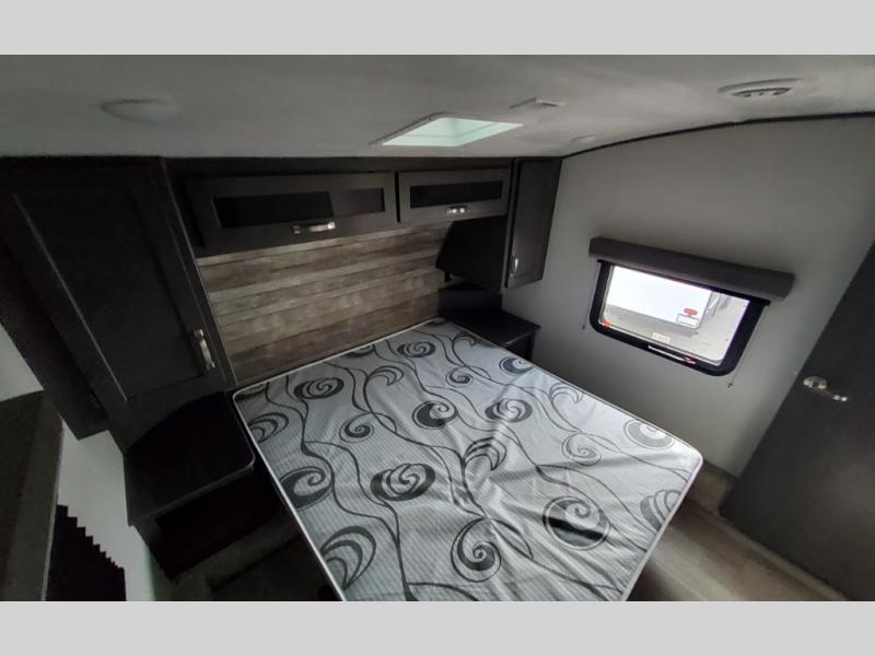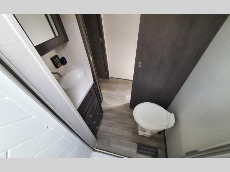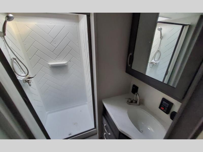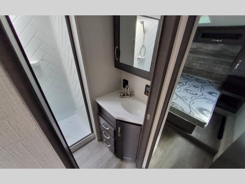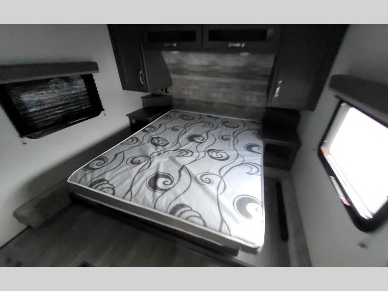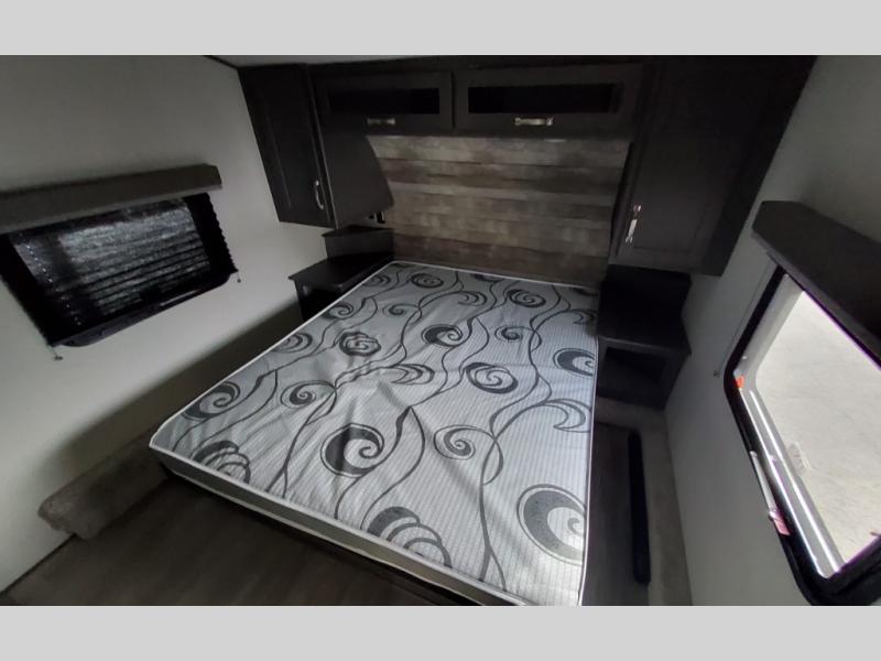 The Cougar Sport structural I-beam frame with stamped steel cross-members and outriggers, plus its laminated sidewalls with five-sided aluminum superstructure and Alpha Super Flex roof membrane are what active RVers love about the construction of the Cougar line. The Cougar Sport models are no exception when it comes to a great package, as well as being smaller and lighter weight than their big brother Cougar models. A one-piece, heated and enclosed polypropylene underbelly means a longer camping season. On the inside, residential shaker style hardwood cabinet doors and decorative crown molding, plus seamless pressed countertops and an on-demand water heater will make your unit feel even more like home. You are also sure to appreciate the shiplap style decorative accent wall behind the bed, a porcelain foot flush toilet in the bathroom, plus residential kitchen hardware, and so much more.