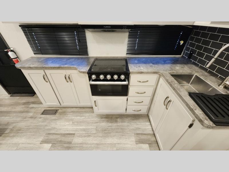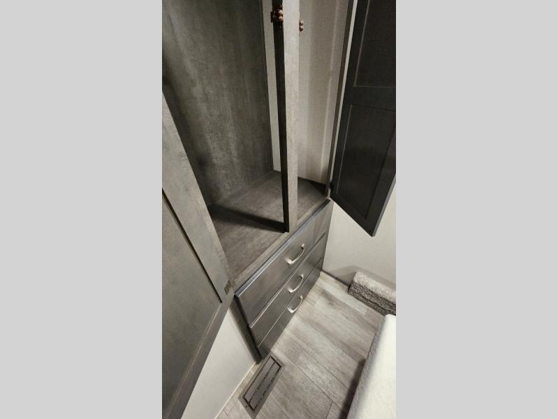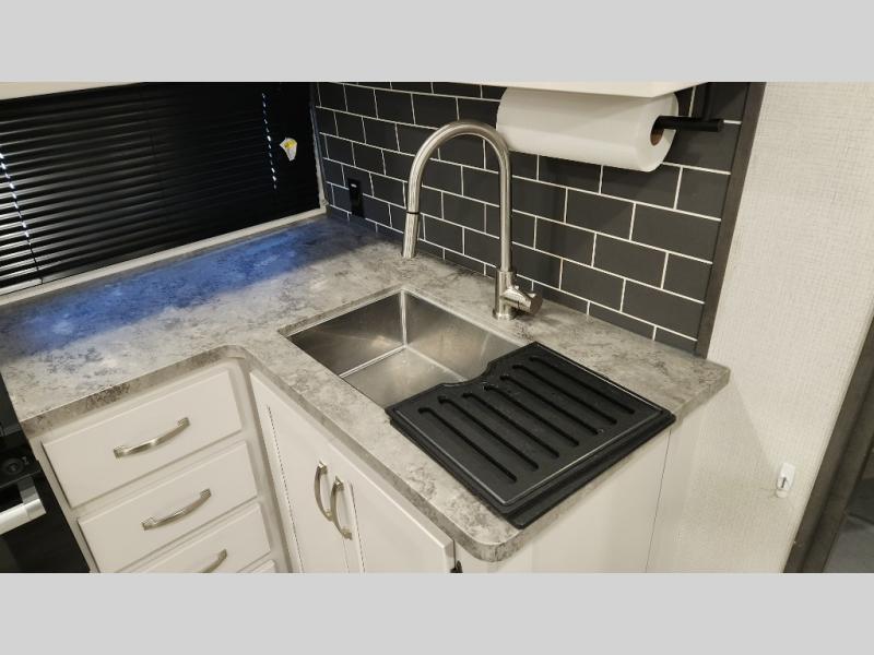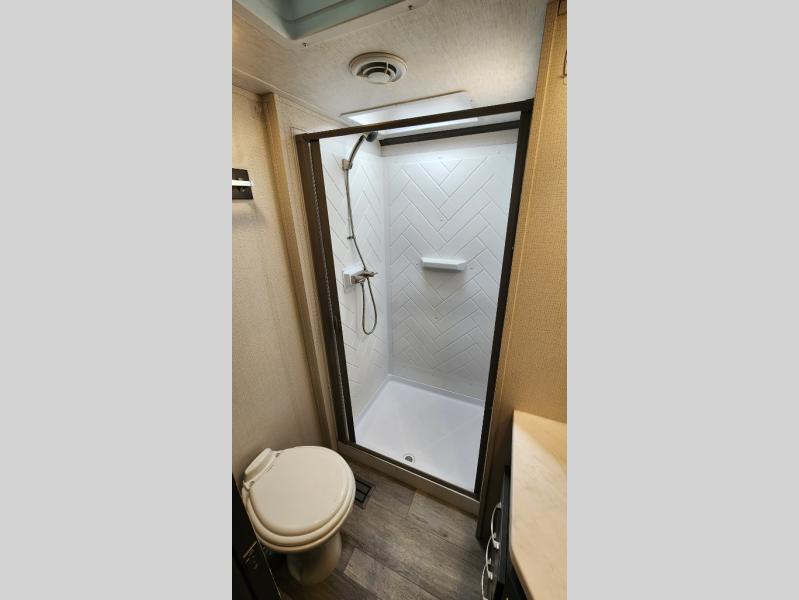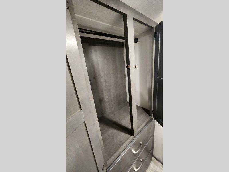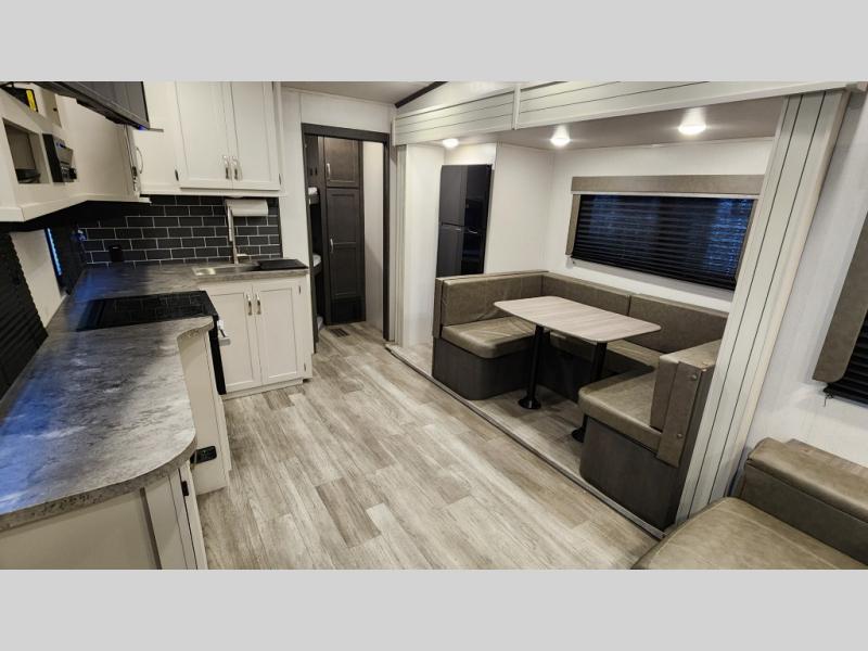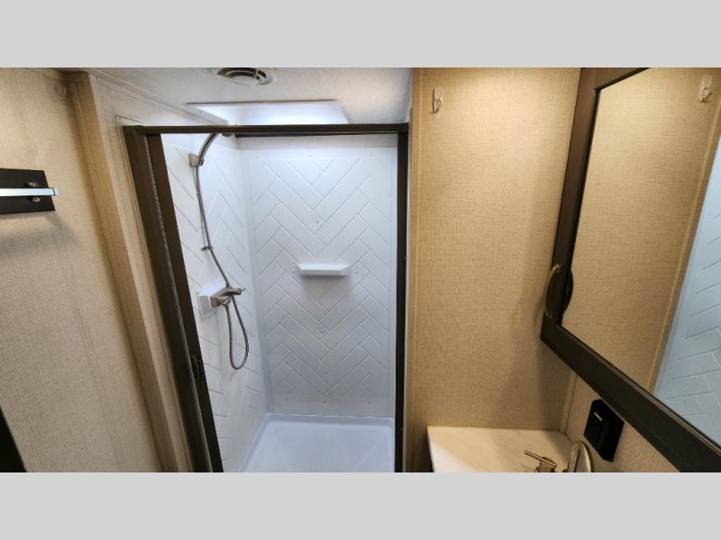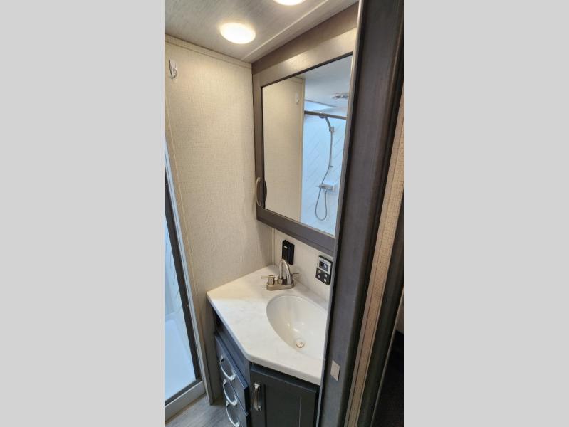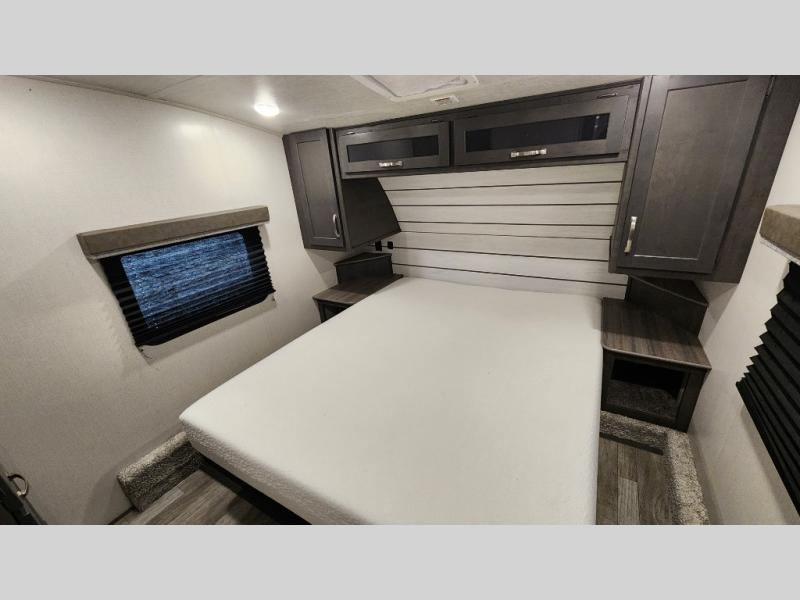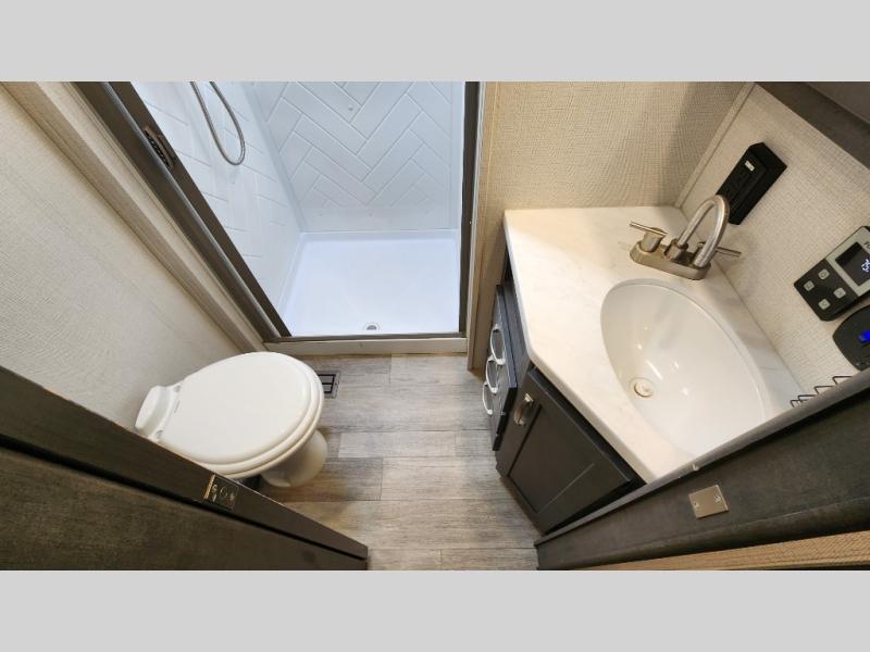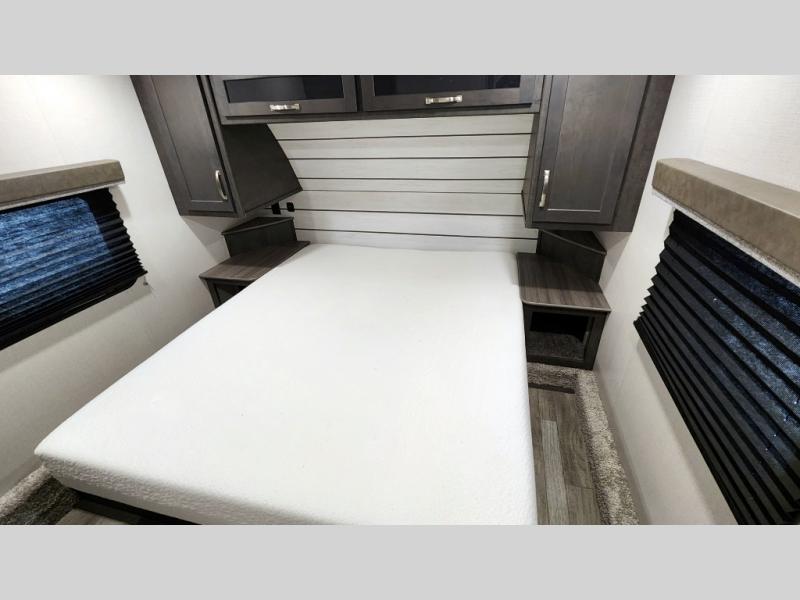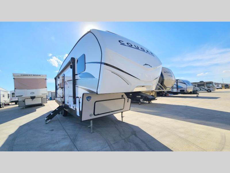The Cougar Sport structural I-beam frame with stamped steel cross-members and outriggers, plus its laminated sidewalls with five-sided aluminum superstructure and Alpha Super Flex roof membrane are what active RVers love about the construction of the Cougar line. The Cougar Sport models are no exception when it comes to a great package, as well as being smaller and lighter weight than their big brother Cougar models. A one-piece, heated and enclosed polypropylene underbelly means a longer camping season. On the inside, residential shaker style hardwood cabinet doors and decorative crown molding, plus seamless pressed countertops and an on-demand water heater will make your unit feel even more like home. You are also sure to appreciate the shiplap style decorative accent wall behind the bed, a porcelain foot flush toilet in the bathroom, plus residential kitchen hardware, and so much more.