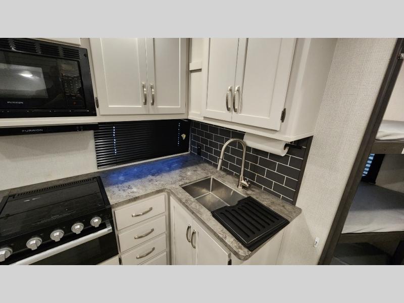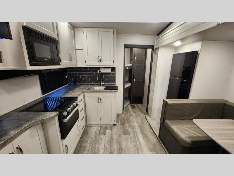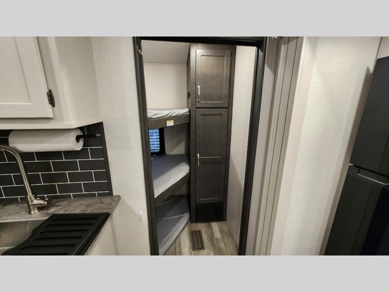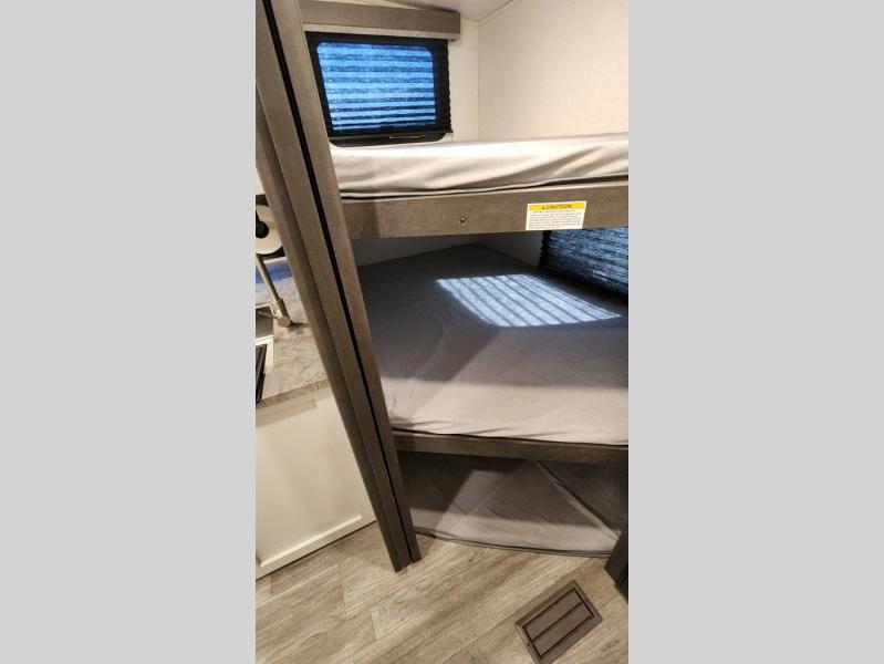 This lightweight Cougar Sport bunk model features sleeping for ten or more with triple stacked double bed bunks in the rear bunk room, a large U-shaped dinette that can be transformed into sleep space, as well as a tri-fold sofa sleeper and a queen bed in the private bedroom up front. The U-shaped dinette will seat quite a few of you for meals and even game time, plus the sofa is nearby for even more to kick back on. A fully equipped kitchen with overhead microwave, a three burner range, and large sink plus storage will make it easy to keep everyone fed and happy. A 10.4 Cu. Ft. 12 volt refrigerator will keep all of your perishable items fresh, and there are plenty of cabinets for storing snacks and dry goods as well. Head up the steps to the bathroom featuring a shower with a skylight, sink with overhead medicine cabinet, and toilet. The private front bedroom takes you away from the hustle and bustle of the main living area and bunkhouse to provide a relaxing retreat including a comfy queen bed, dual nightstands and shirt wardrobes as well as an additional wardrobe along the interior wall for even more storage.