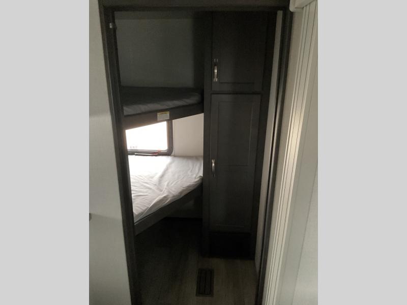 This lightweight Cougar Sport bunk model features sleeping for ten or more with triple stacked double bed bunks in the rear bunk room, a large U-shaped dinette that can be transformed into sleep space, as well as a tri-fold sofa sleeper and a queen bed in the private bedroom up front. The U-shaped dinette will seat quite a few of you for meals and even game time, plus the sofa is nearby for even more to kick back on. A fully equipped kitchen with overhead microwave, a three burner range, and large sink plus storage will make it easy to keep everyone fed and happy. A 10.4 Cu. Ft. 12 volt refrigerator will keep all of your perishable items fresh, and there are plenty of cabinets for storing snacks and dry goods as well. Head up the steps to the bathroom featuring a shower with a skylight, sink with overhead medicine cabinet, and toilet. The private front bedroom takes you away from the hustle and bustle of the main living area and bunkhouse to provide a relaxing retreat including a comfy queen bed, dual nightstands and shirt wardrobes as well as an additional wardrobe along the interior wall for even more storage.