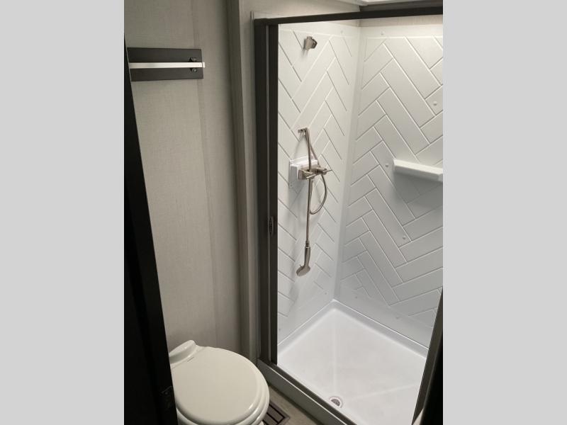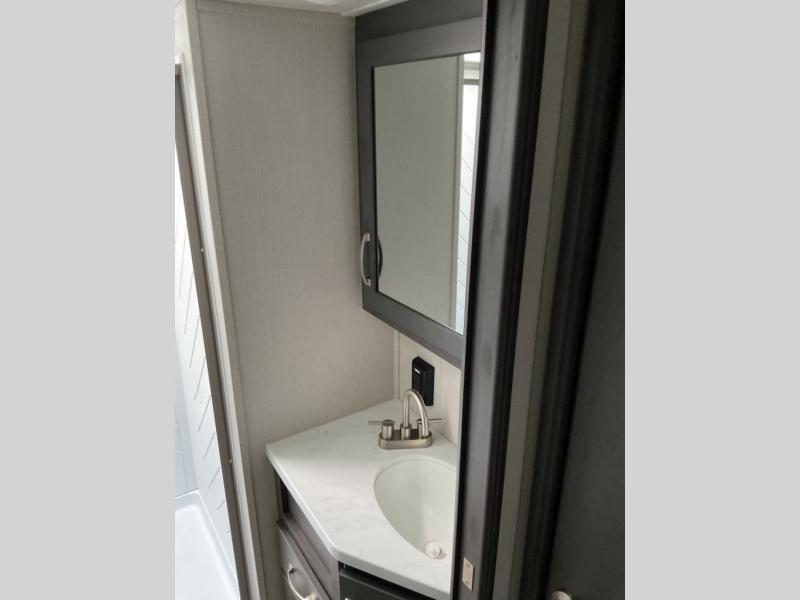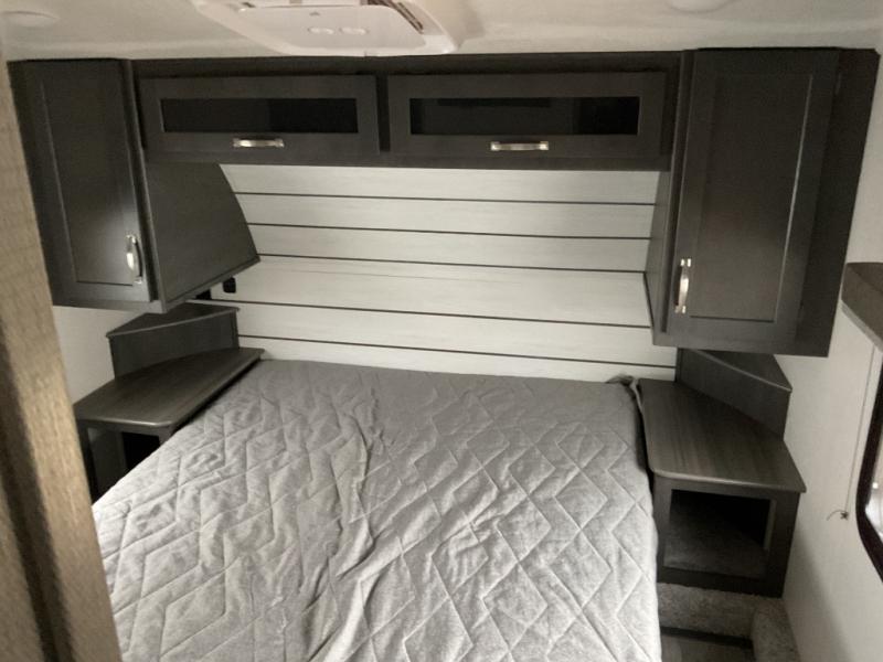 The Cougar Sport structural I-beam frame with stamped steel cross-members and outriggers, plus its laminated sidewalls with five-sided aluminum superstructure and Alpha Super Flex roof membrane are what active RVers love about the construction of the Cougar line. The Cougar Sport models are no exception when it comes to a great package, as well as being smaller and lighter weight than their big brother Cougar models. A one-piece, heated and enclosed polypropylene underbelly means a longer camping season. On the inside, residential shaker style hardwood cabinet doors and decorative crown molding, plus seamless pressed countertops and an on-demand water heater will make your unit feel even more like home. You are also sure to appreciate the shiplap style decorative accent wall behind the bed, a porcelain foot flush toilet in the bathroom, plus residential kitchen hardware, and so much more.