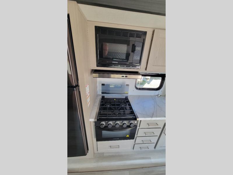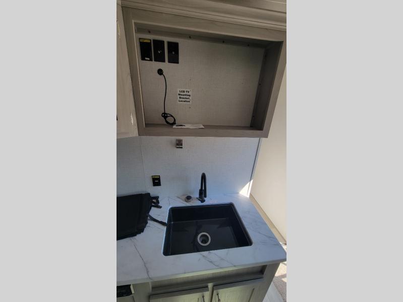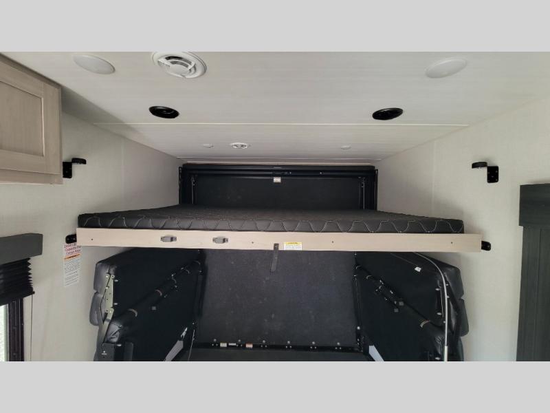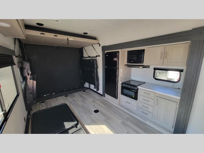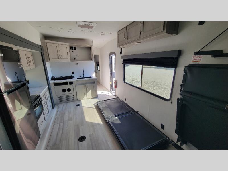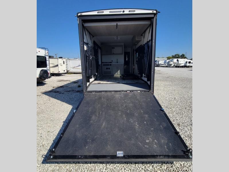 This open concept toy hauler is sure to meet all of your needs. There is a slide out for more space, a full kitchen with a Furrion three burner gas range and a microwave oven to prepare meals, plus a 10 cu. ft. 12V refrigerator to keep food fresh. You'll find comfortable seating space on the dual opposing sofas with a top queen bed, and there is TV prep if you want to add some entertainment. The RV queen bed in the front master bedroom will bring a great night's rest, and the dual entry bath lets you clean up after trail riding. When you're ready to head home, the 13' 4" garage area includes frame welded tie downs to keep your toys secure.