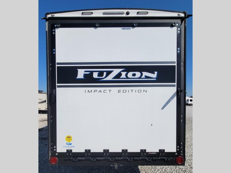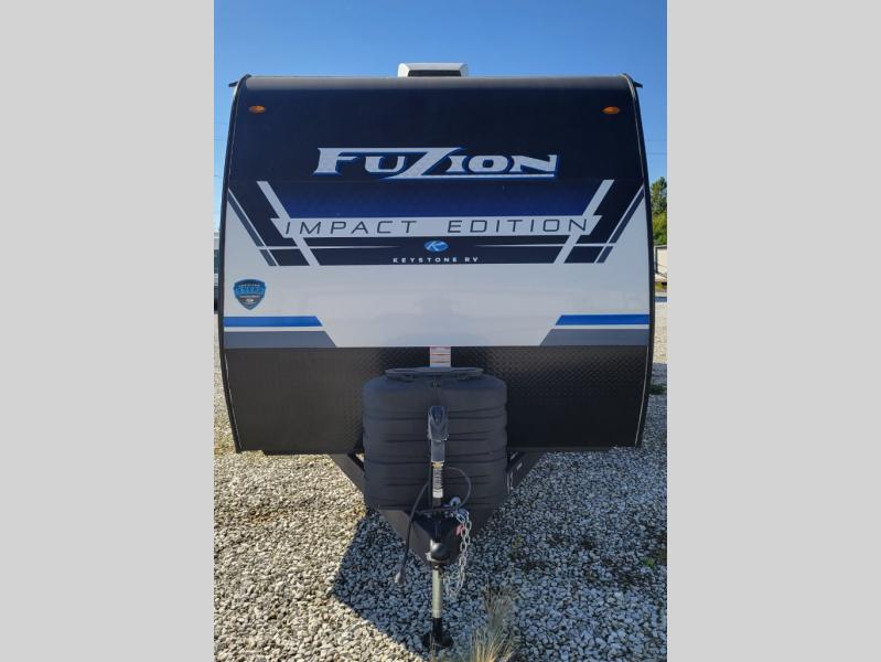 Embrace the great outdoors with a Fuzion Impact Edition toy hauler by Keystone! There is an aluminum exterior and a 8' 4" wide-body construction for your toys and gear! The one-piece polypropylene heated underbelly includes enclosed tanks and valves which will help extend your camping season, and the leaf spring suspension system will provide smooth towing. Head inside to enjoy night shades, hardwood cabinetry, and fiberglass backed linoleum floor with no carpet-free for easy cleaning. Each model also includes a Girard on-demand water heater, two 30 lb. LP tanks, recessed LED puck lighting throughout, and the list of comforts goes on!