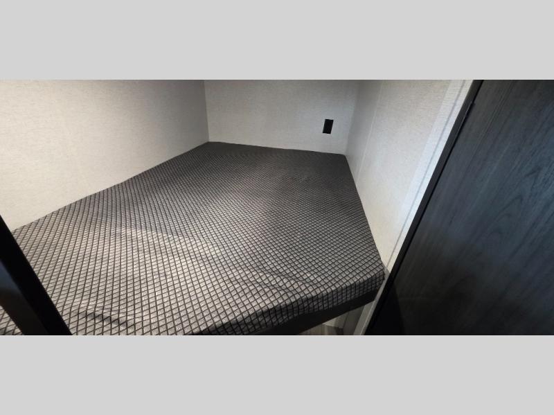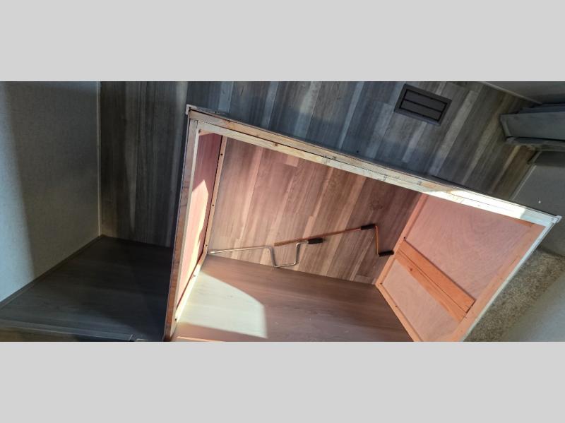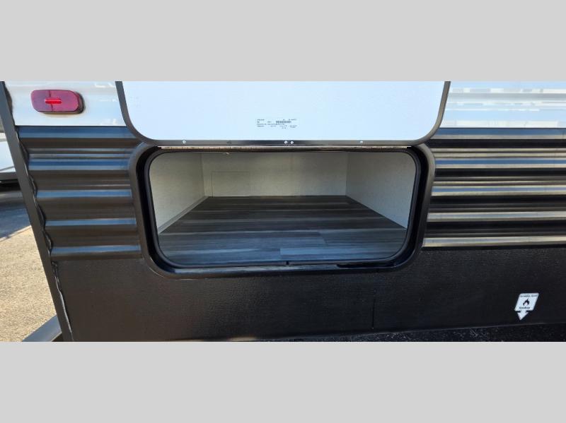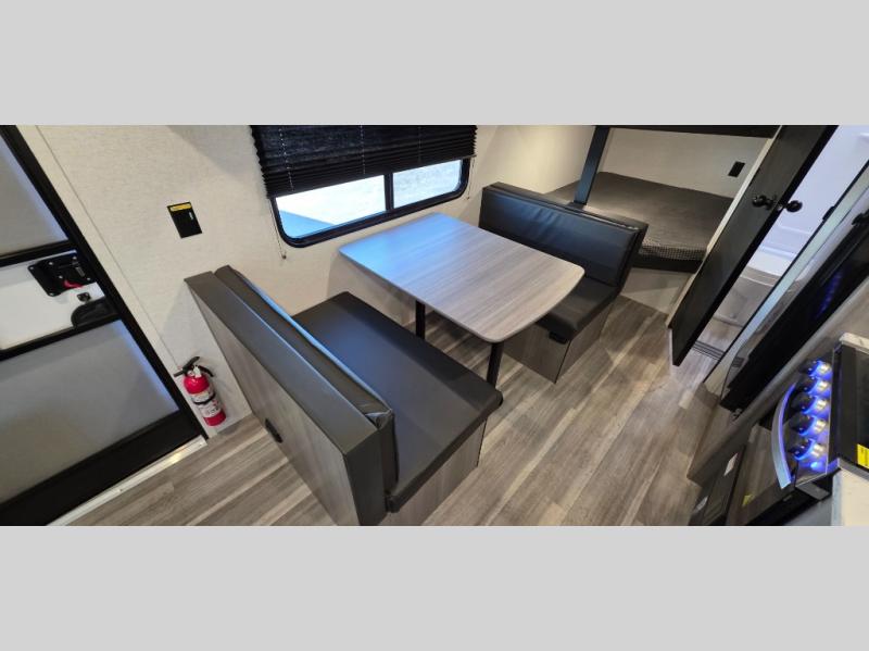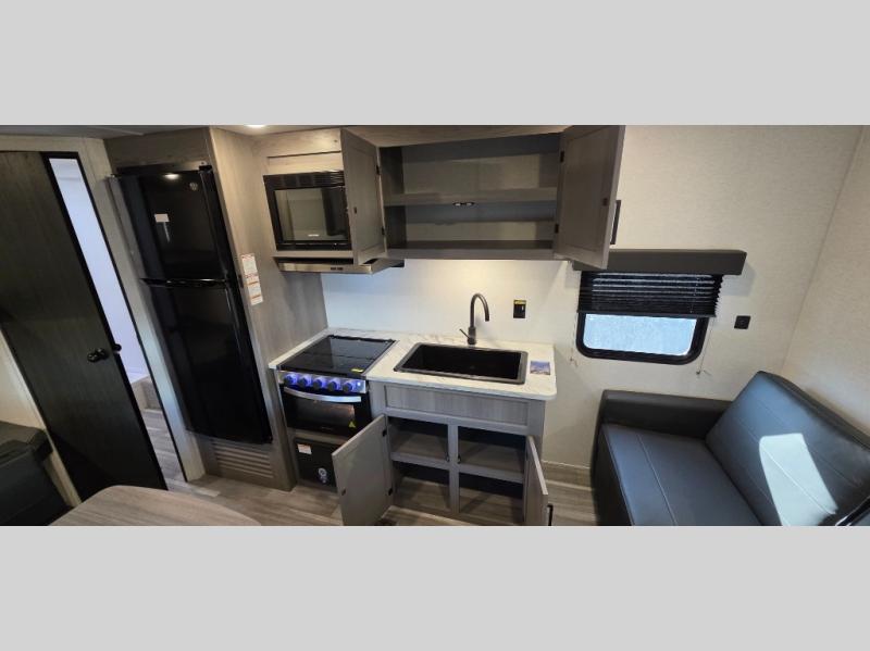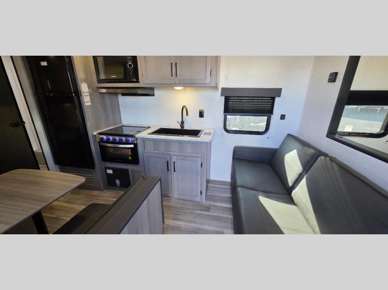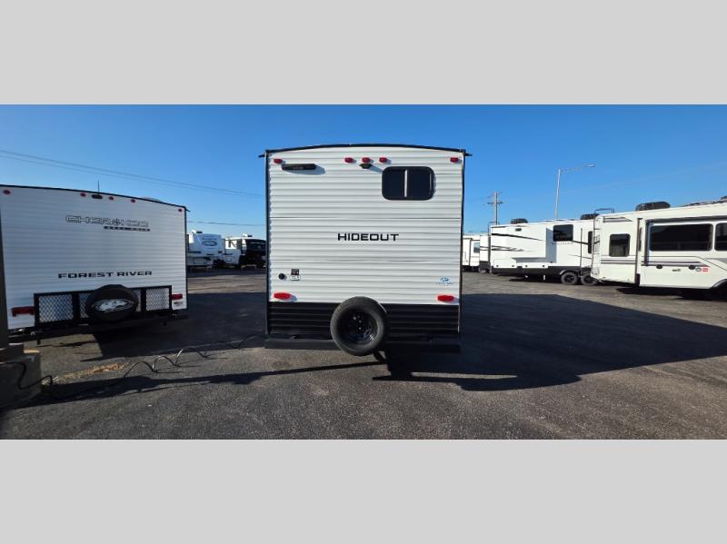 If you're looking for a travel trailer with a little more sleeping space, look no further than this Hideout Sport! There are double-size bunks with inside and outside storage, a walk-around queen bed in the front bedroom, plus a sofa and booth dinette for even more sleeping space. The kitchen comes with a two burner cooktop to cook meals on, a sink for clean up, and a 10 cu. ft. 12V refrigerator to store the milk and eggs. You will also find TV prep in this model if you enjoy movie nights while at the campground.