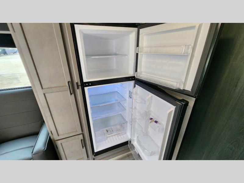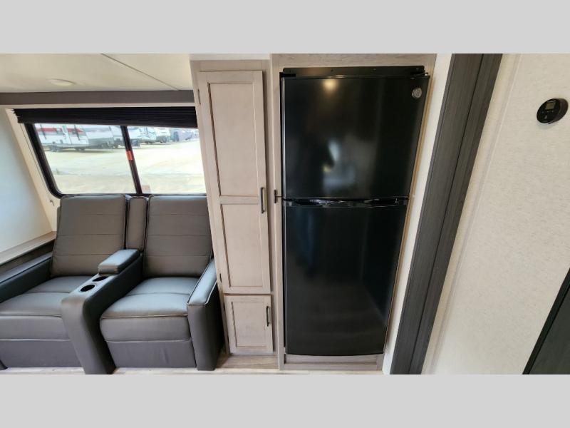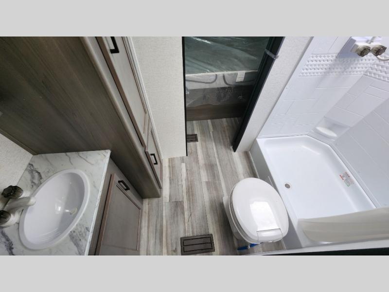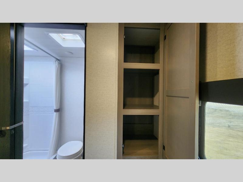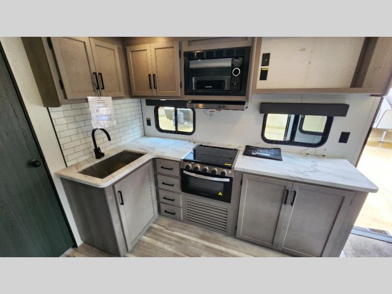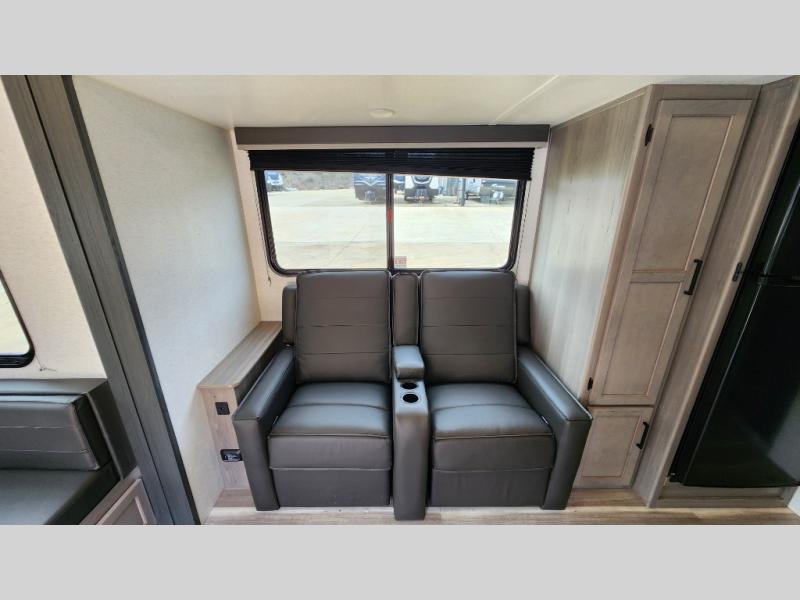 Enjoy every camping trip in this spacious dual entry travel trailer for six. You will love the rear U-dinette and the standard sofa within the large slide out, and there is TV prep in the living area if you plan to bring along your television. You could also choose the optional tri-fold sofa or optional theater seating if you need more seating or sleeping space. Home cooked meals can be whipped up in a hurry on the three burner range, and there is plenty of counter space to cut up fresh veggies. The walk-through bath is convenient for everyone to access, and here you'll find a spacious shower and a linen closet for clean towels. Head to the master bedroom where you'll be met with a queen bed, dual nightstands and closets, a laundry chute, plus your own exterior entry door; how convenient. The exterior even has an outdoor refrigerator for cold drinks under the awning!