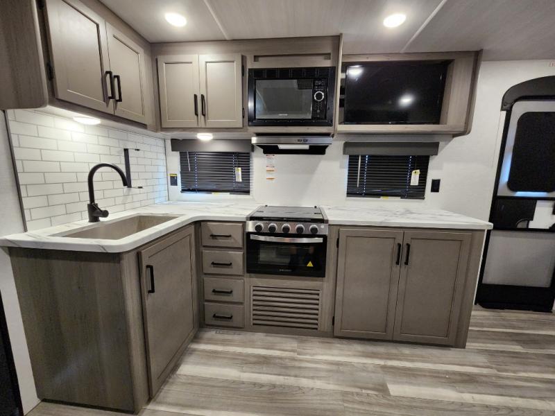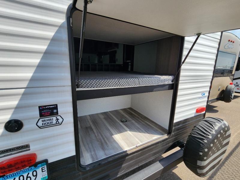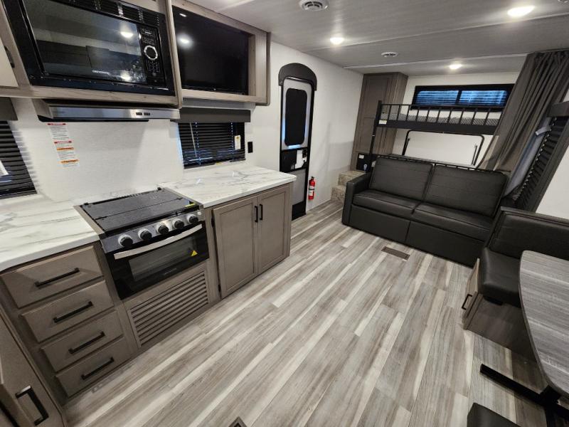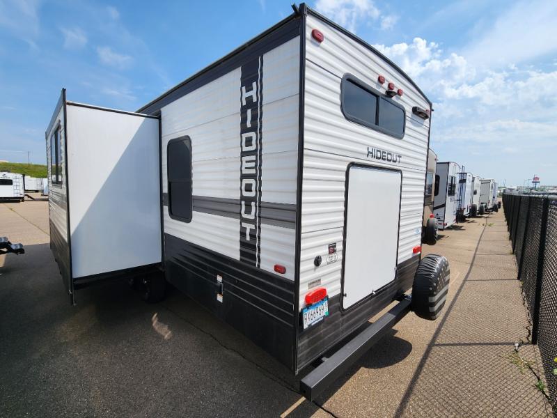 Are you looking for a travel trailer with more space, more amenities, and more sleeping space? Look no further than this Hideout! There are convenient dual entry doors for a smooth flow of traffic, a walk-through bath that will create a front master bedroom, plus bunks in the back with flip-up utility storage for your gear. And you can easily access this gear from outside using the storage door under the bunks! Everyone can meet in the main living area around the U-shaped dinette or on the sofa that be switched out for an optional tri-fold sofa or optional theater seating. And since there is TV prep you can make this space feel even more like home! The chef of your group will have everything they need to prepare meals each day, including a three burner cooktop and plenty of counter space. Head outdoors after dinner to enjoy the 21' power awning and grab a cold drink from the outdoor refrigerator!