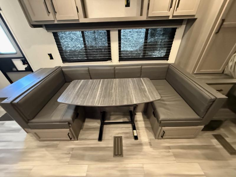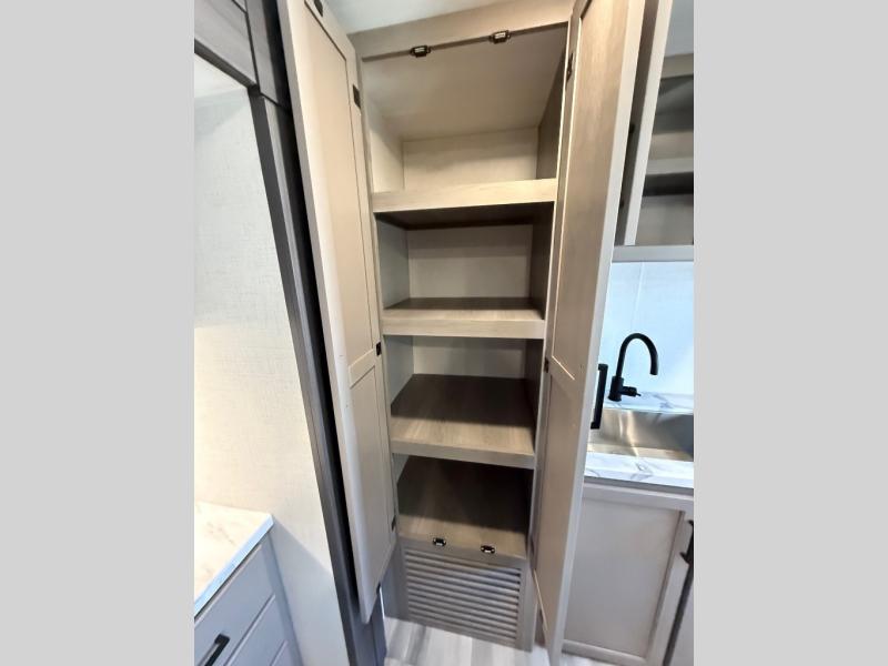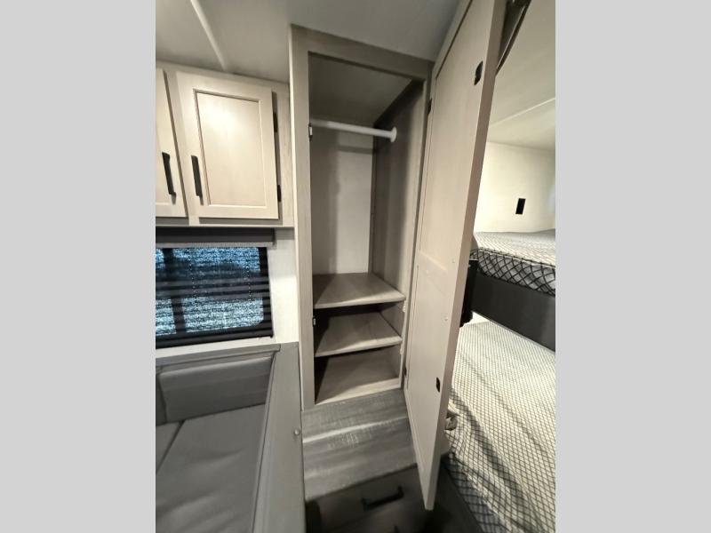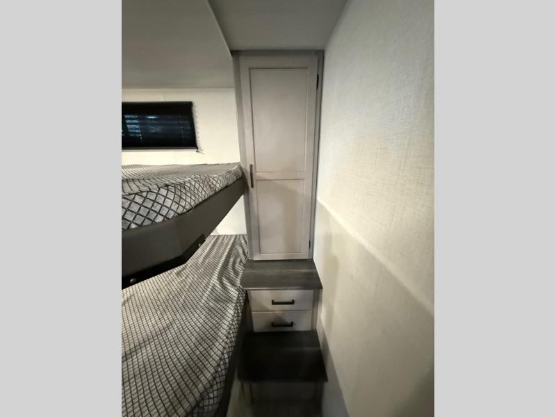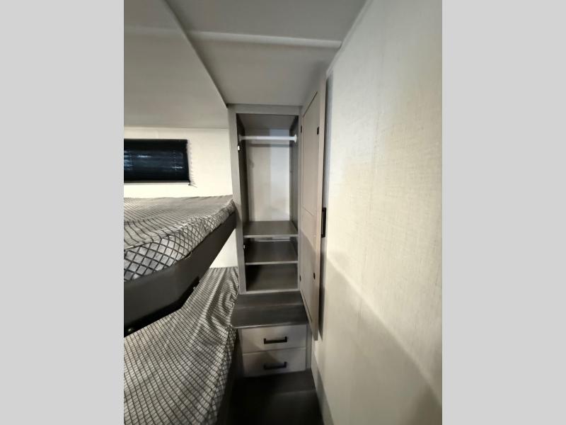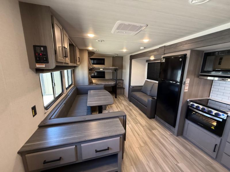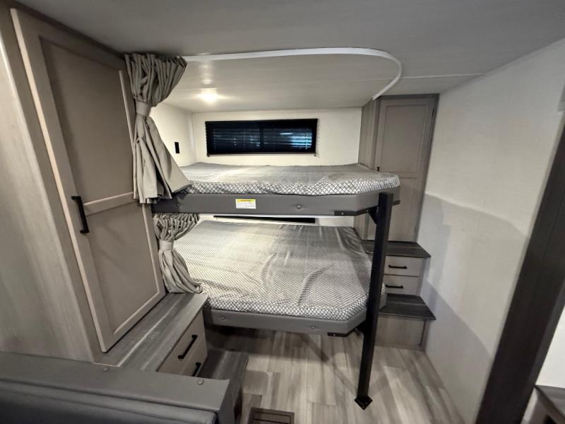 Check out this travel trailer with queen-size bunks in the back your guests are sure to love! There are also two sets of stairs and closets so they can easily climb into bed and store their belongings in their own space. The front private bedroom includes a walk-around queen bed, dual closets and dual nightstands, plus a convenient laundry chute that goes straight to the pass-through storage. And you'll find additional outdoor storage under the bunks in the back! Everyone can meet in the main living area each morning to dine around the U-shaped dinette or relax on the standard sofa. This sofa can also be switched out for an optional tri-fold sofa or optional theater seating, depending on your needs. The full kitchen includes a three burner cooktop, a spacious pantry, and a 10 cu. ft. 12V refrigerator for cold items. Start camping today!