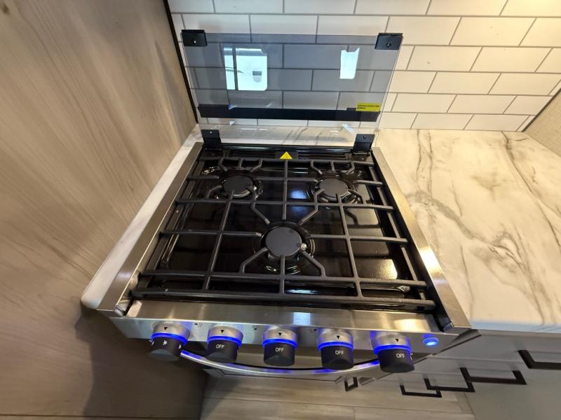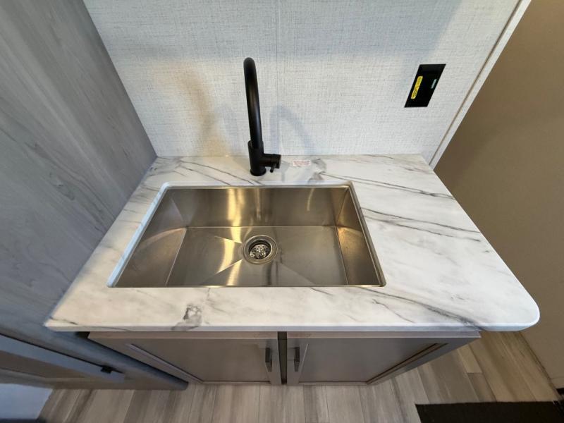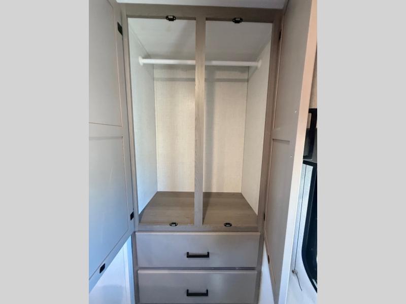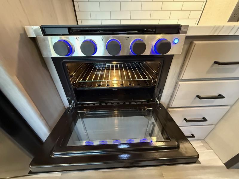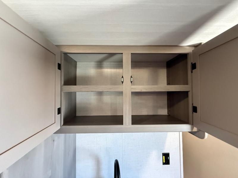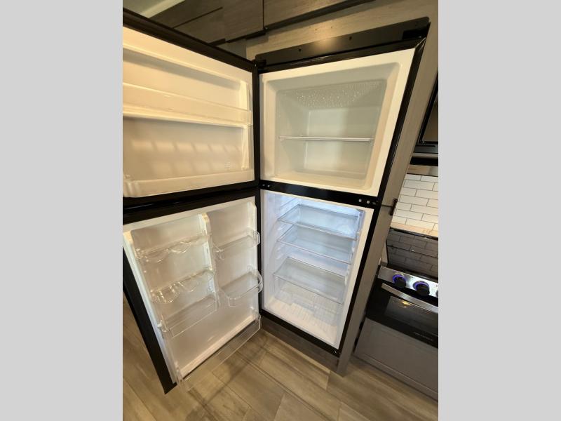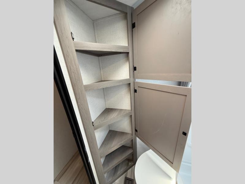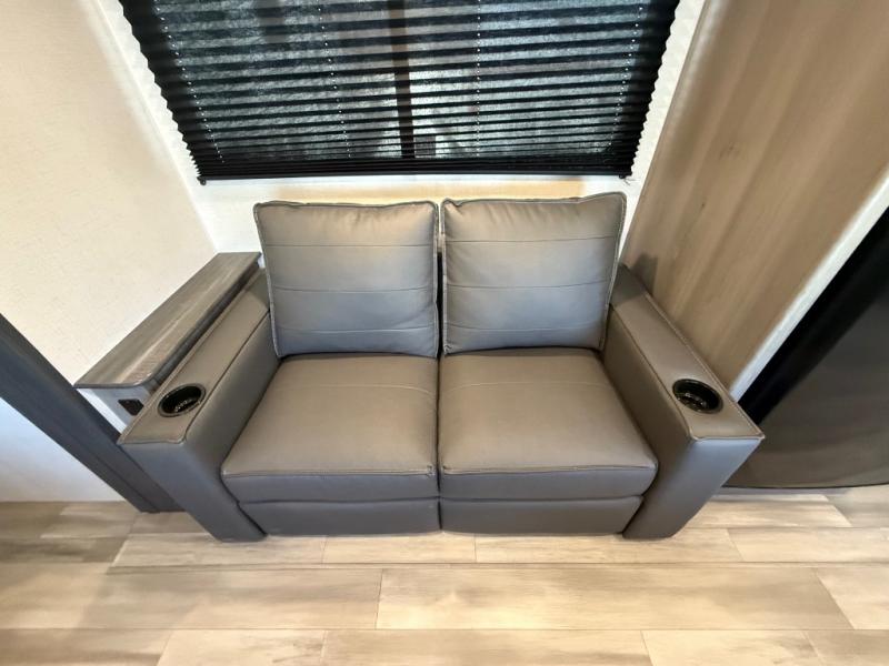 Check out this travel trailer with queen-size bunks in the back your guests are sure to love! There are also two sets of stairs and closets so they can easily climb into bed and store their belongings in their own space. The front private bedroom includes a walk-around queen bed, dual closets and dual nightstands, plus a convenient laundry chute that goes straight to the pass-through storage. And you'll find additional outdoor storage under the bunks in the back! Everyone can meet in the main living area each morning to dine around the U-shaped dinette or relax on the standard sofa. This sofa can also be switched out for an optional tri-fold sofa or optional theater seating, depending on your needs. The full kitchen includes a three burner cooktop, a spacious pantry, and a 10 cu. ft. 12V refrigerator for cold items. Start camping today!