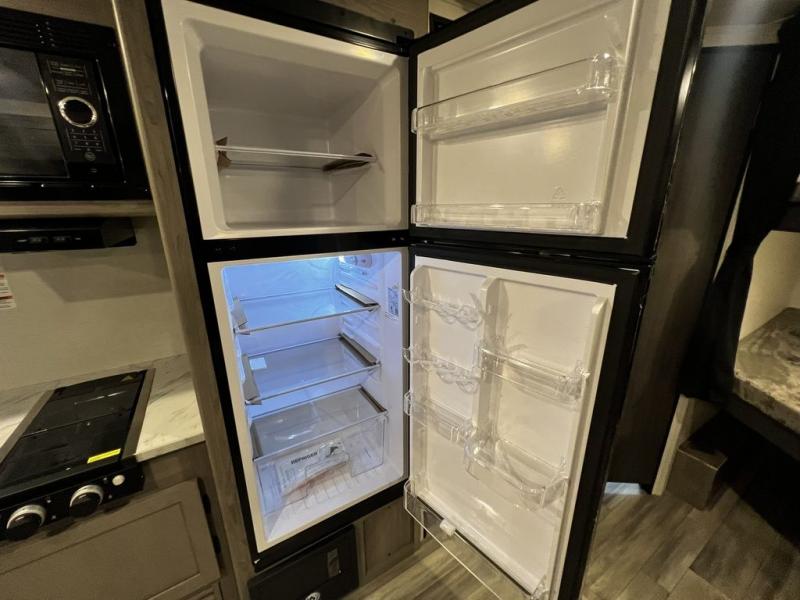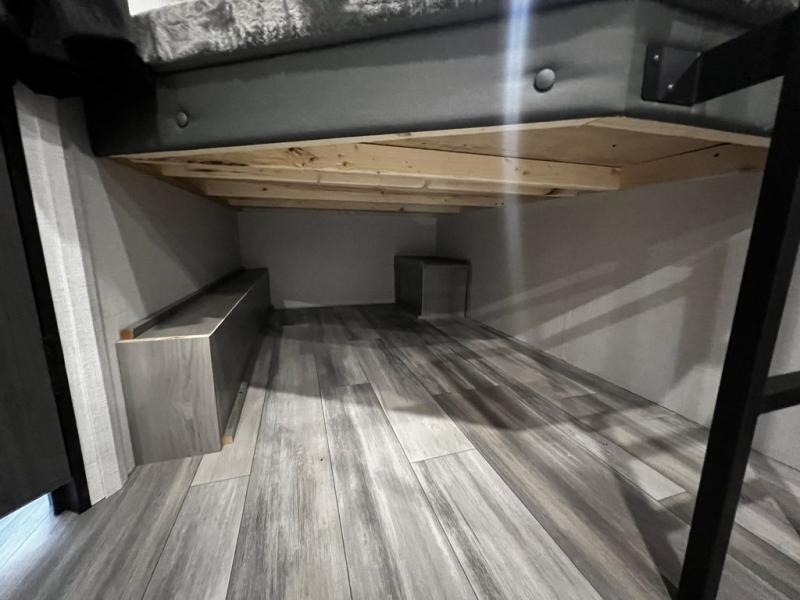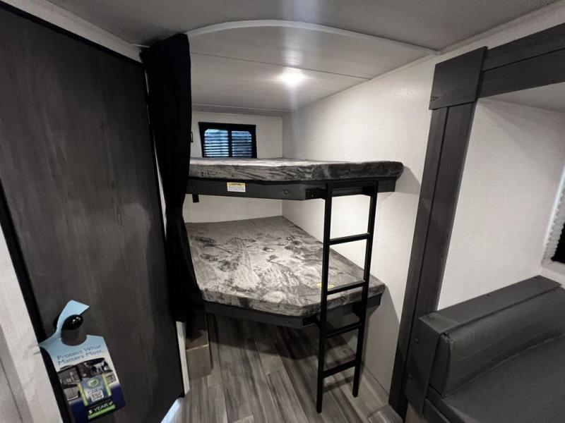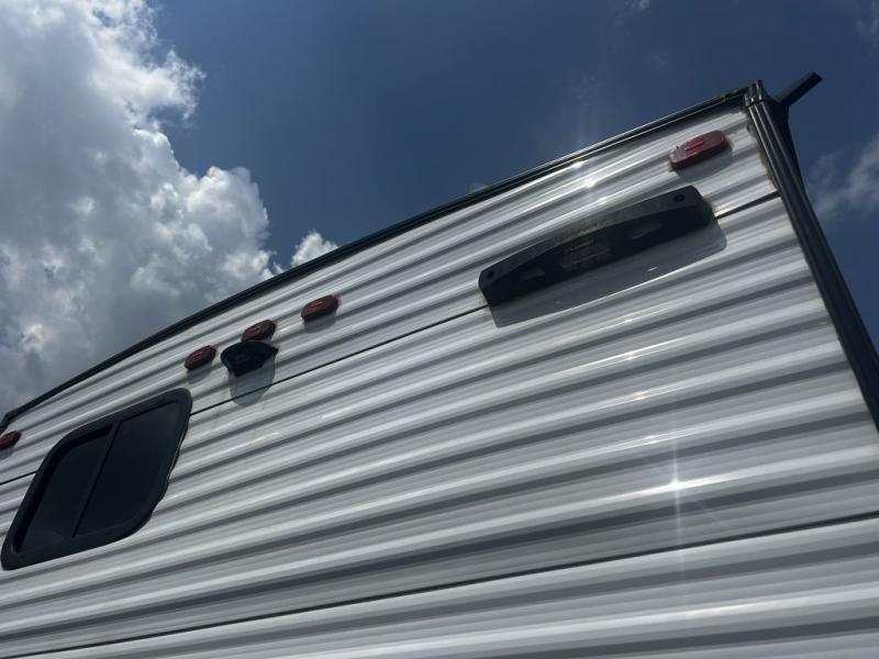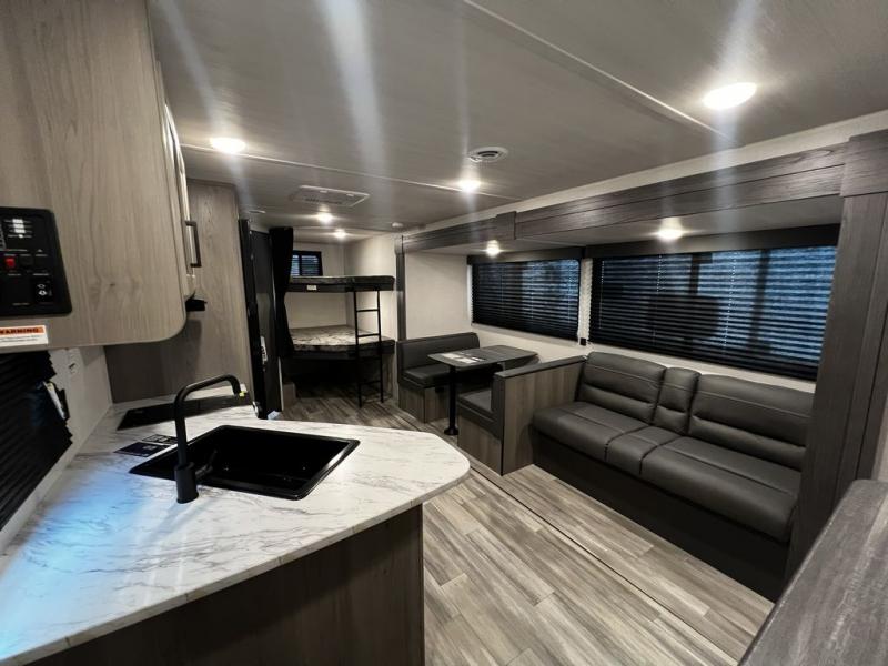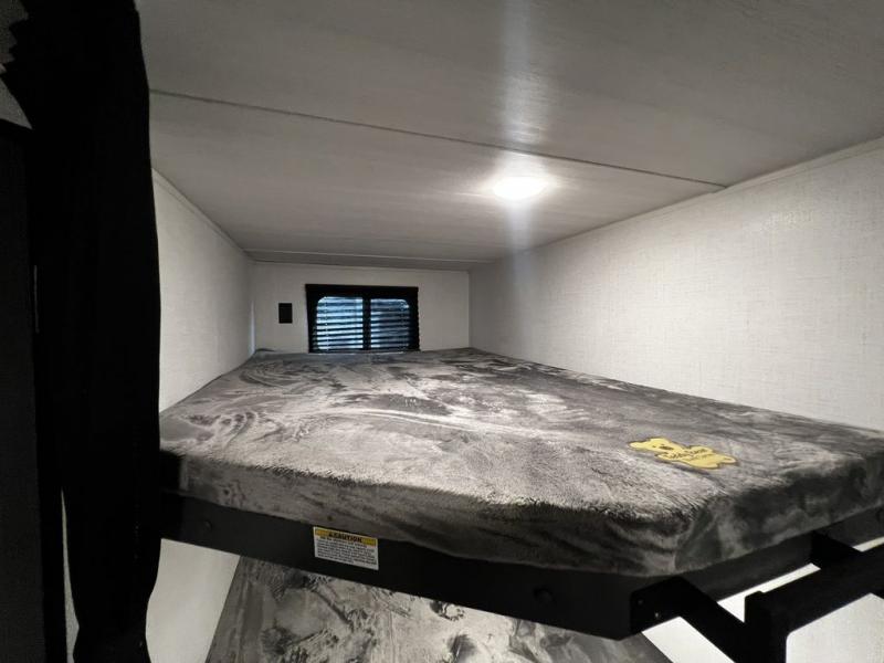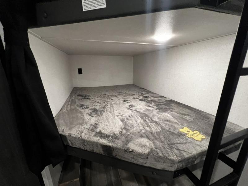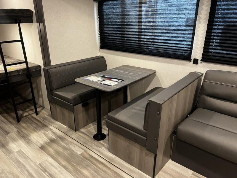 Pack your bags and head for the lake or woods in this spacious trailer! You can comfortably sleep nine to ten with the double-size bunks and the queen bed in the front private bedroom, plus the booth dinette and sofa in the main living area. There is even TV prep here if you want to add a television to the entertainment center for movie nights. The kitchen includes a 10 cu. ft. 12V refrigerator and an extra large pantry for food storage, plus a two burner cooktop to prepare meals each day. The full bath included will let you clean up after a day of exploring outdoors, and you'll find the second entry door here for convenience!