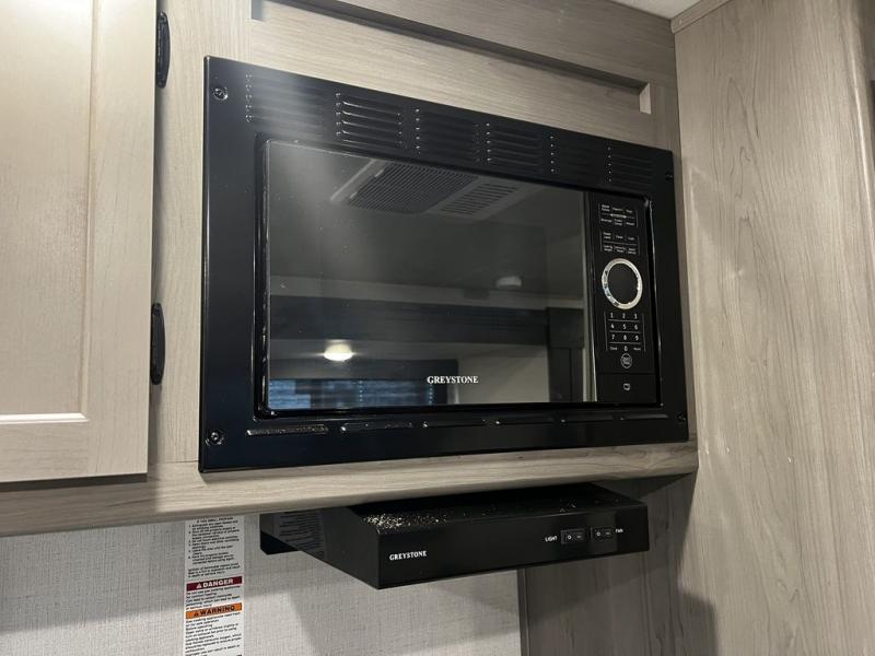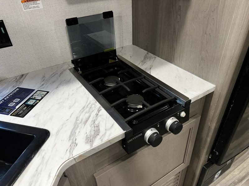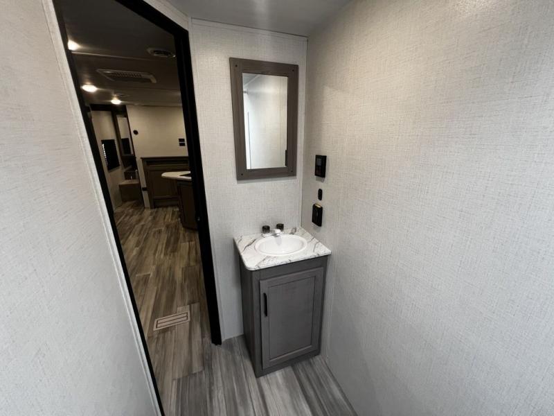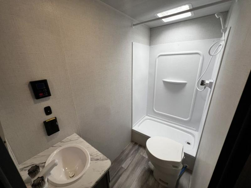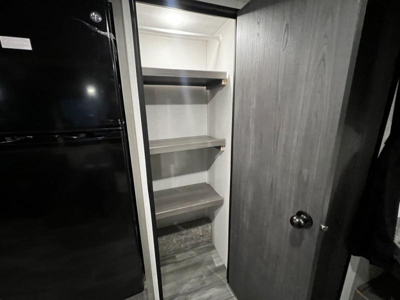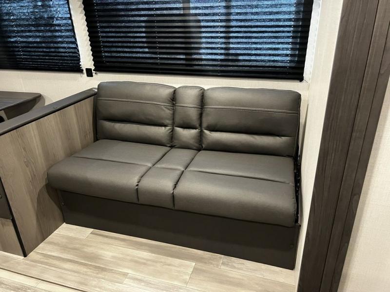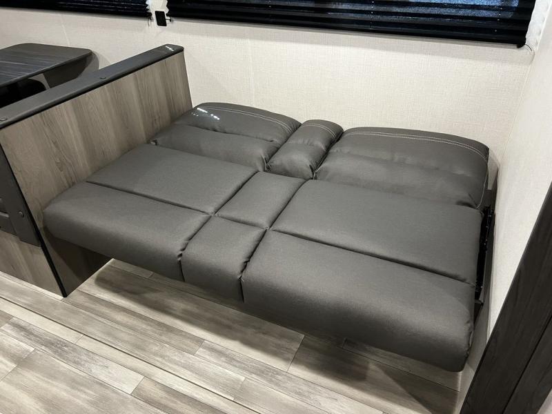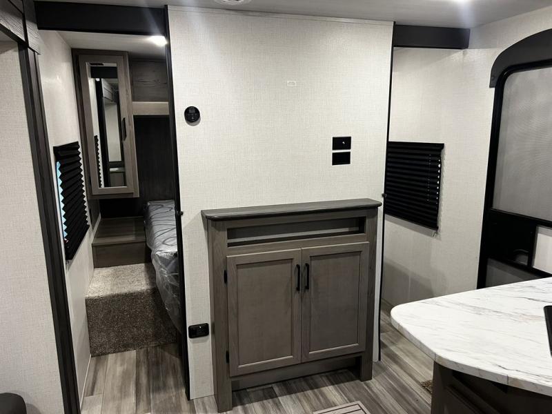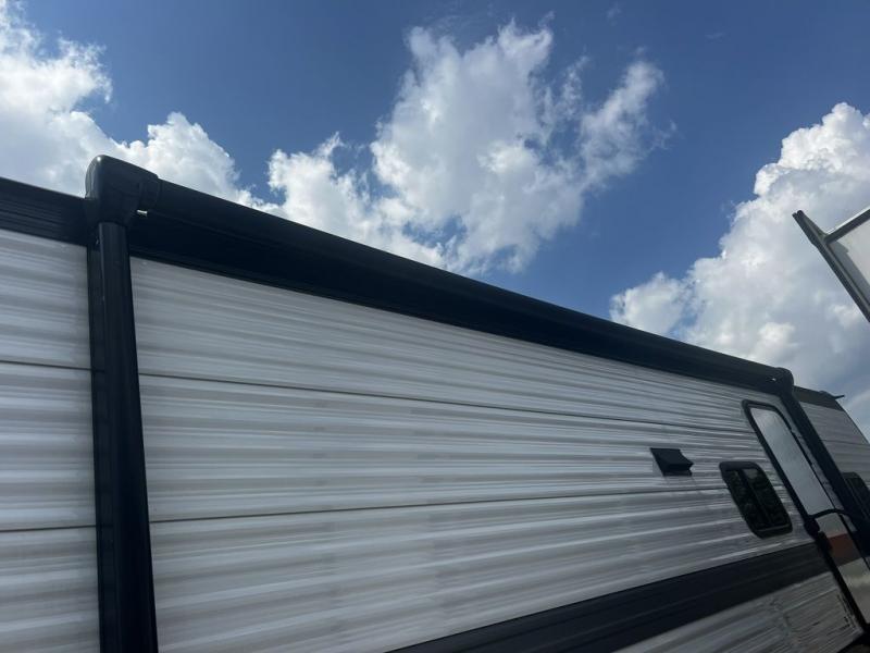 Pack your bags and head for the lake or woods in this spacious trailer! You can comfortably sleep nine to ten with the double-size bunks and the queen bed in the front private bedroom, plus the booth dinette and sofa in the main living area. There is even TV prep here if you want to add a television to the entertainment center for movie nights. The kitchen includes a 10 cu. ft. 12V refrigerator and an extra large pantry for food storage, plus a two burner cooktop to prepare meals each day. The full bath included will let you clean up after a day of exploring outdoors, and you'll find the second entry door here for convenience!