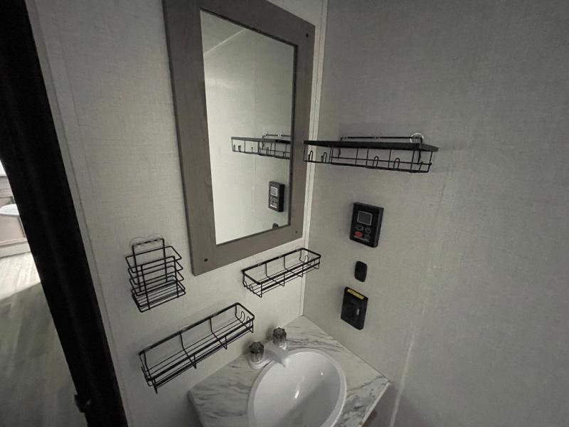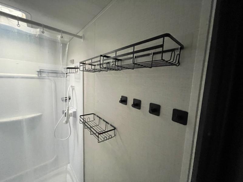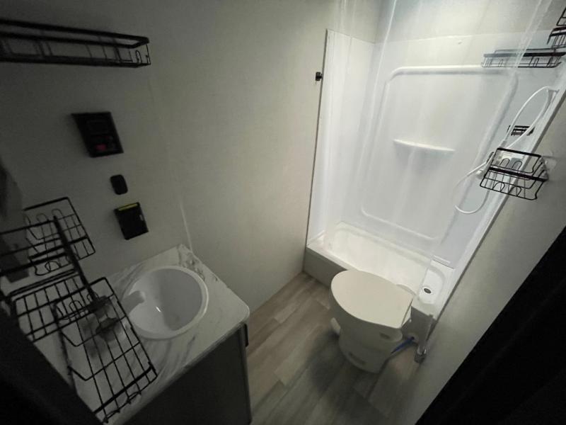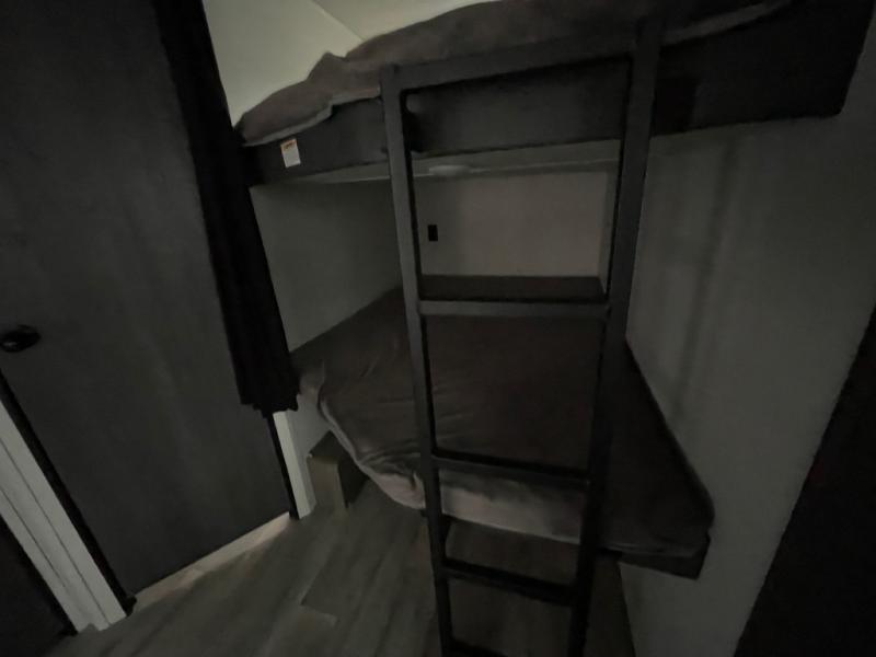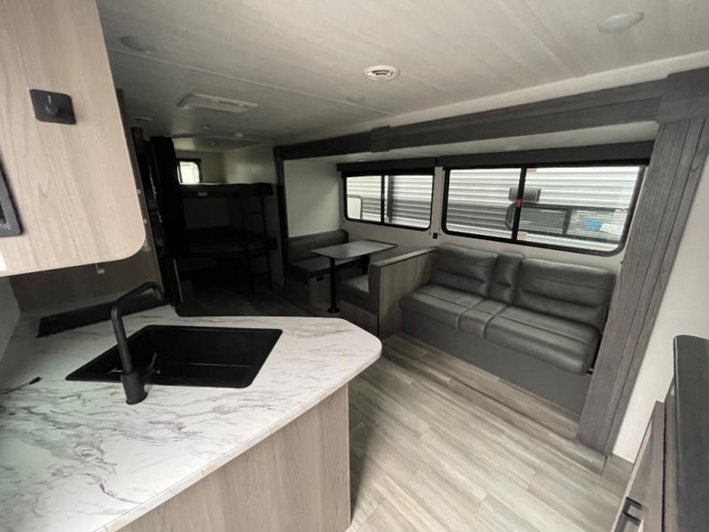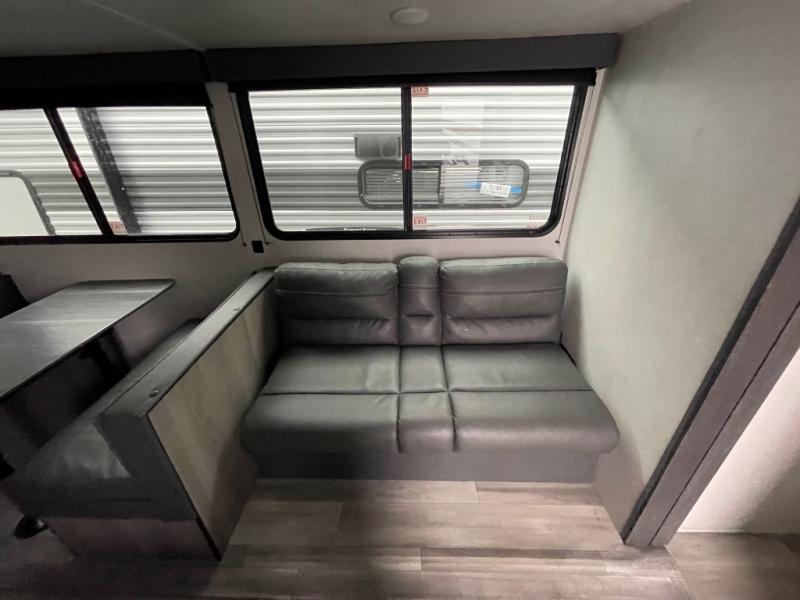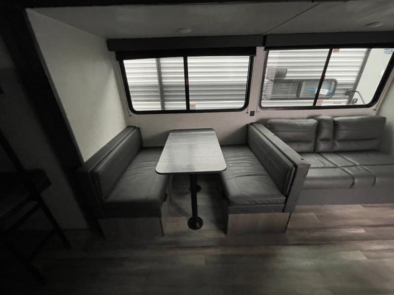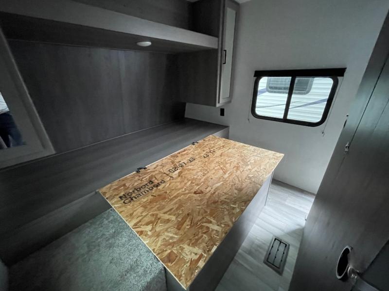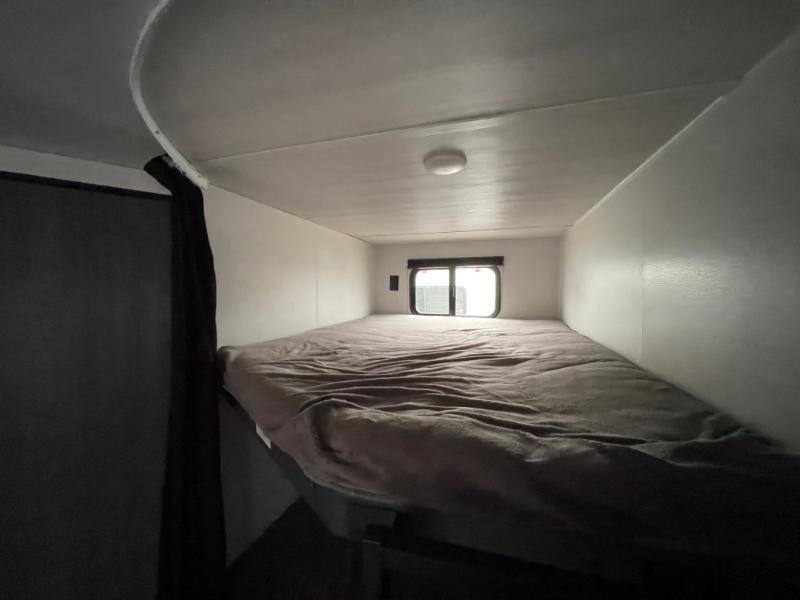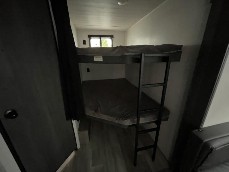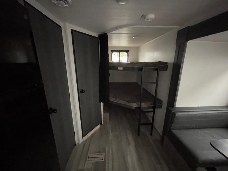 Pack your bags and head for the lake or woods in this spacious trailer! You can comfortably sleep nine to ten with the double-size bunks and the queen bed in the front private bedroom, plus the booth dinette and sofa in the main living area. There is even TV prep here if you want to add a television to the entertainment center for movie nights. The kitchen includes a 10 cu. ft. 12V refrigerator and an extra large pantry for food storage, plus a two burner cooktop to prepare meals each day. The full bath included will let you clean up after a day of exploring outdoors, and you'll find the second entry door here for convenience!
