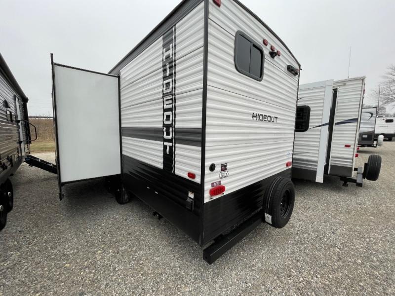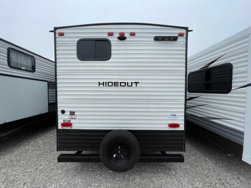 With any Hideout Sport travel trailer by Keystone you will enjoy simplified camping solutions that won't break the bank! Each model is constructed with a durable aluminum exterior, tinted safety glass windows, a walkable roof, and an I-beam frame. There are power tongue jacks and electric stabilizer jacks that will make it easier than ever to hitch up and go, and you can add the optional spare tire kit in case you have any unfortunate flats on the way to the campground. An XL entry assist handle will also provide convenience, along with a power awning that will provide much wanted shade during the day. You will feel right at home in a Hideout Sport with its stylish decor, blackout night shades, and cozy queen bed with storage underneath!