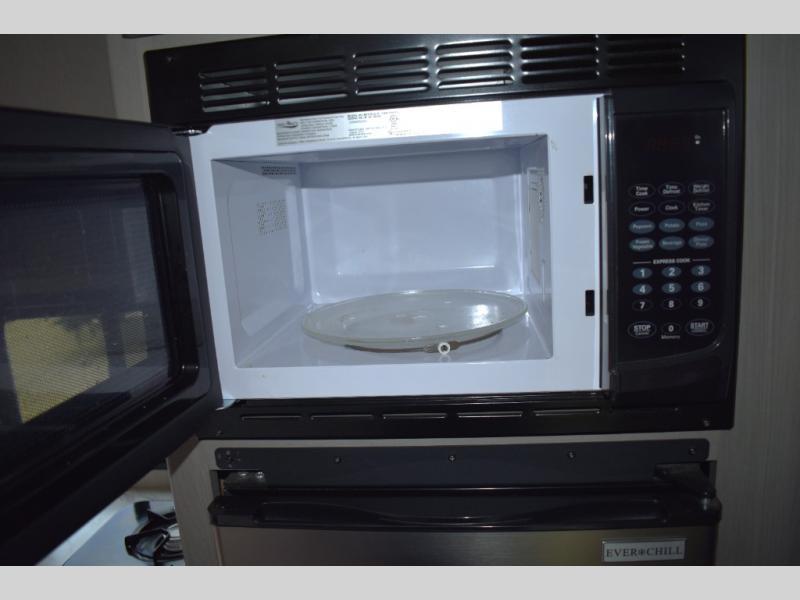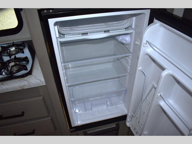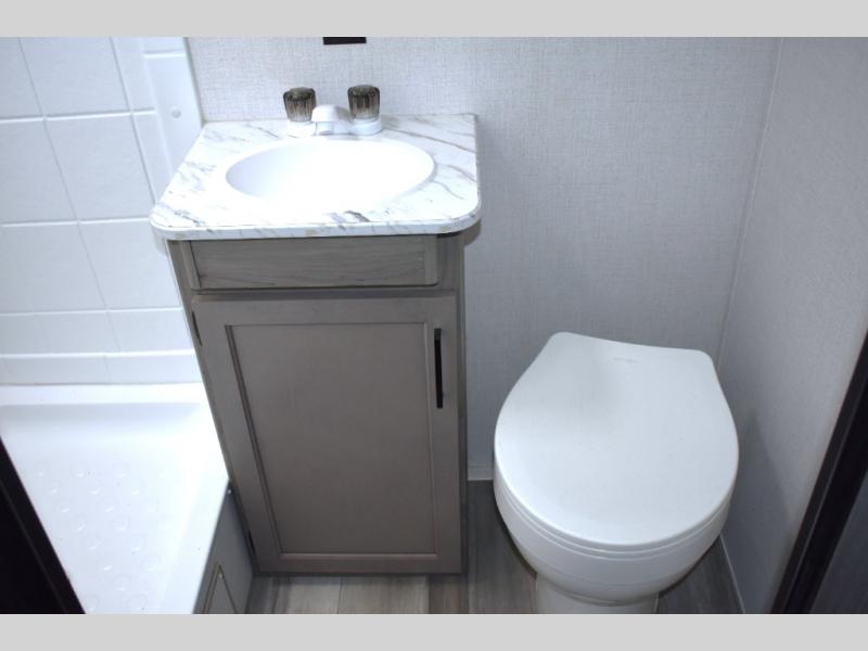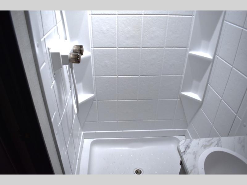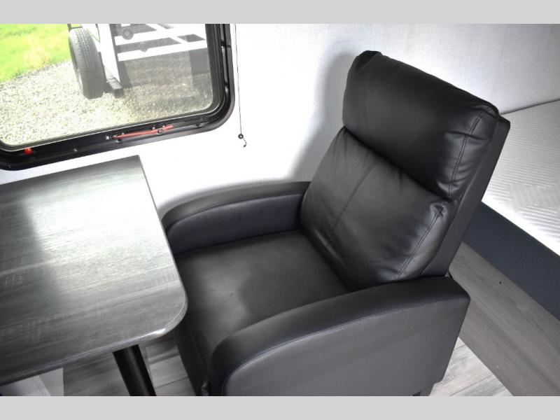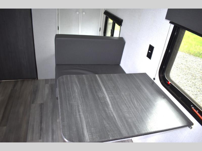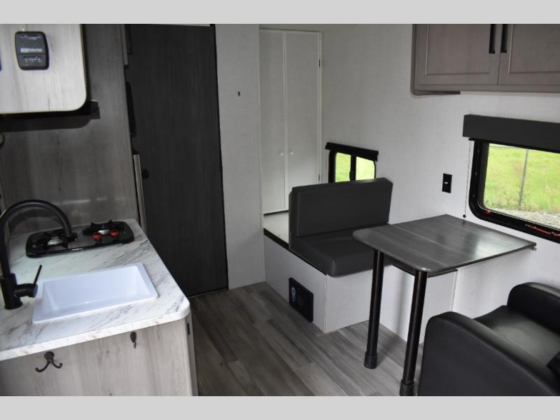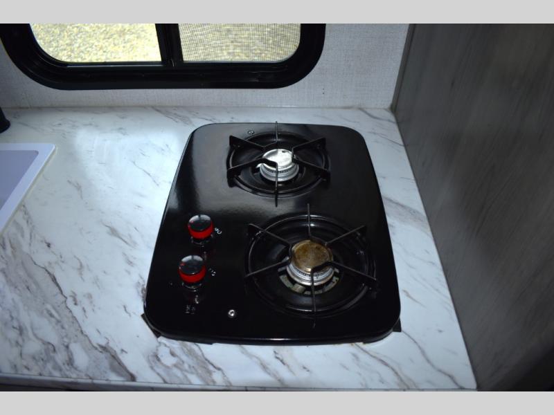 This trailer will fit perfectly for a group of five or less thanks to all the sleeping space! The owners will have a queen-size bed, and others can choose between the rear corner bunk beds or the booth dinette once set up for bedtime. There is a full bathroom for convenience when changing and getting cleaned up, a galley kitchen with a two burner cooktop plus a 3.3 cu. ft. refrigerator for the cold items. And you can stow your larger camping items in the exterior pass-through compartment.
