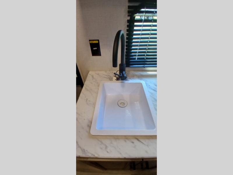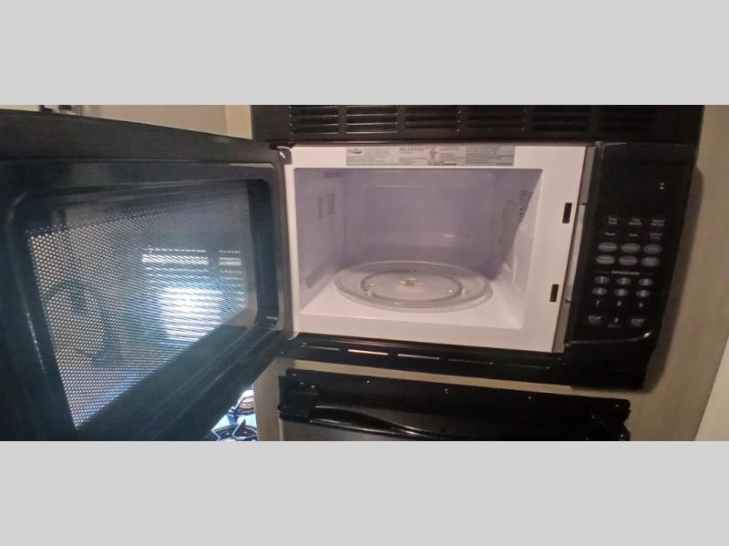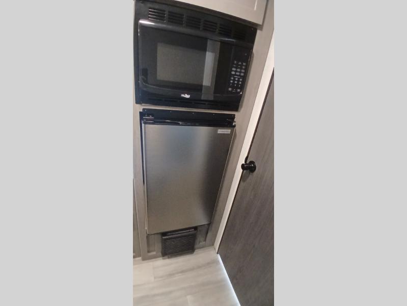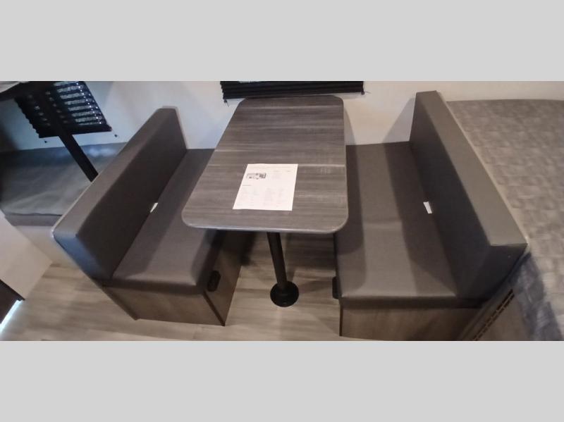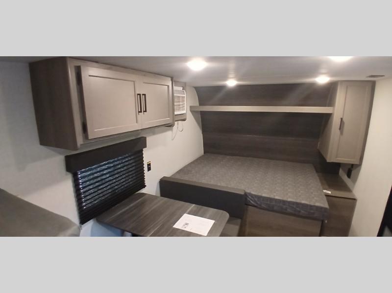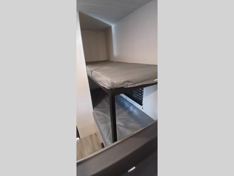 This trailer will fit perfectly for a group of five or less thanks to all the sleeping space! The owners will have a queen-size bed, and others can choose between the rear corner bunk beds or the booth dinette once set up for bedtime. There is a full bathroom for convenience when changing and getting cleaned up, a galley kitchen with a two burner cooktop plus a 3.3 cu. ft. refrigerator for the cold items. And you can stow your larger camping items in the exterior pass-through compartment.