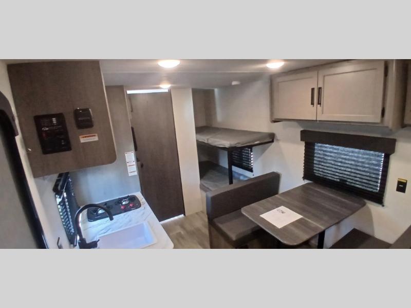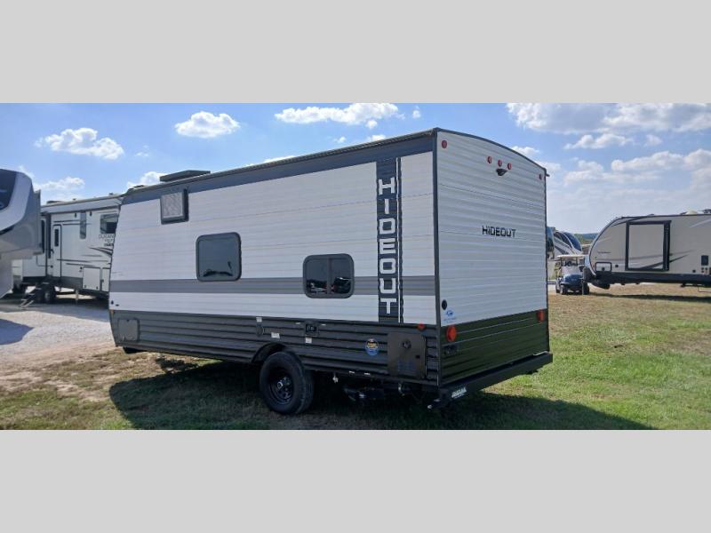 Open your horizons with the Hideout Sport Single Axle travel trailers by Keystone. They are compact, convenient, and lightweight; everything you're looking for in an RV! Each model features an aluminum exterior, tinted safety glass windows, and an I-beam frame with stamped steel cross-members and outriggers for added support. The interior includes blackout night shades for added privacy and real wood doors and drawers that will give a more at-home touch. The Girard tankless water heater is a feature you won't want to camp without, and the LED lighting will keep your space bright and open!