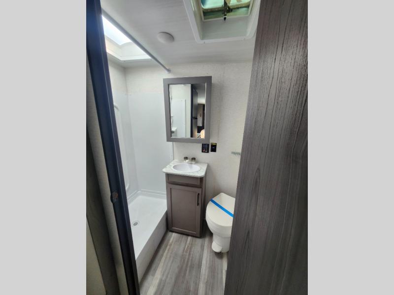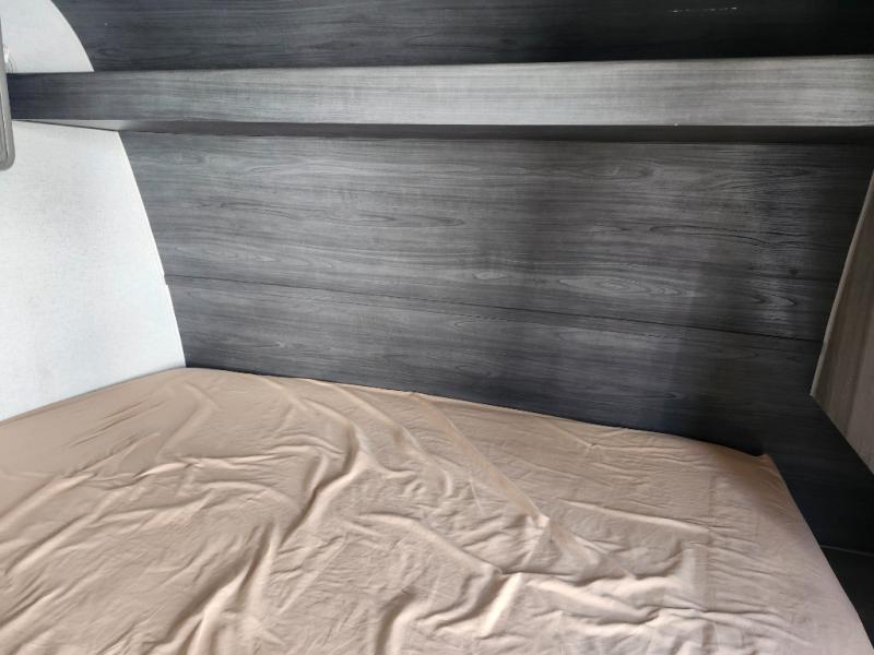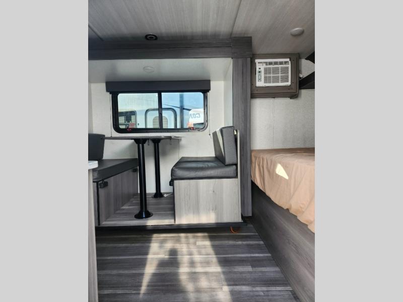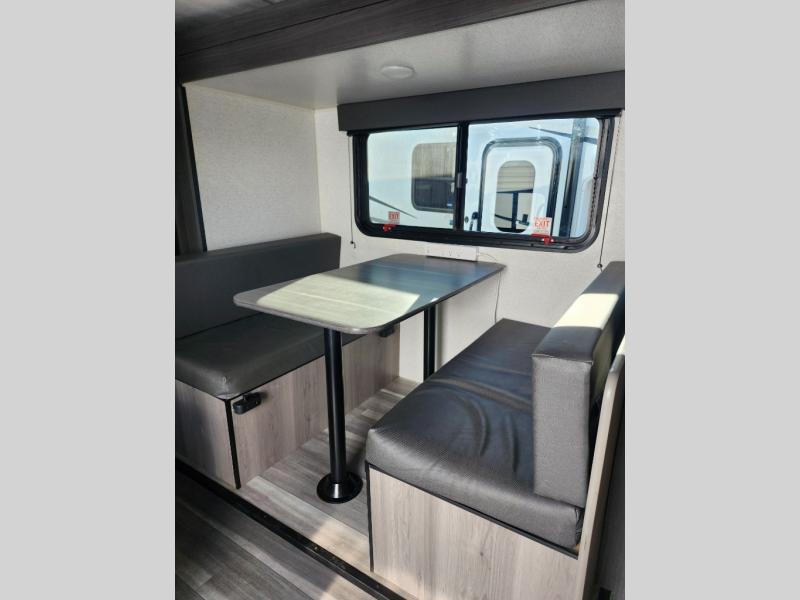 Step Inside this trailer where you can dine and relax on the slide out booth dinette which offers storage drawers below for your things. Everyone can take turns getting cleaned up in the full bathroom before falling asleep on the bunks, the queen-size bed or the booth dinette. The chef of your group will have a two burner cooktop to prepare meals and a 7.7 cu. ft. refrigerator for food storage. And the 10' power awning offers an outdoor living area protected from the elements once you add your camping chairs taken from the pass-through compartment.