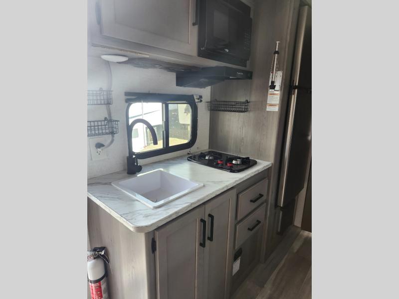 Open your horizons with the Hideout Sport Single Axle travel trailers by Keystone. They are compact, convenient, and lightweight; everything you're looking for in an RV! Each model features an aluminum exterior, tinted safety glass windows, and an I-beam frame with stamped steel cross-members and outriggers for added support. The interior includes blackout night shades for added privacy and real wood doors and drawers that will give a more at-home touch. The Girard tankless water heater is a feature you won't want to camp without, and the LED lighting will keep your space bright and open!