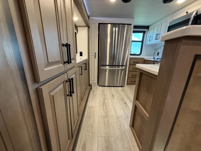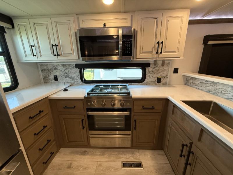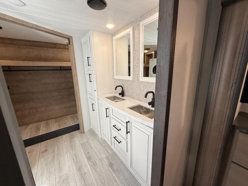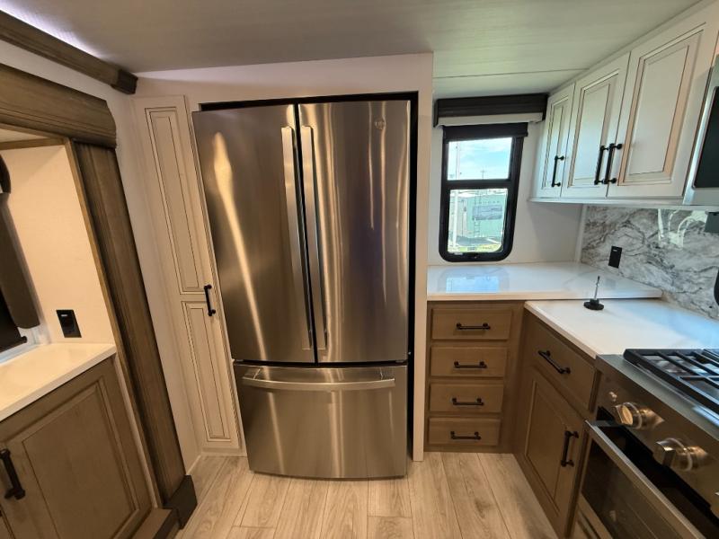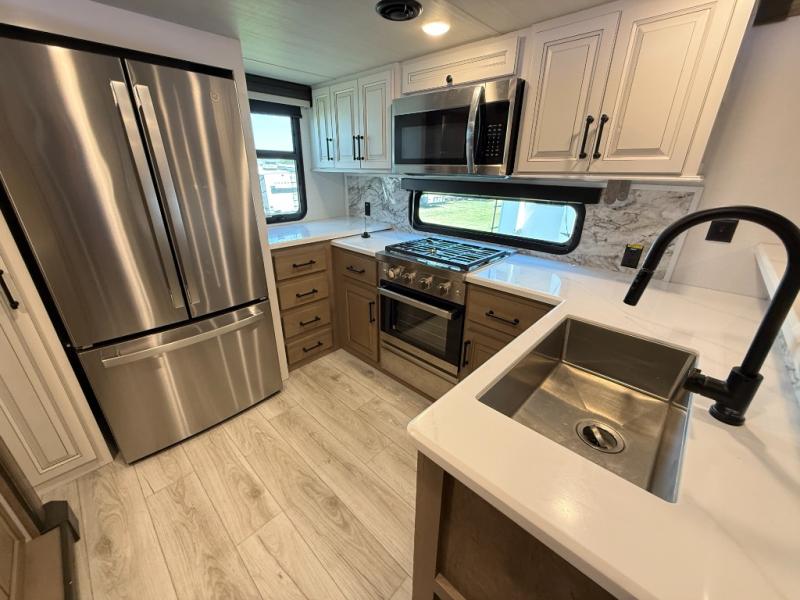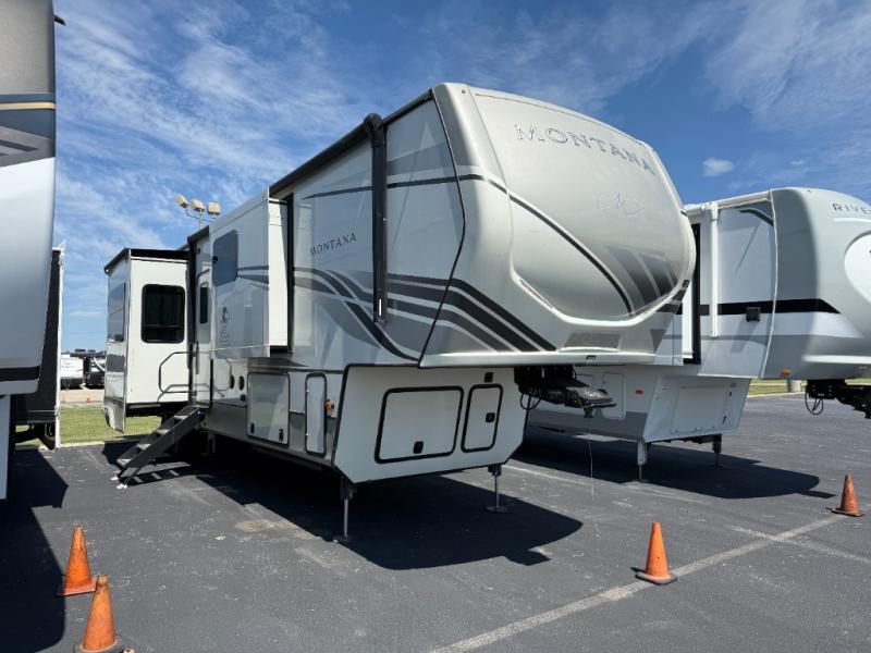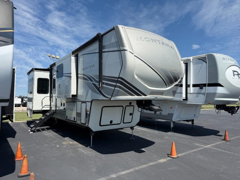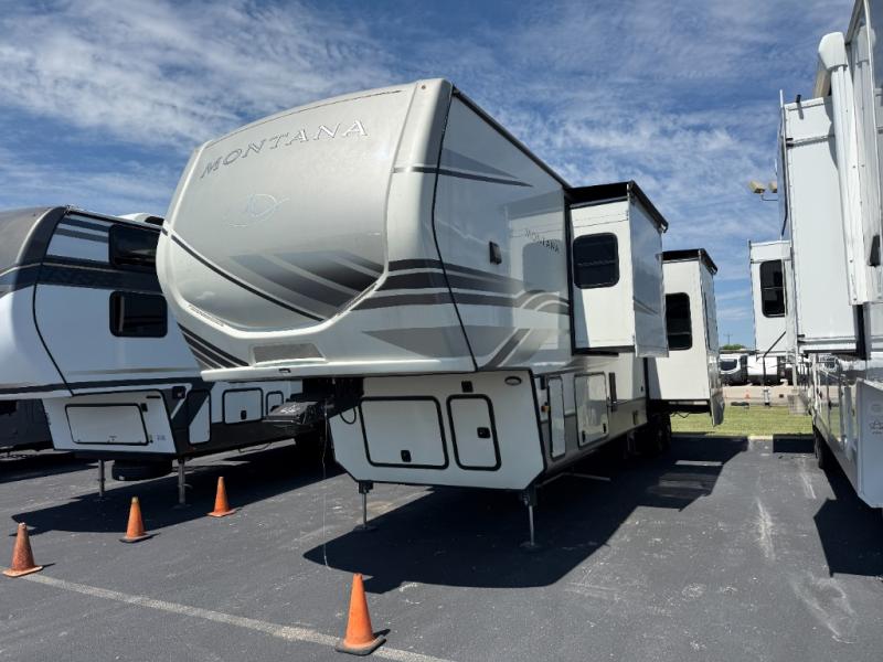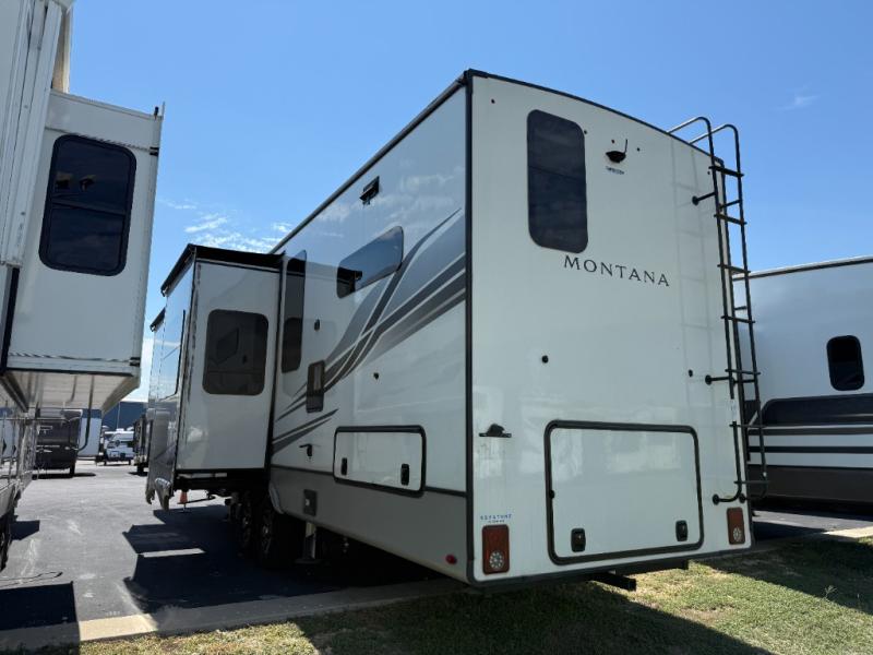 The perfect RV when you like to take "home"' with you when you travel! This Montana fifth wheel gives you the space you want and it feels like home with plenty of features to love and keep you comfortable when you are out enjoying your adventures. Five slides in total give each space plenty of room, the raised rear kitchen has everything you need to cook up meals and snacks just like at home. An 18 cu. ft. residential refrigerator with an ice maker, convection microwave oven and large sink, plus pantry space will make any chef happy. The mid-coach space just inside the door features a living room and half bath for convenience. There is also a dining table and four chairs within the roadside slide. Step up in front through a sliding barn door to a double slide space with a king bed and dresser. A second sliding barn door leads into the front spacious master bath featuring dual sinks, a 48" x 30" shower, and a large walk-in wardrobe with washer and dryer prep!