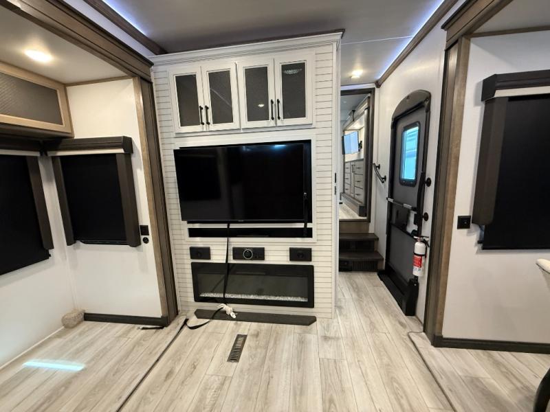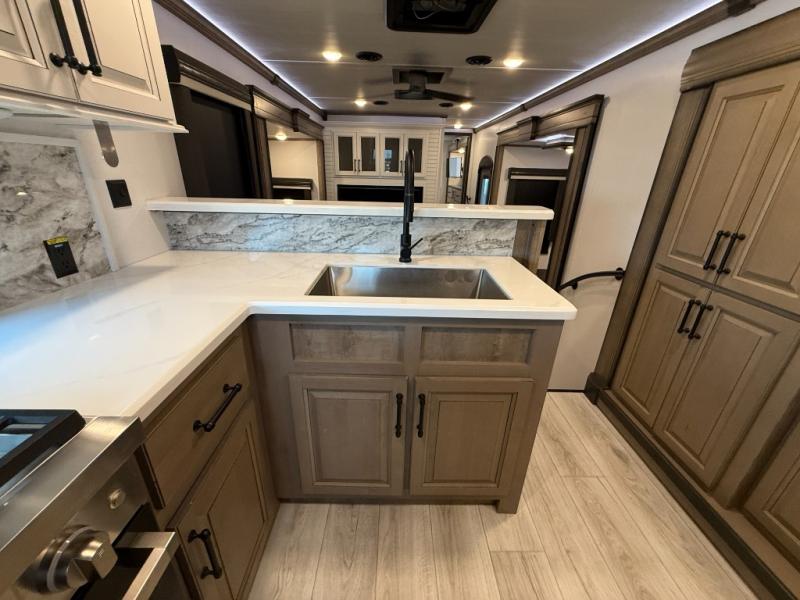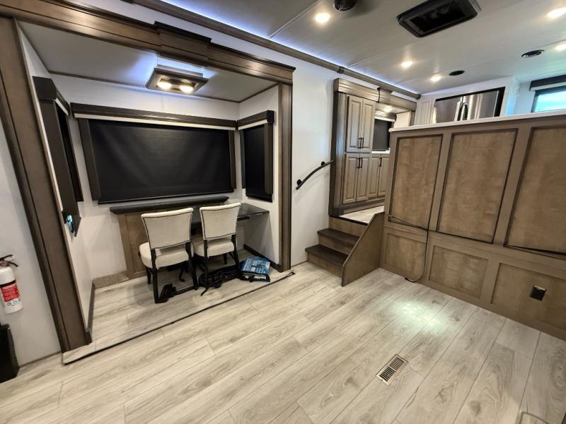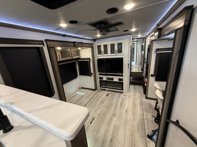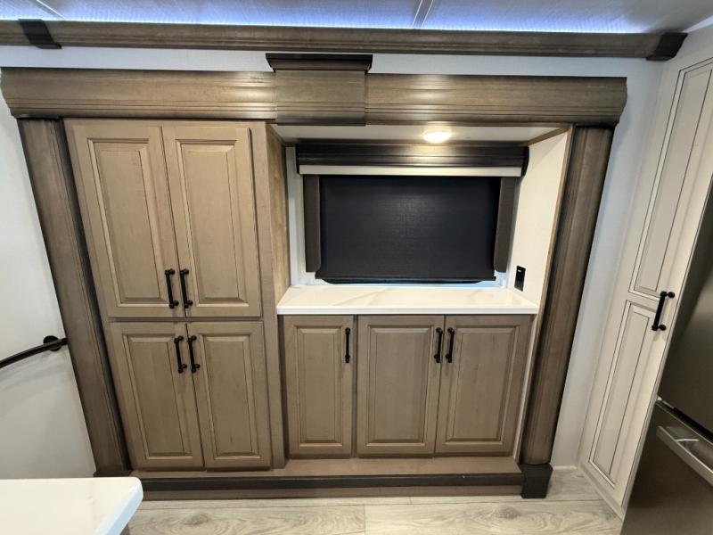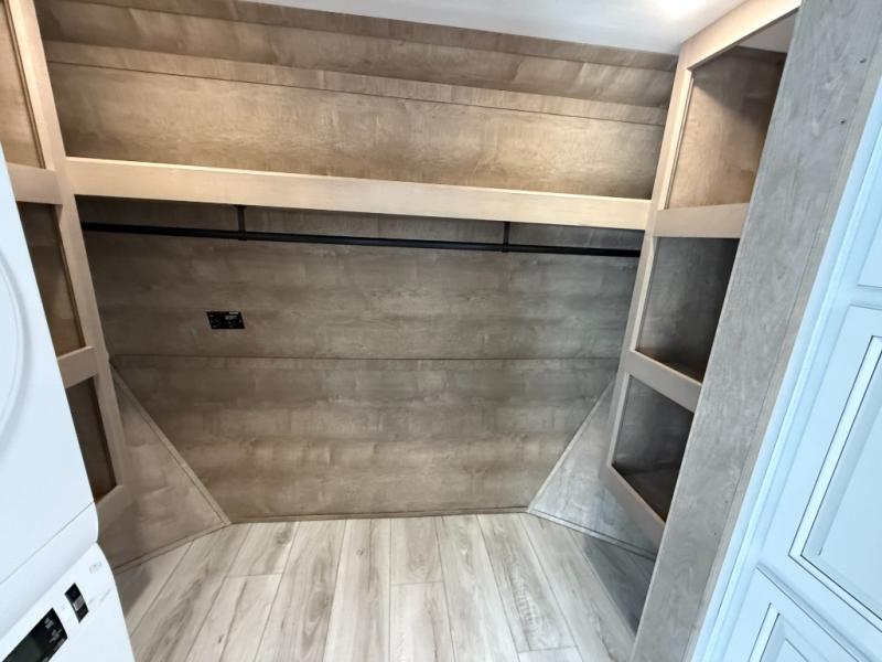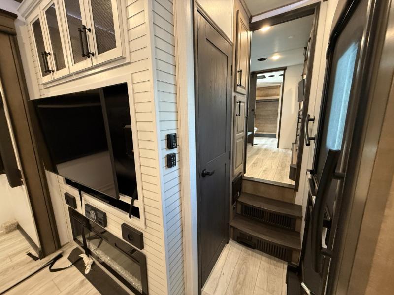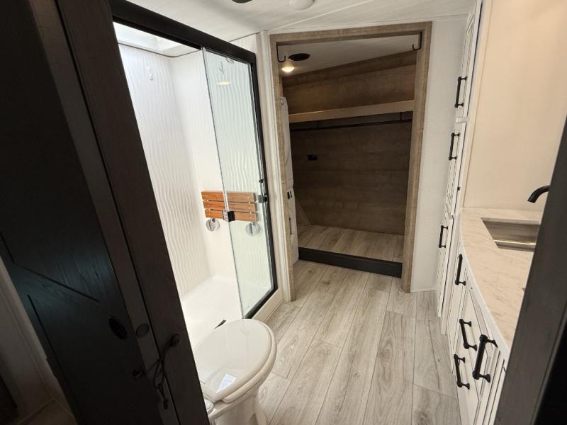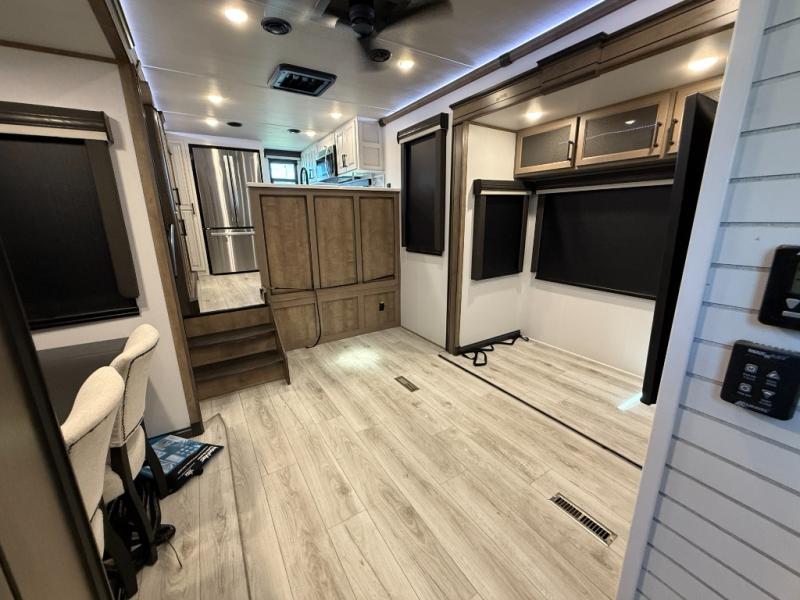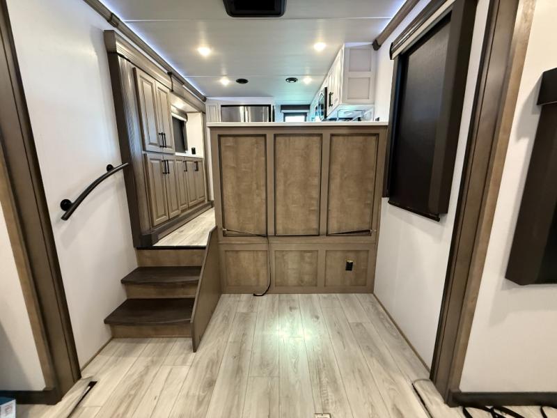 The perfect RV when you like to take "home"' with you when you travel! This Montana fifth wheel gives you the space you want and it feels like home with plenty of features to love and keep you comfortable when you are out enjoying your adventures. Five slides in total give each space plenty of room, the raised rear kitchen has everything you need to cook up meals and snacks just like at home. An 18 cu. ft. residential refrigerator with an ice maker, convection microwave oven and large sink, plus pantry space will make any chef happy. The mid-coach space just inside the door features a living room and half bath for convenience. There is also a dining table and four chairs within the roadside slide. Step up in front through a sliding barn door to a double slide space with a king bed and dresser. A second sliding barn door leads into the front spacious master bath featuring dual sinks, a 48" x 30" shower, and a large walk-in wardrobe with washer and dryer prep!