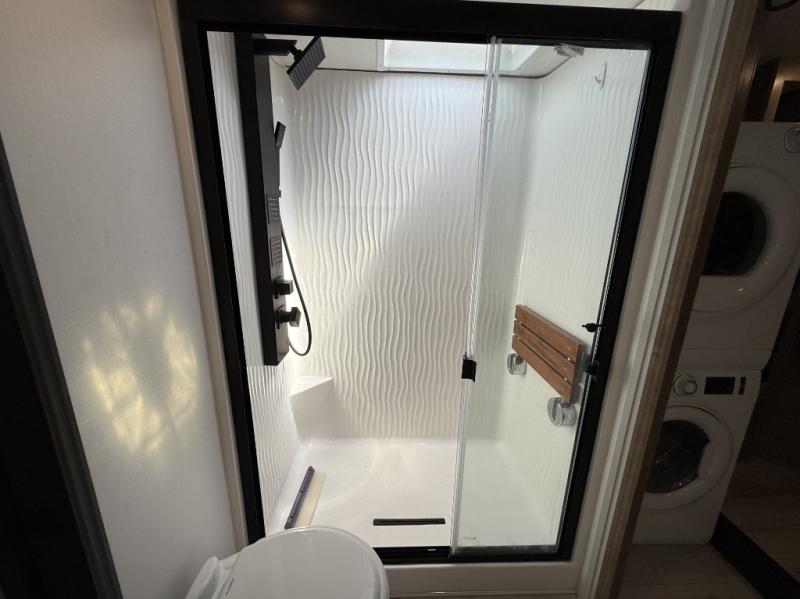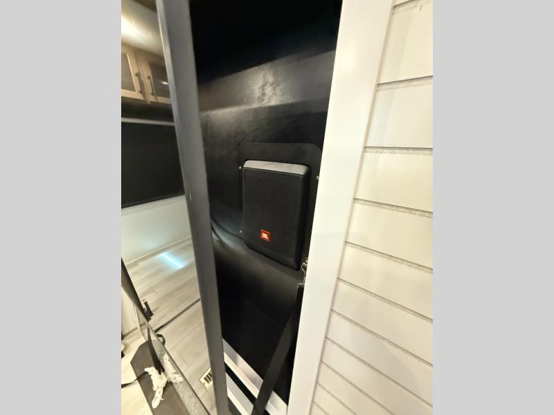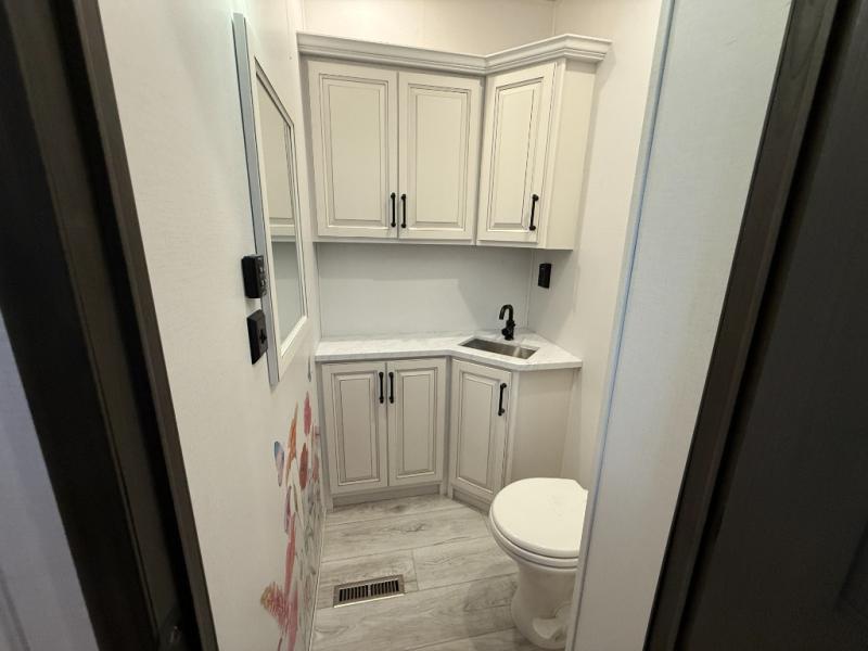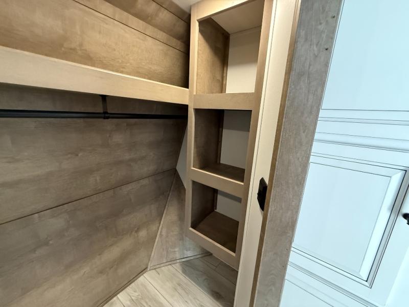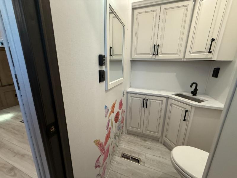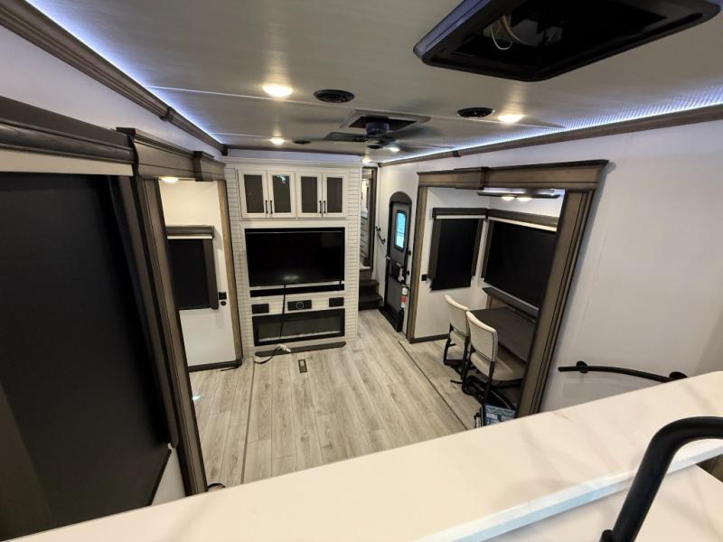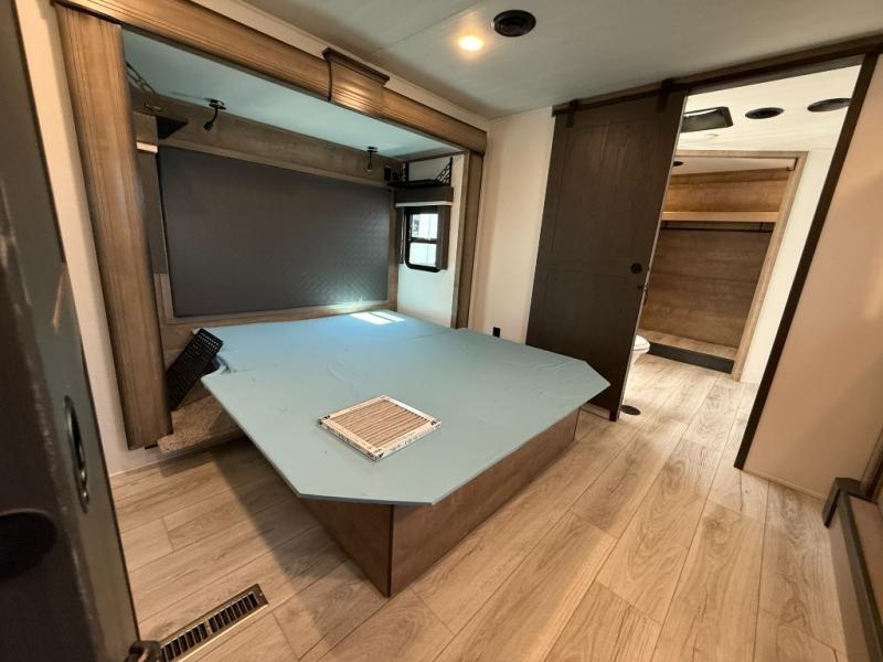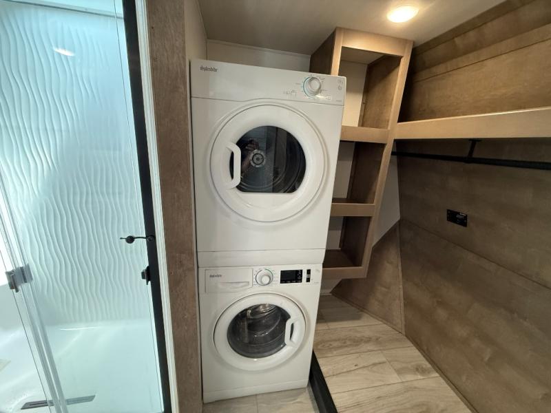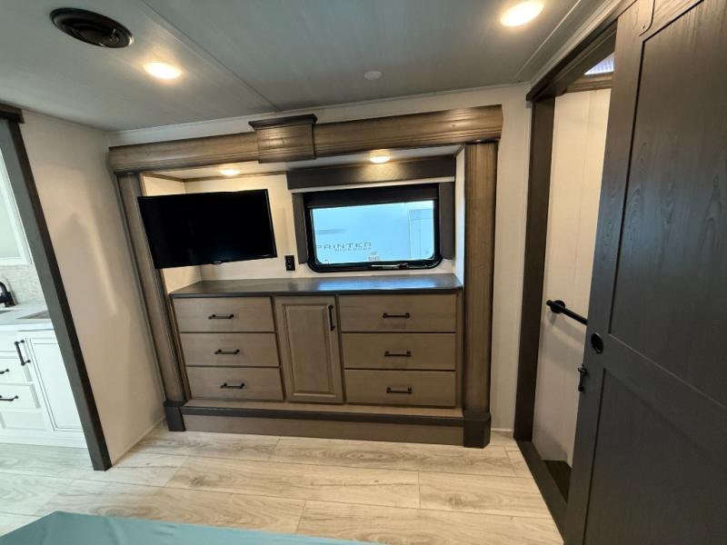 The perfect RV when you like to take "home"' with you when you travel! This Montana fifth wheel gives you the space you want and it feels like home with plenty of features to love and keep you comfortable when you are out enjoying your adventures. Five slides in total give each space plenty of room, the raised rear kitchen has everything you need to cook up meals and snacks just like at home. An 18 cu. ft. residential refrigerator with an ice maker, convection microwave oven and large sink, plus pantry space will make any chef happy. The mid-coach space just inside the door features a living room and half bath for convenience. There is also a dining table and four chairs within the roadside slide. Step up in front through a sliding barn door to a double slide space with a king bed and dresser. A second sliding barn door leads into the front spacious master bath featuring dual sinks, a 48" x 30" shower, and a large walk-in wardrobe with washer and dryer prep!
