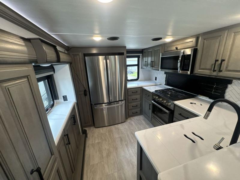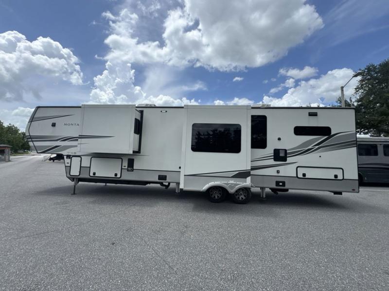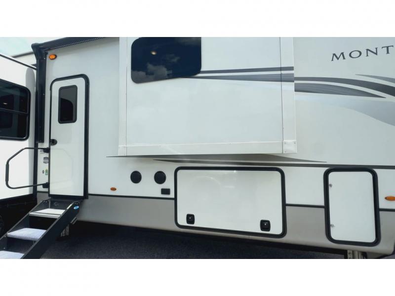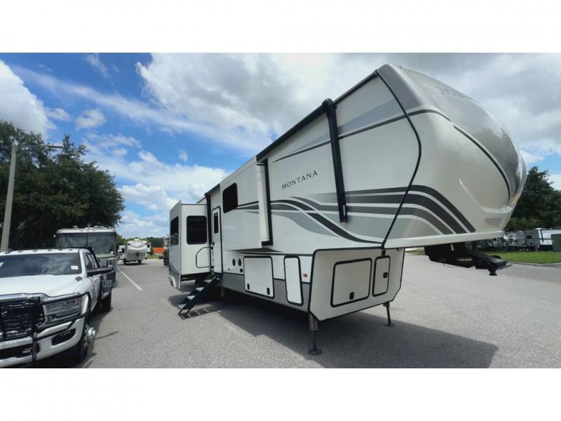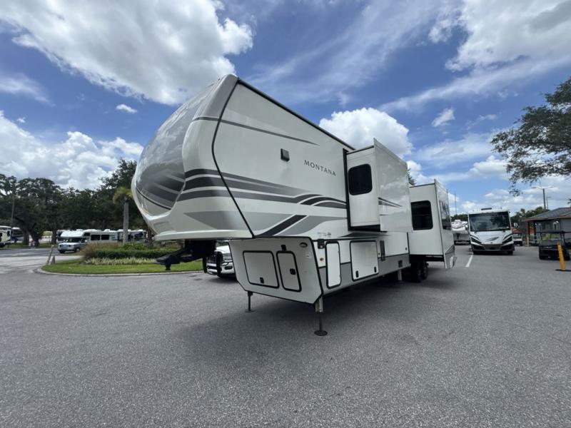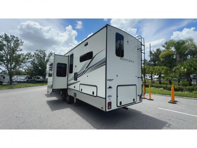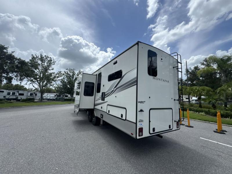 The perfect RV when you like to take "home"' with you when you travel! This Montana fifth wheel gives you the space you want and it feels like home with plenty of features to love and keep you comfortable when you are out enjoying your adventures. Five slides in total give each space plenty of room, the raised rear kitchen has everything you need to cook up meals and snacks just like at home. An 18 cu. ft. residential refrigerator with an ice maker, convection microwave oven and large sink, plus pantry space will make any chef happy. The mid-coach space just inside the door features a living room and half bath for convenience. There is also a dining table and four chairs within the roadside slide. Step up in front through a sliding barn door to a double slide space with a king bed and dresser. A second sliding barn door leads into the front spacious master bath featuring dual sinks, a 48" x 30" shower, and a large walk-in wardrobe with washer and dryer prep!