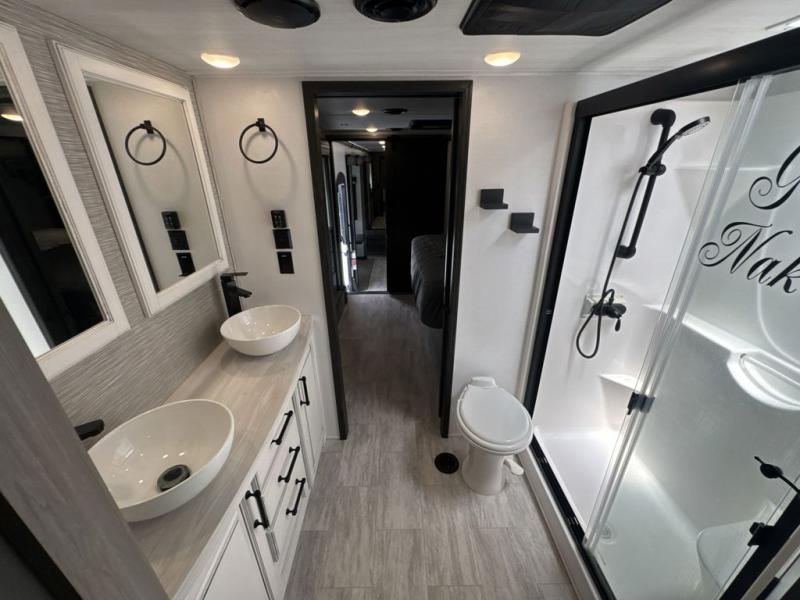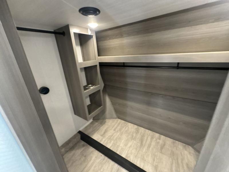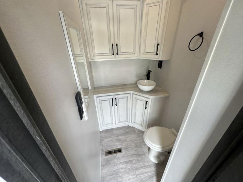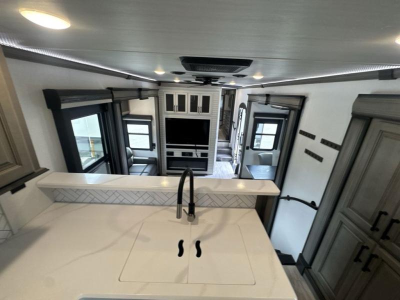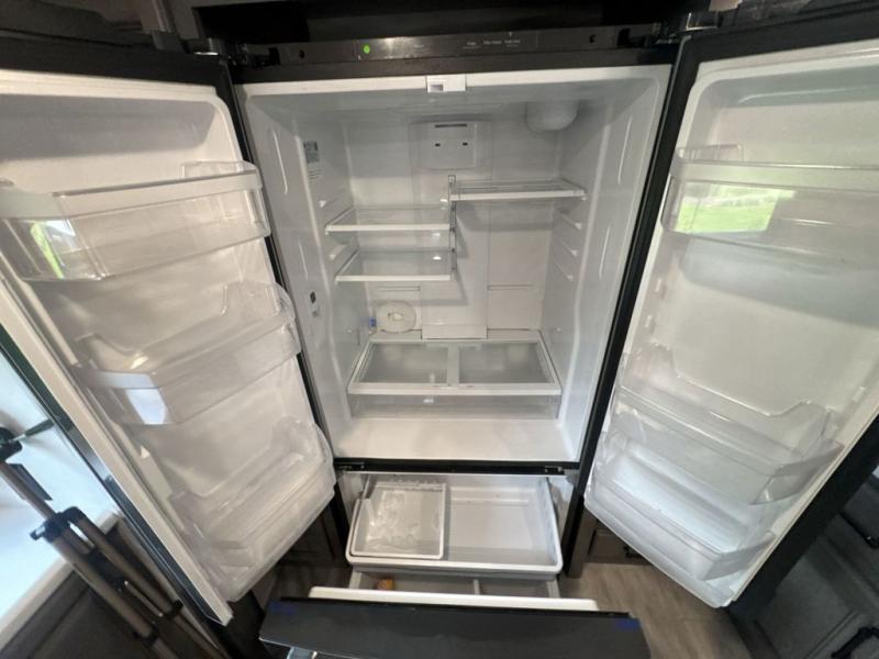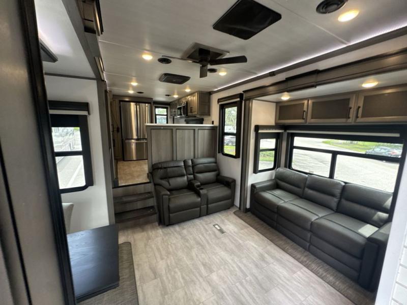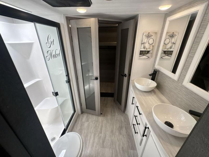 The perfect RV when you like to take "home"' with you when you travel! This Montana fifth wheel gives you the space you want and it feels like home with plenty of features to love and keep you comfortable when you are out enjoying your adventures. Five slides in total give each space plenty of room, the raised rear kitchen has everything you need to cook up meals and snacks just like at home. An 18 cu. ft. residential refrigerator with an ice maker, convection microwave oven and large sink, plus pantry space will make any chef happy. The mid-coach space just inside the door features a living room and half bath for convenience. There is also a dining table and four chairs within the roadside slide. Step up in front through a sliding barn door to a double slide space with a king bed and dresser. A second sliding barn door leads into the front spacious master bath featuring dual sinks, a 48" x 30" shower, and a large walk-in wardrobe with washer and dryer prep!