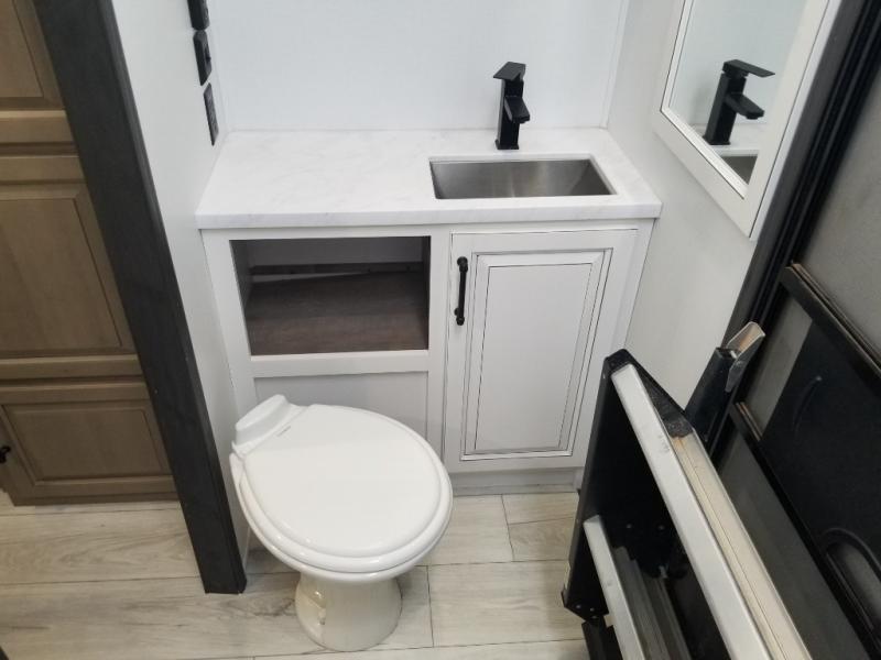Traveling with friends and family is easier than ever with this fifth wheel in tow! There are two master suites; one for you and one for guests! The front master suite includes a king bed slide out, a front closet with a hamper, plus stackable washer/dryer prep if you want the option to make wash day easier. There is also convenient underbed storage, a dresser with a Smart HD TV, plus a private entrance into the dual entry bath. Head to the rear master suite to find just as much comfort with a queen bed slide out, dual closets and a dresser, plus a full rear bath where the second entry door is located. There is also a loft area above this room with three bunk mats so two more tired campers can sleep! The middle kitchen and living area includes many comforts, like the power theater seating across from the 50" Smart TV and hide-a-bed sofa, plus the U-shaped kitchen with ample counter space and a 24" range. You'll also find food storage in the pantry and 18 cu. ft. residential refrigerator with an ice maker, or you can choose the slightly larger 20 cu. ft. refrigerator!