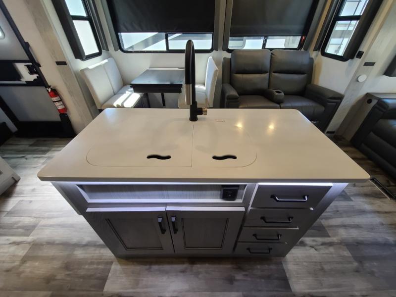 You can take this Montana High Country fifth wheel to the campsite of your choice! You'll have plenty of comfort with the king-size bed in the front master suite, and you can also let some friends or kids sleep on the hide-a-bed sofa in the rear living area. While you watch the 50" LCD TV, you can sit back in the power theater seating, and you can switch on the fireplace for some added heat if it's cool outside. The opposing slides in the main living area are what give you extra space to work freely around the kitchen island, and the coffee station allows you to prepare your afternoon pick-me-up with all of your coffee essentials sitting in one place just like at home.